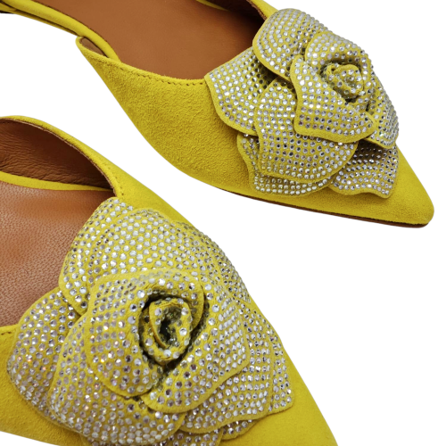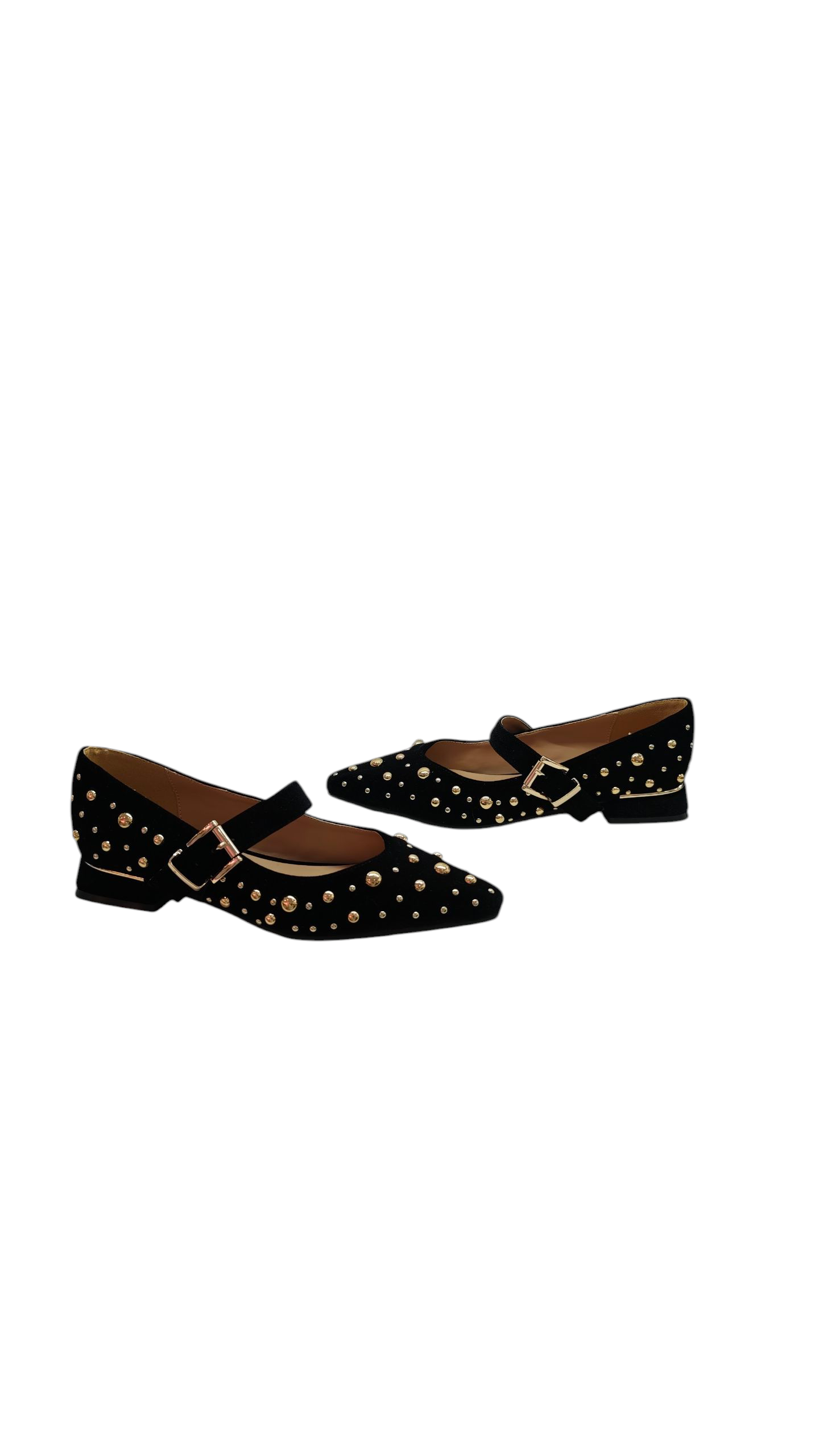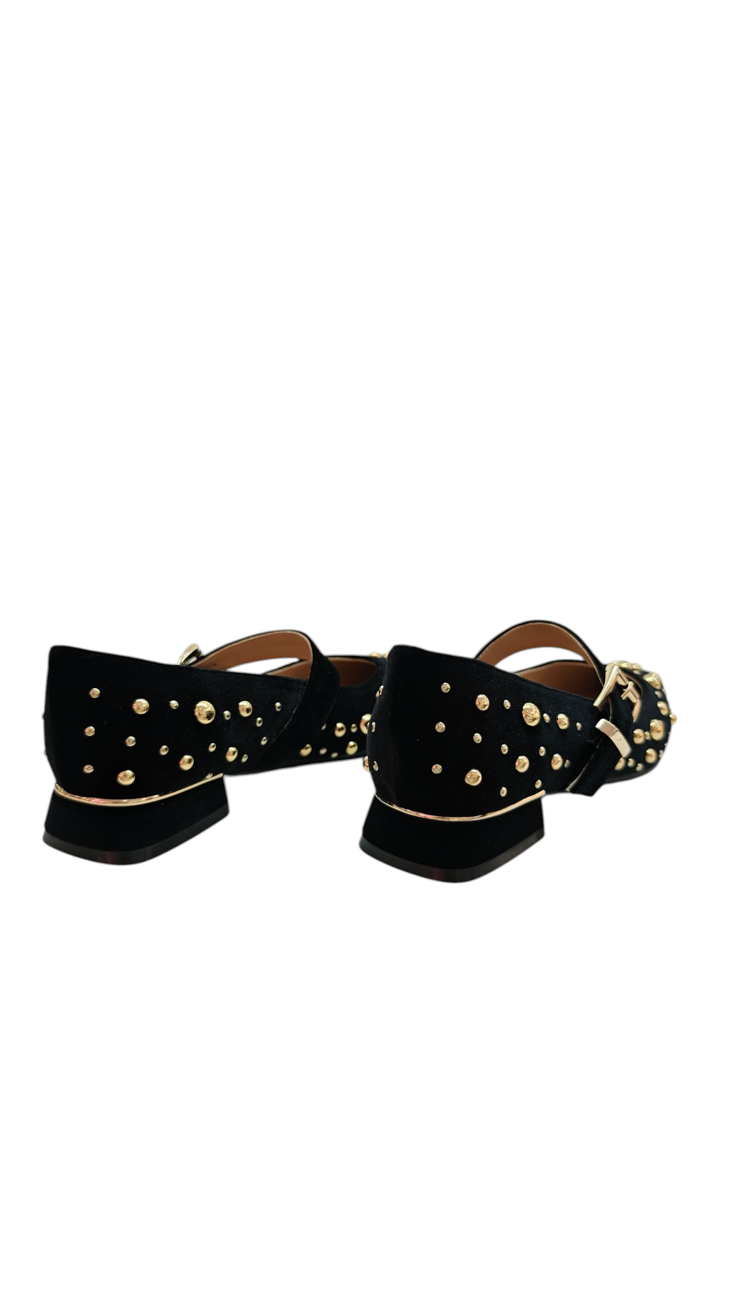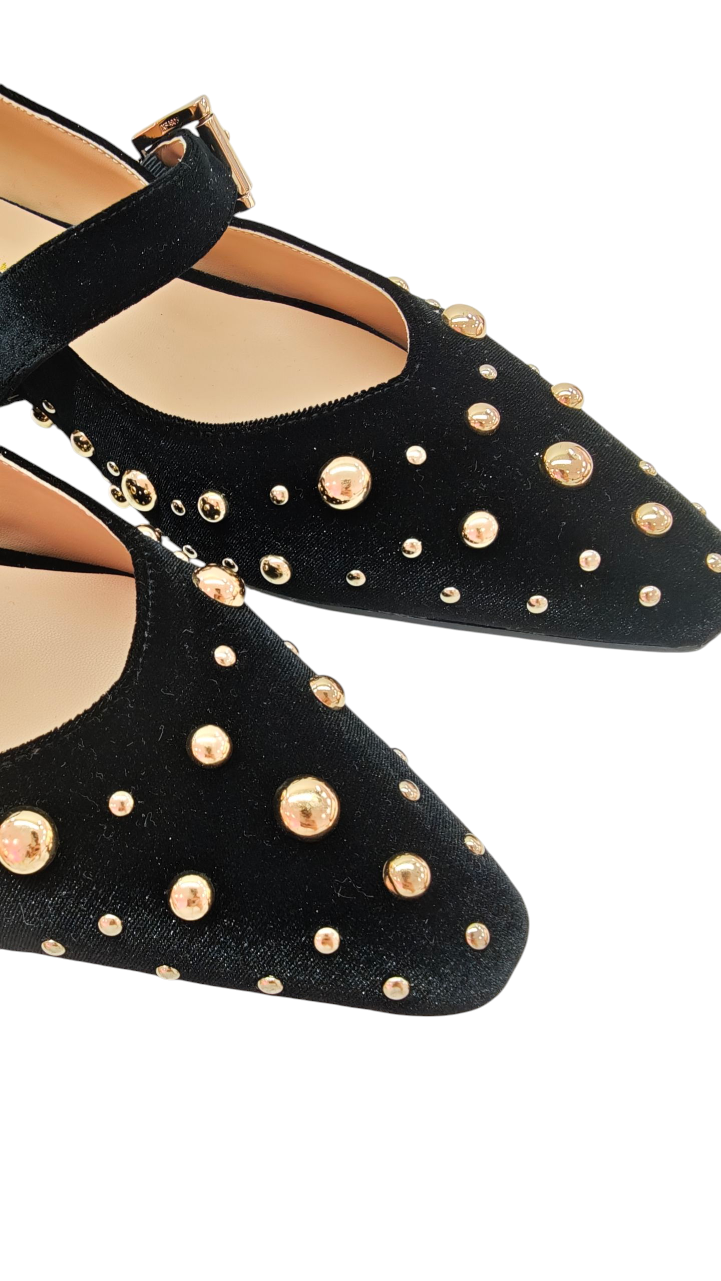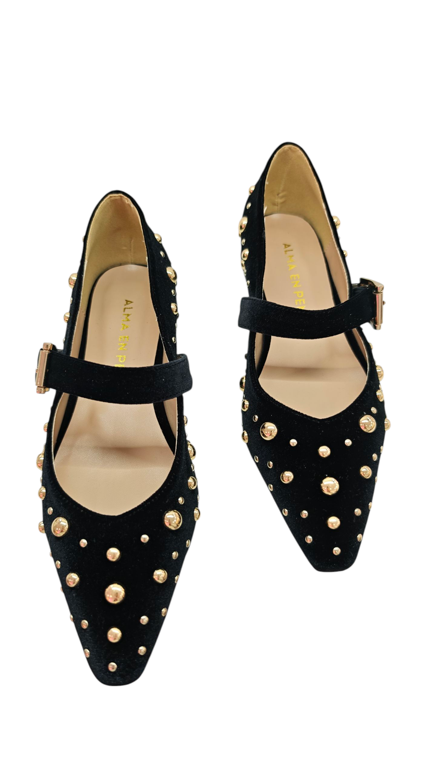 Un zapato que grita sofisticación en cada paso. Su terciopelo con borlas oro desprende lujo y calidez, mientras que la maxi hebilla joya lo convierte en la estrella de cualquier look. Ideal para elevar un outfit básico o acompañar tus estilismos más chic sin necesidad de tacón.