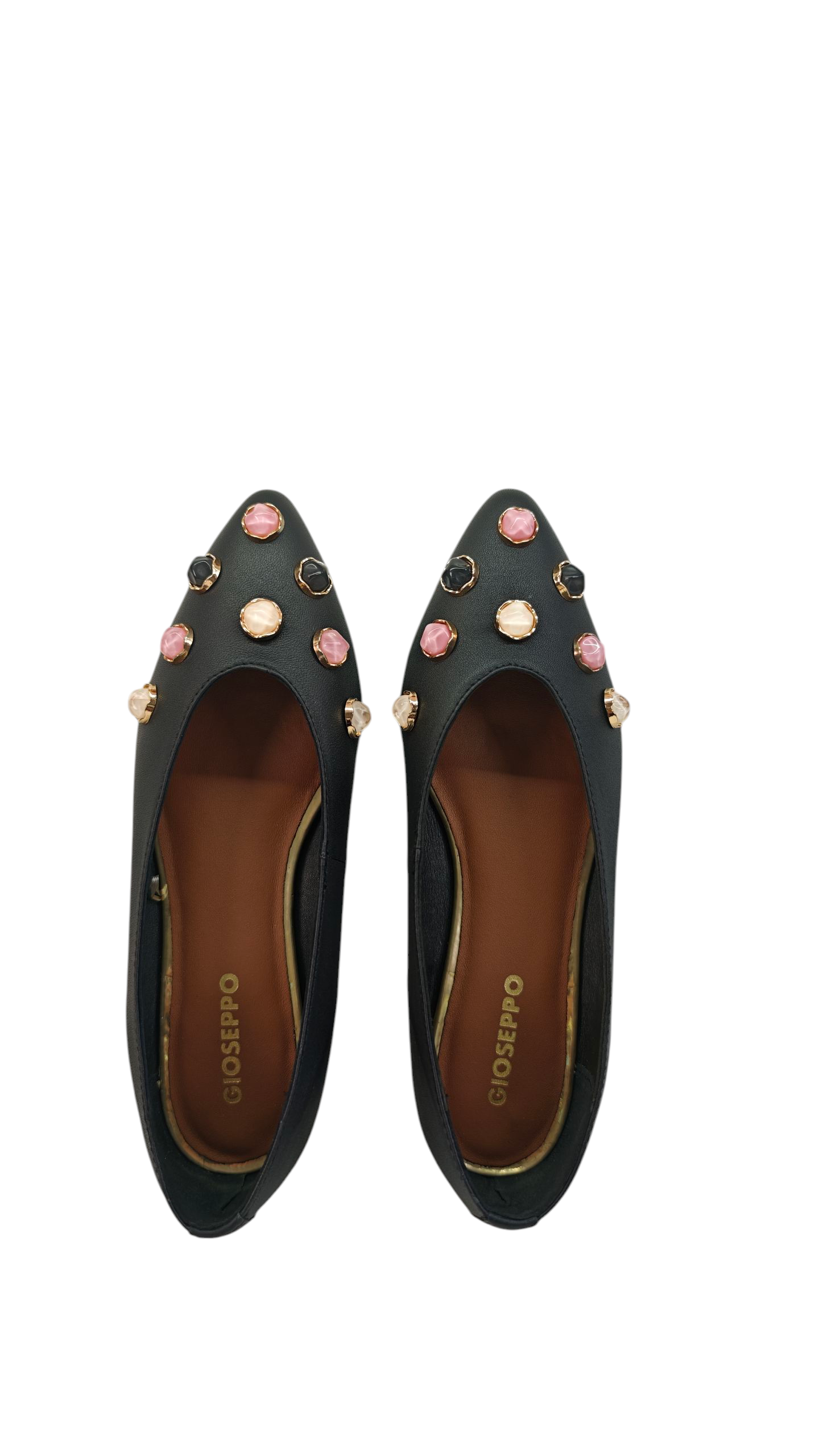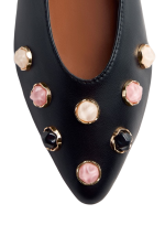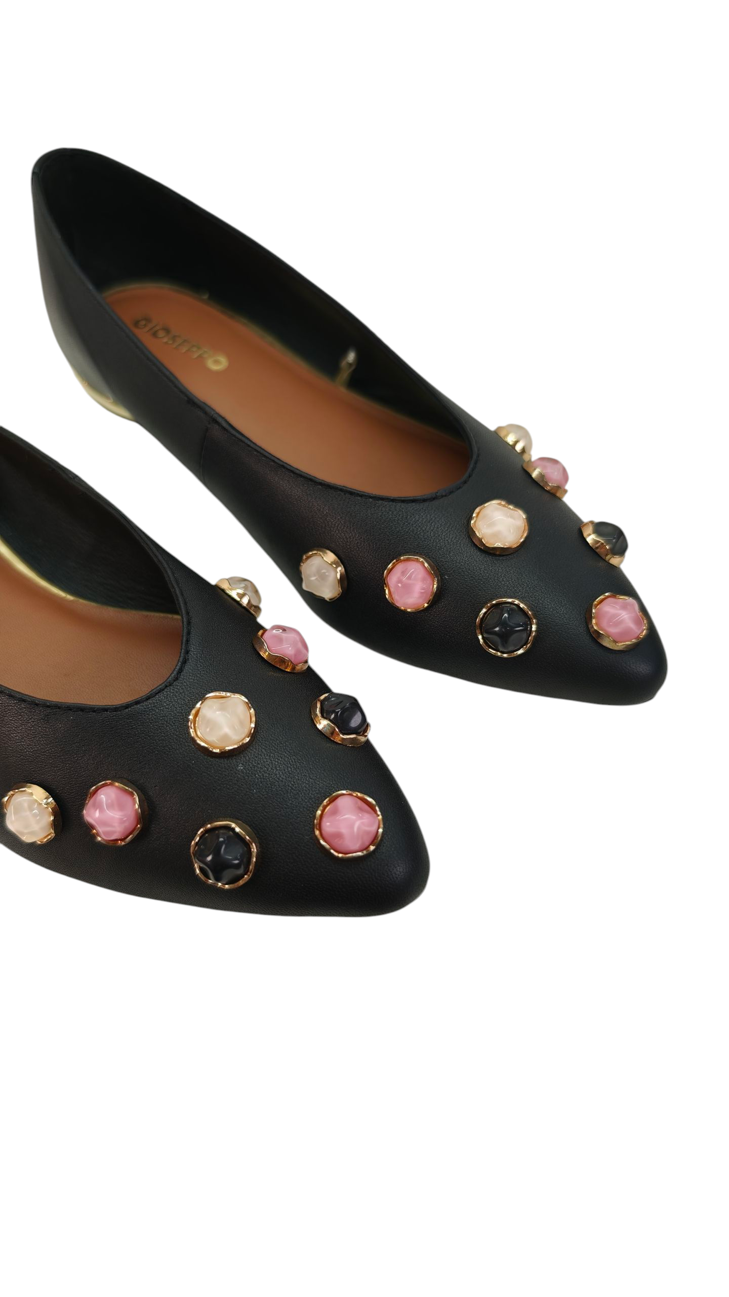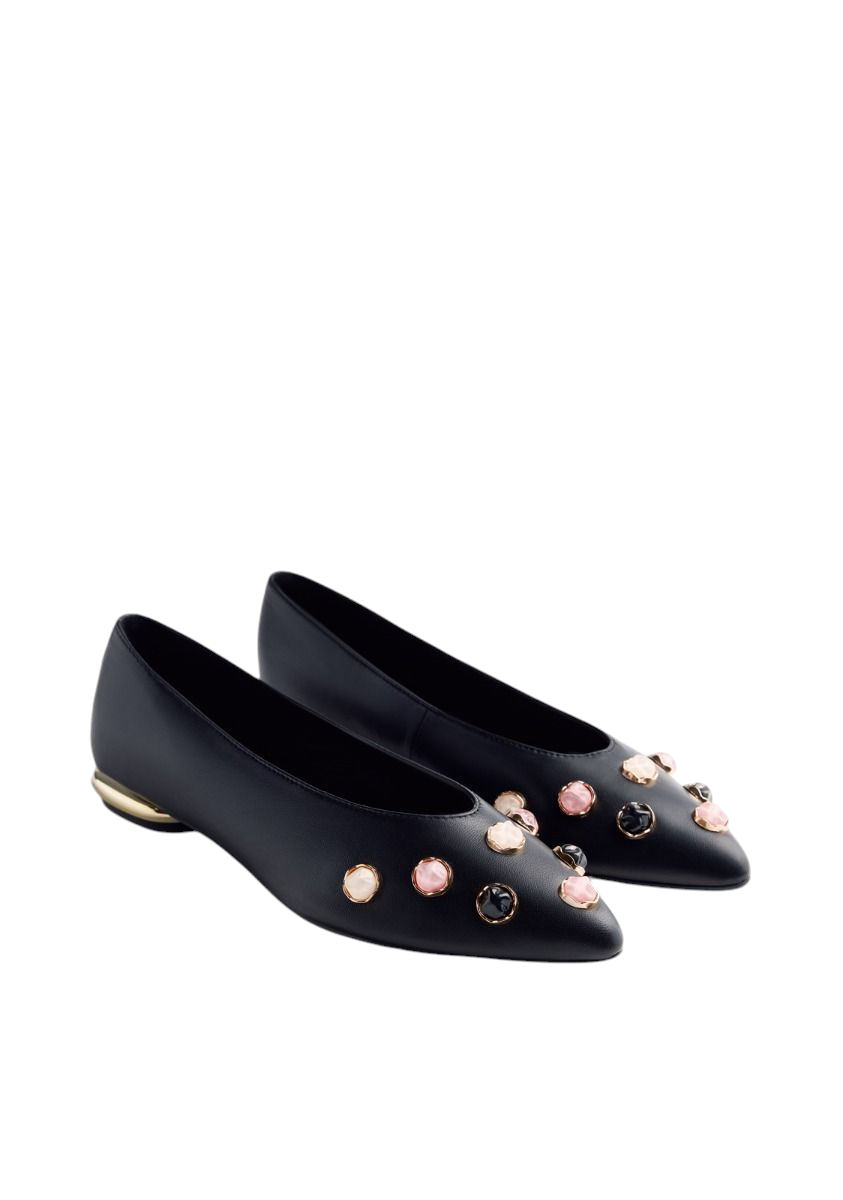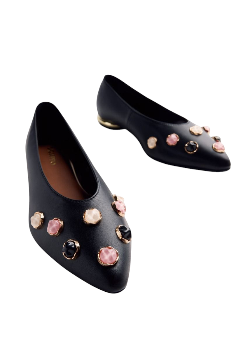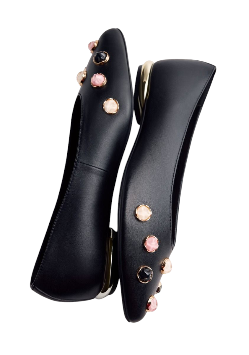 Cuando la elegancia se junta con la actitud, nacen estas joyitas. Manoletina en negro intenso, decorada con maxi-aplicaciones efecto gema en tonos rosa, nácar y negro, engastadas en dorado para un brillo de lujo urbano. Su diseño puntiagudo y el tacón metálico redondeado hacen que cada paso sea sofisticado pero con un aire rompedor. Perfecta para brillar en cualquier ocasión, desde la oficina hasta un afterwork con mucho estilo.