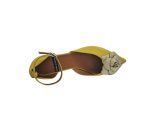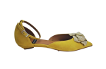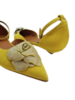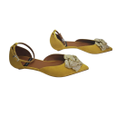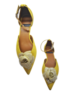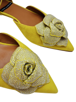 Esta es una sandalia elegante de color amarillo mostaza con un diseño sofisticado. Presenta una punta afilada y un adorno en la parte frontal en forma de flor con detalles brillantes, lo que le da un toque de lujo y distinción.