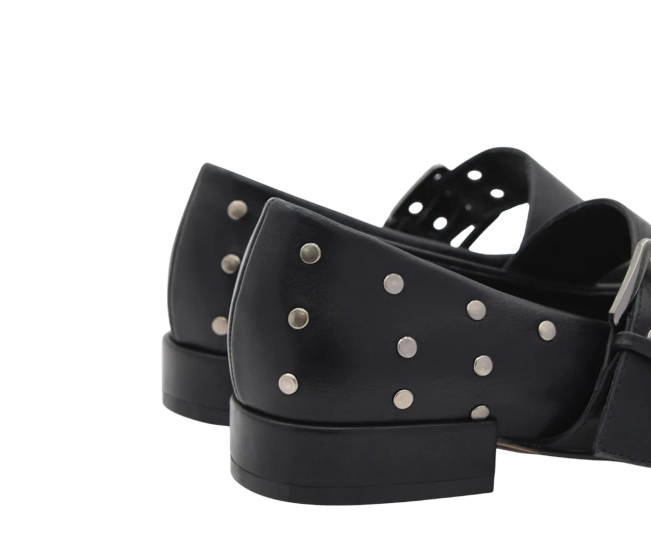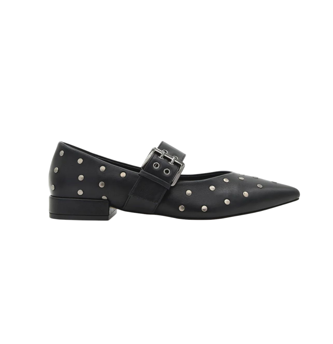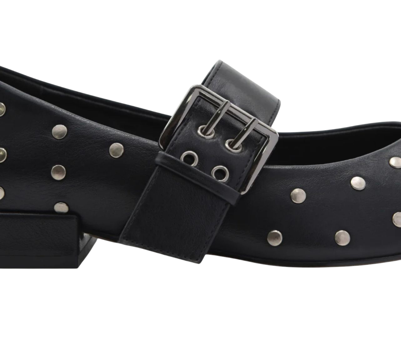 Si pensabas que las manoletinas eran dulzonas, esta llega para callar bocas. Negra, afilada en punta y salpicada de tachuelas metálicas, es pura actitud rockera hecha zapato. El detalle del maxi-cierre con hebilla le da ese aire cañero que transforma cualquier look en un statement de estilo. Cómoda, versátil y con mucha personalidad, es la prueba de que lo rebelde también puede ser elegante