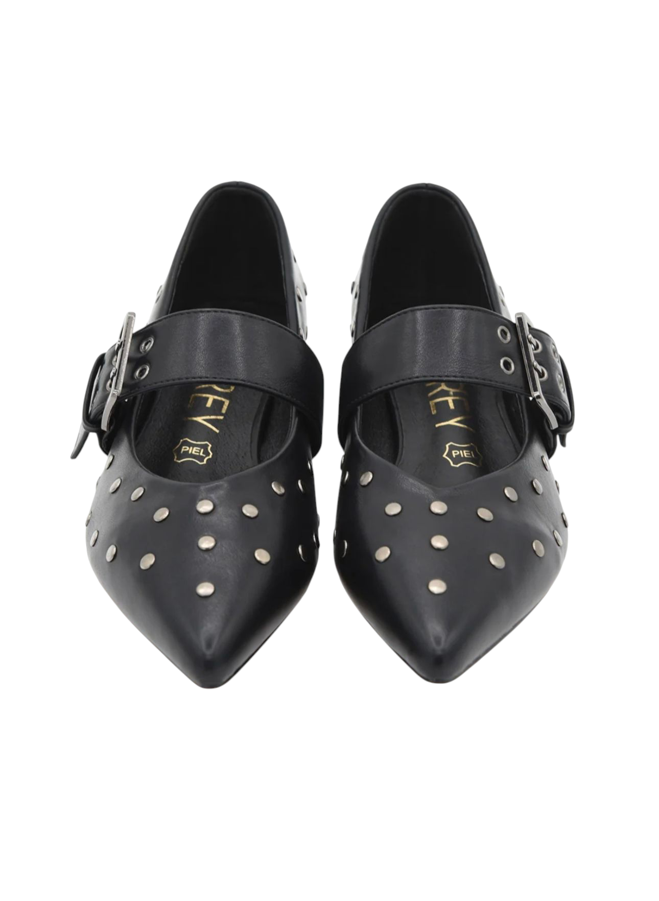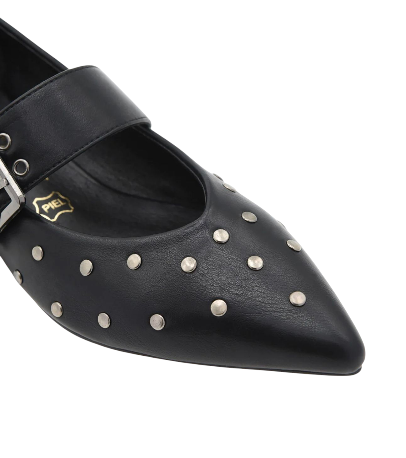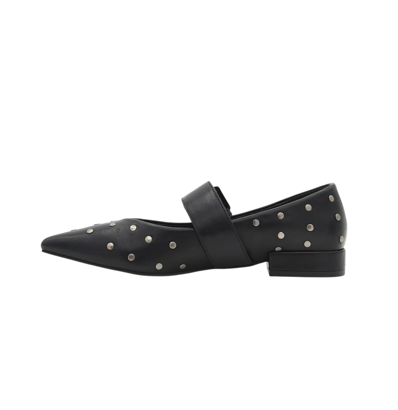Si pensabas que las manoletinas eran dulzonas, esta llega para callar bocas. Negra, afilada en punta y salpicada de tachuelas metálicas, es pura actitud rockera hecha zapato. El detalle del maxi-cierre con hebilla le da ese aire cañero que transforma cualquier look en un statement de estilo. Cómoda, versátil y con mucha personalidad, es la prueba de que lo rebelde también puede ser elegante