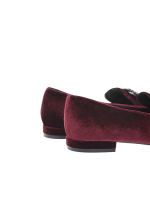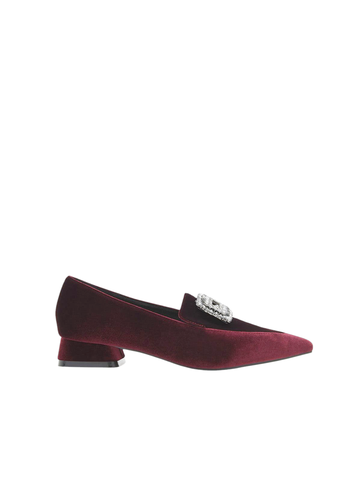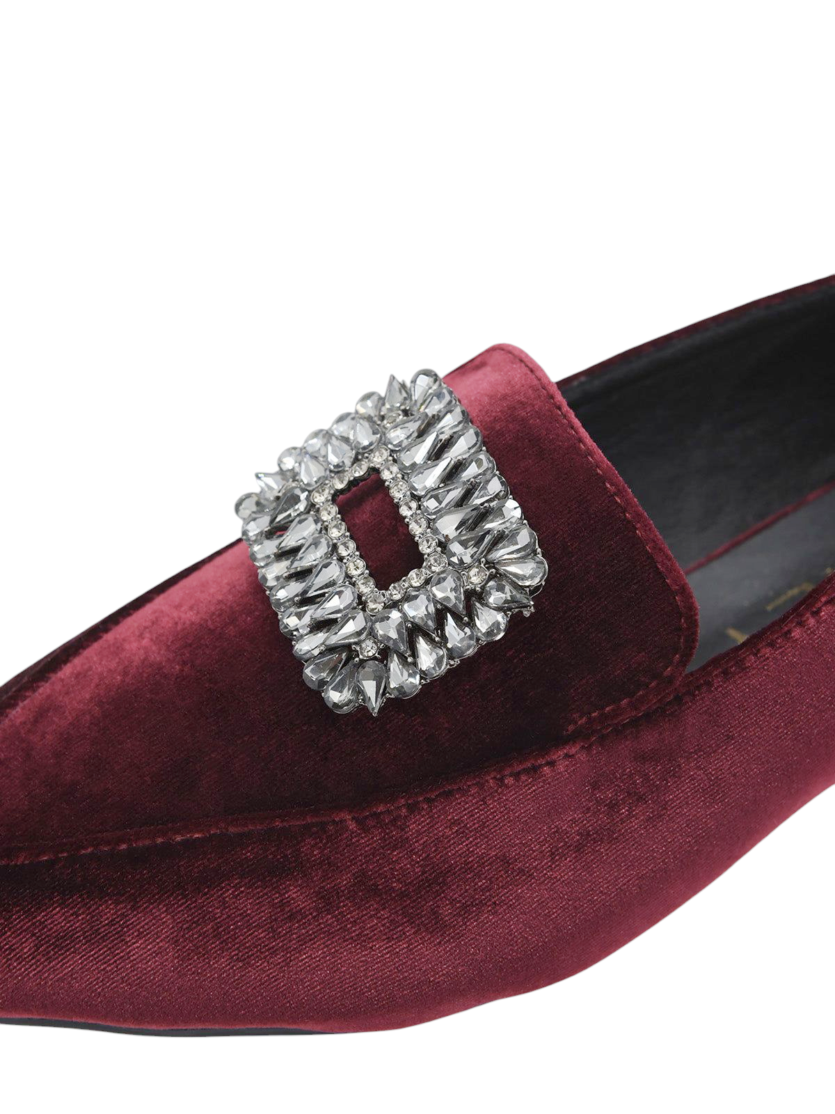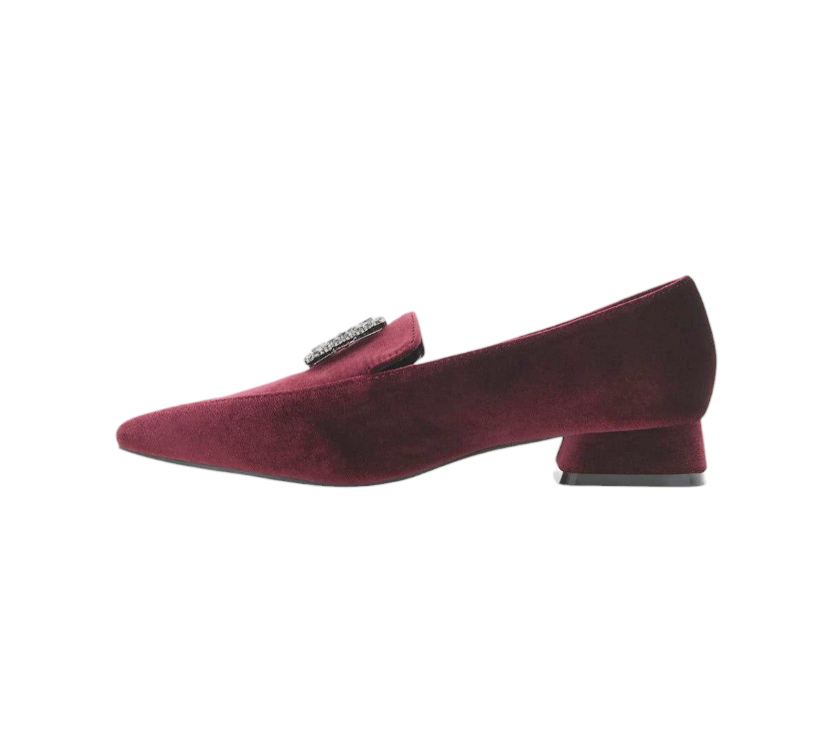 A shoe that screams sophistication with every step. Its burgundy velvet radiates luxury and warmth, while the oversized crystal-embellished buckle makes it the star of any look. Perfect for elevating a simple outfit or complementing your chicest styles—without the need for heels.