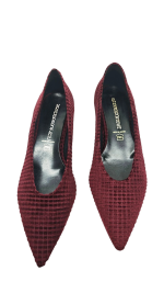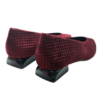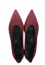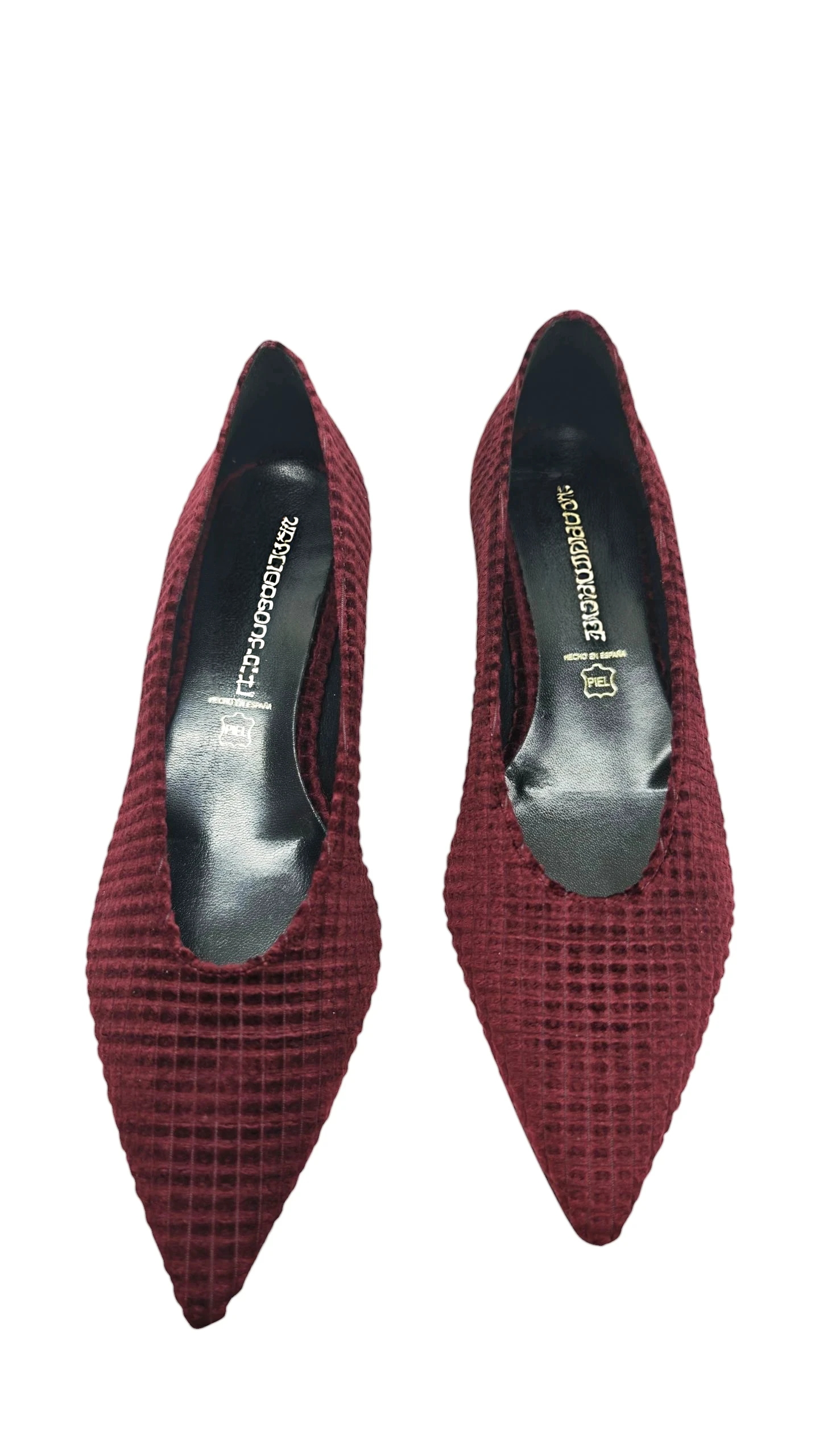 Un zapato que es puro statement. Su tejido burdeos Tipo terciopelo,vcon textura cuadriculada rompe lo clásico para darle un aire moderno y súper fashionista. La punta afilada estiliza al máximo, mientras que el acabado asegura comodidad y calidad.