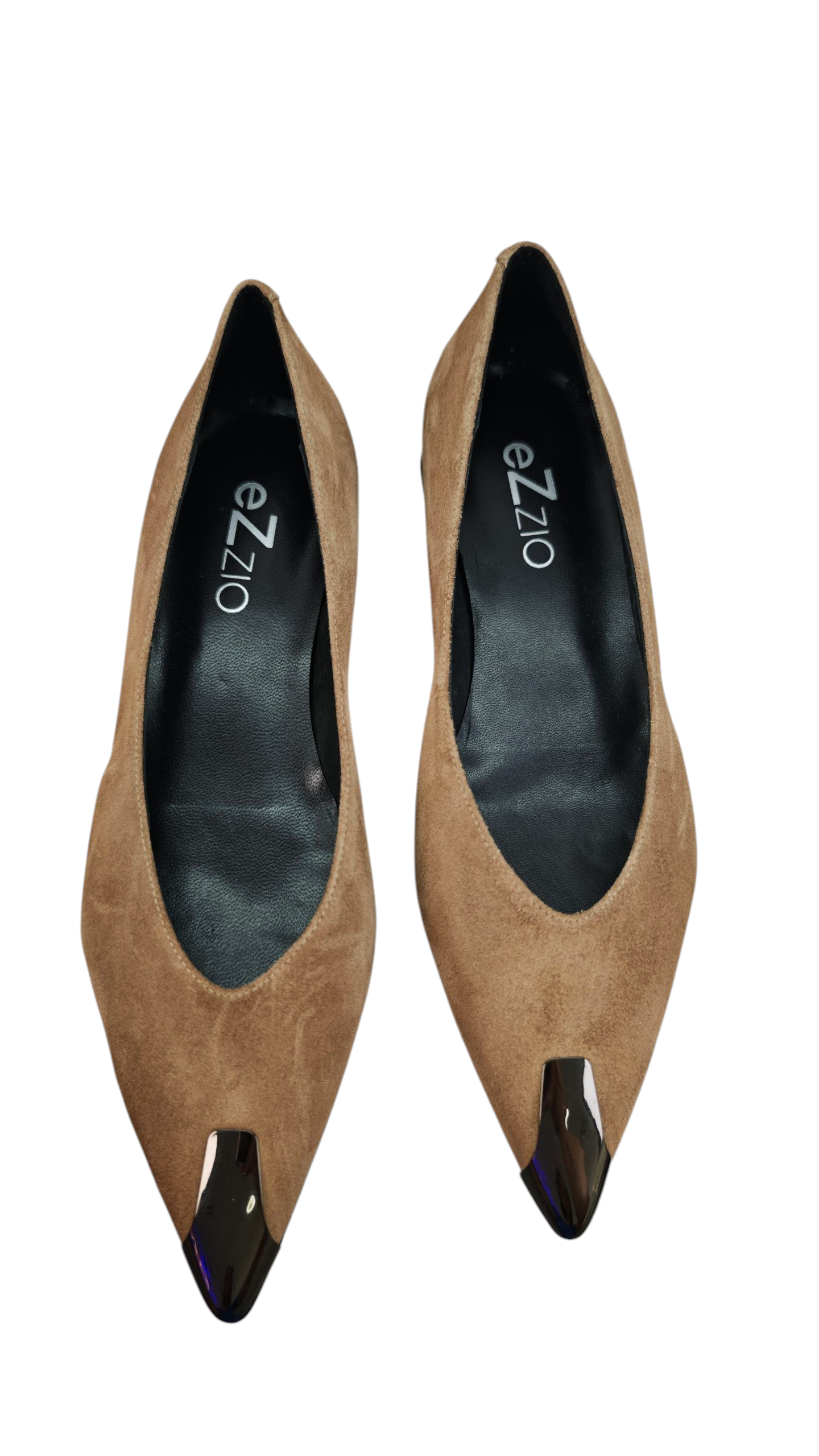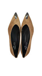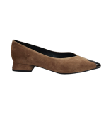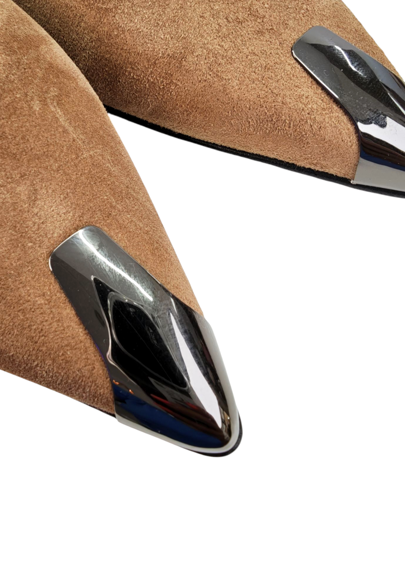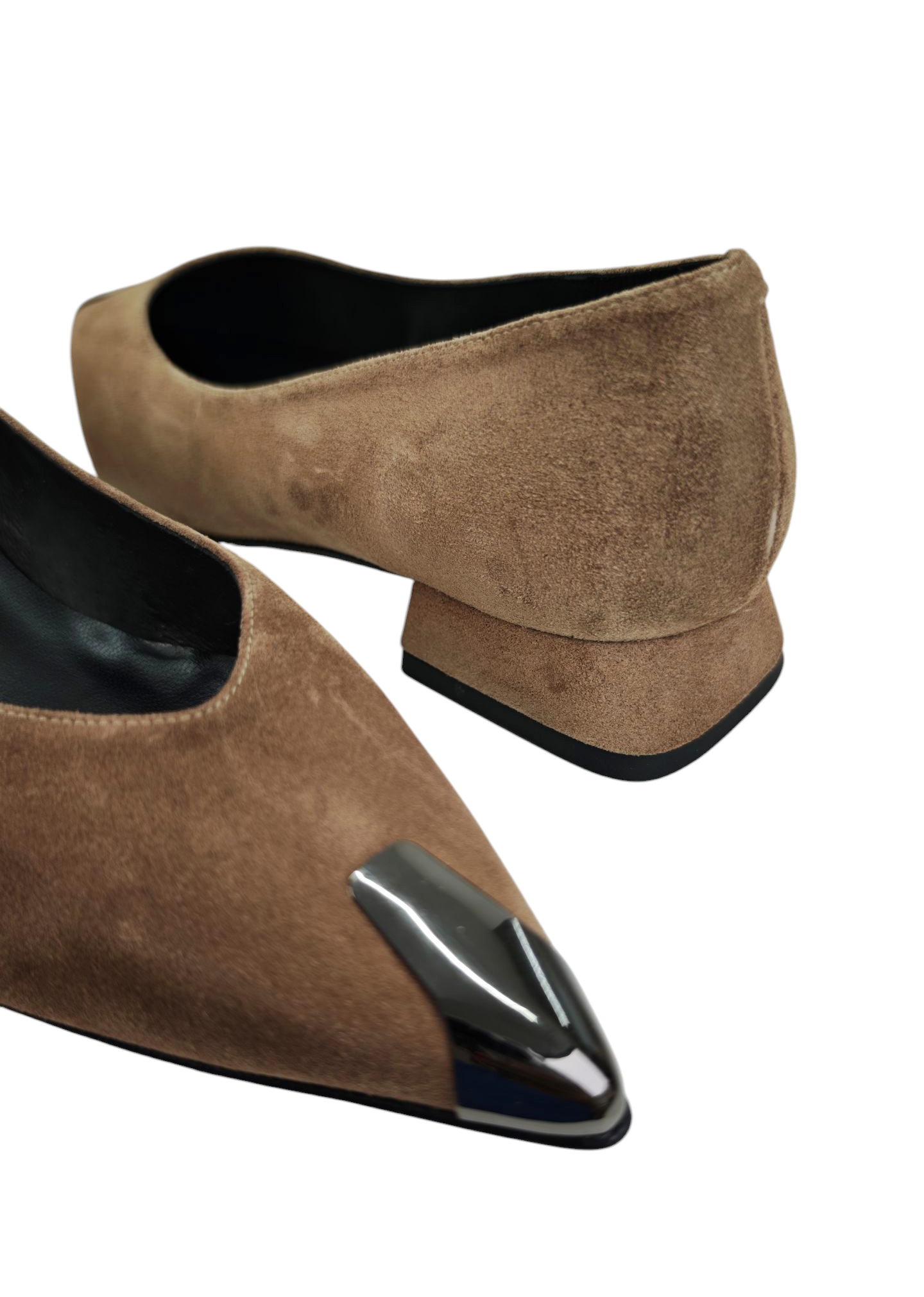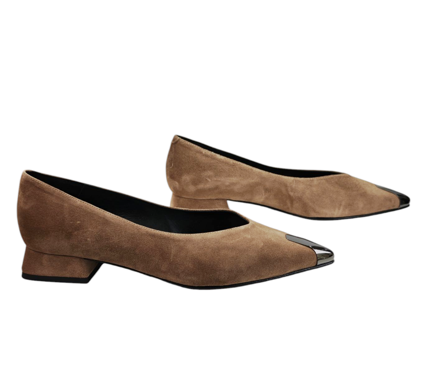 Minimalista, cañera y con un puntazo de estilo que no pasa desapercibido. Esta bailarina en ante camel con puntera metálica es el comodín perfecto para elevar cualquier look sin renunciar a la comodidad. Su punta afilada con detalle de acero le da ese aire sofisticado y rompedor que la convierte en mucho más que un básico.Con su tacón bajo y cómodo, es ideal para acompañarte desde la oficina hasta un afterwork con amigas. Femenina, versátil y con ese toque atrevido que marca la diferencia. 💥