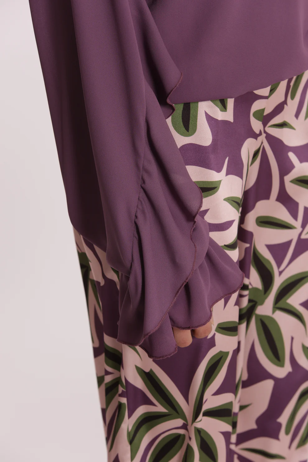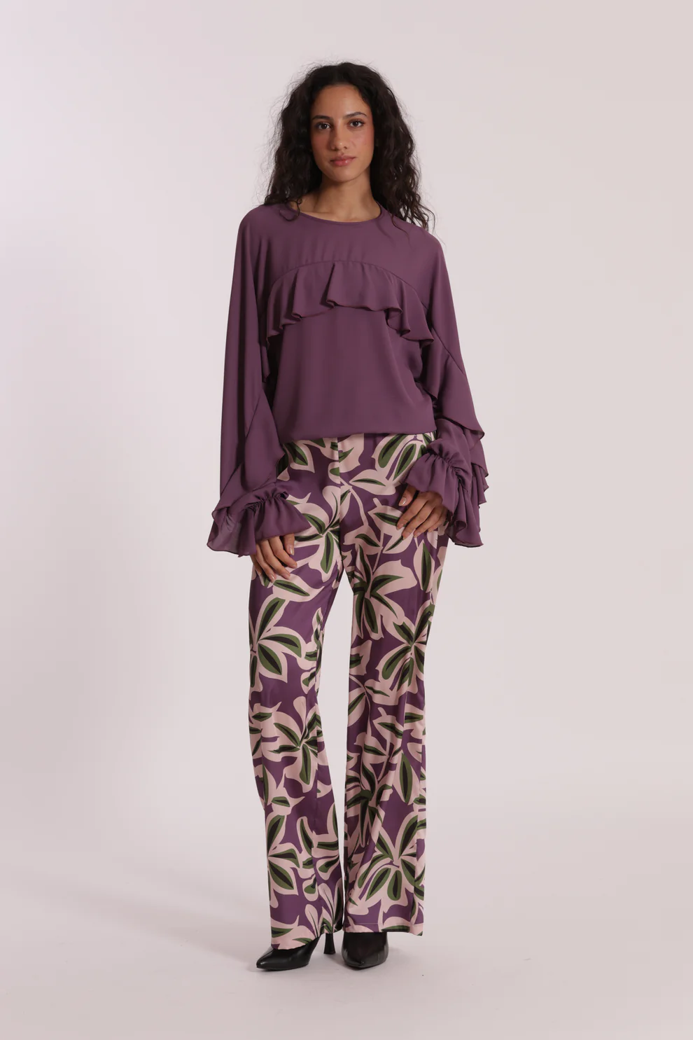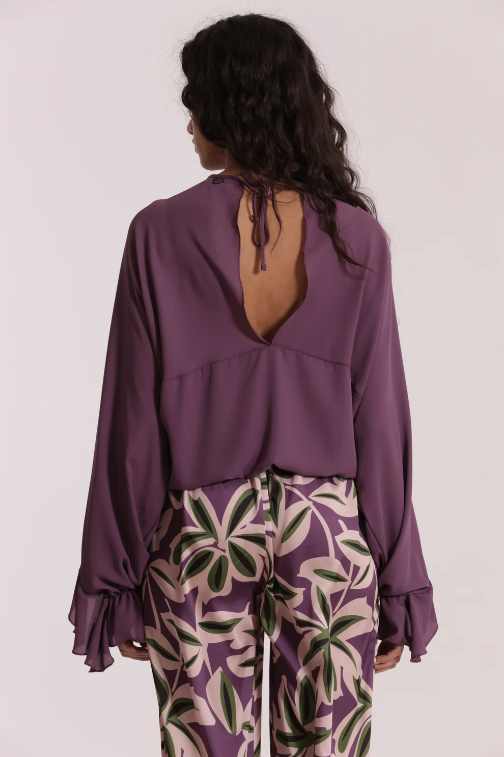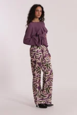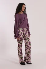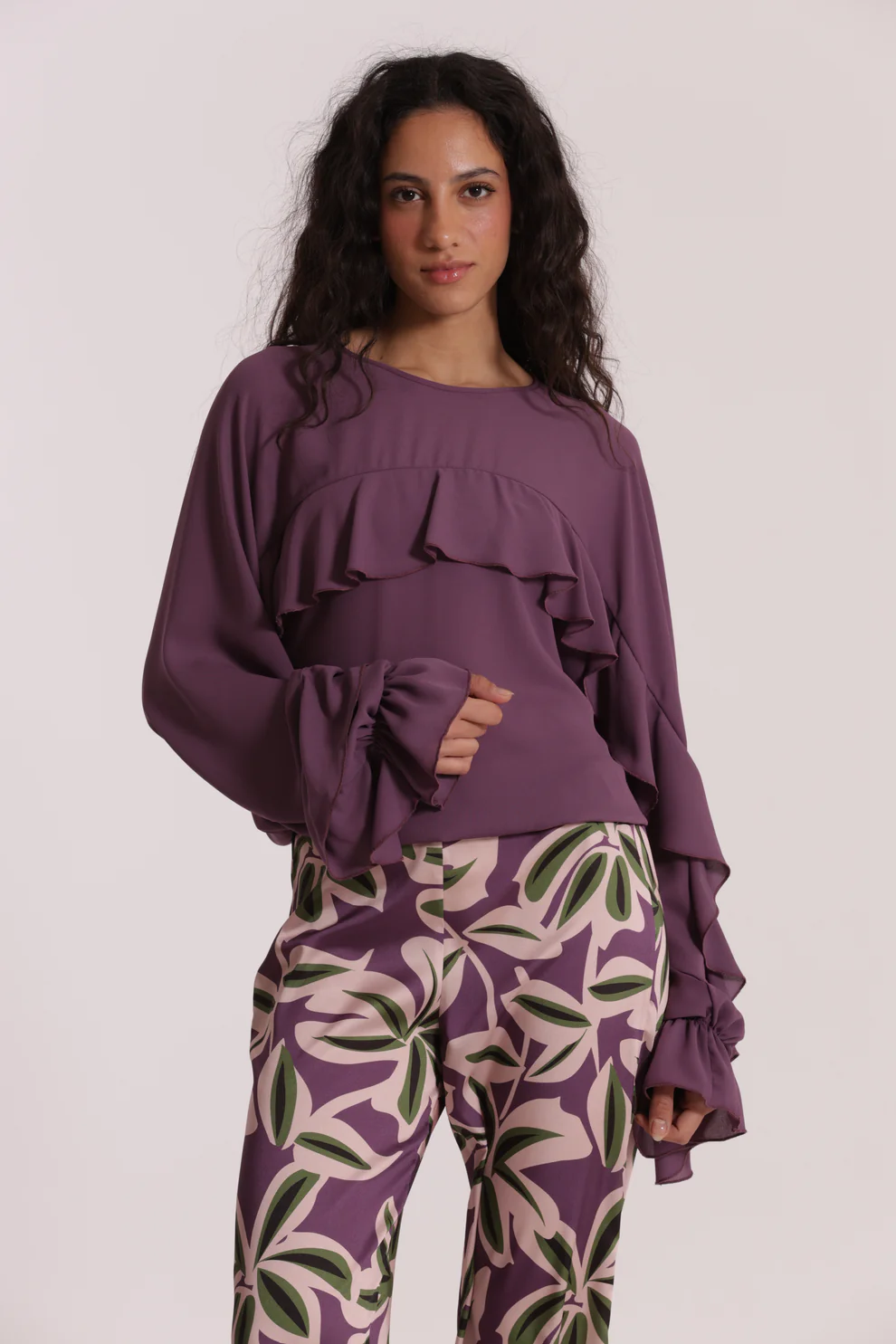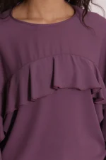 Blusa en color lavanda súper cool, con volantes y goma en el bajo para darle un toque chic a tus looks, ideal para combinarla con nuestros pantalones geométricos.