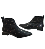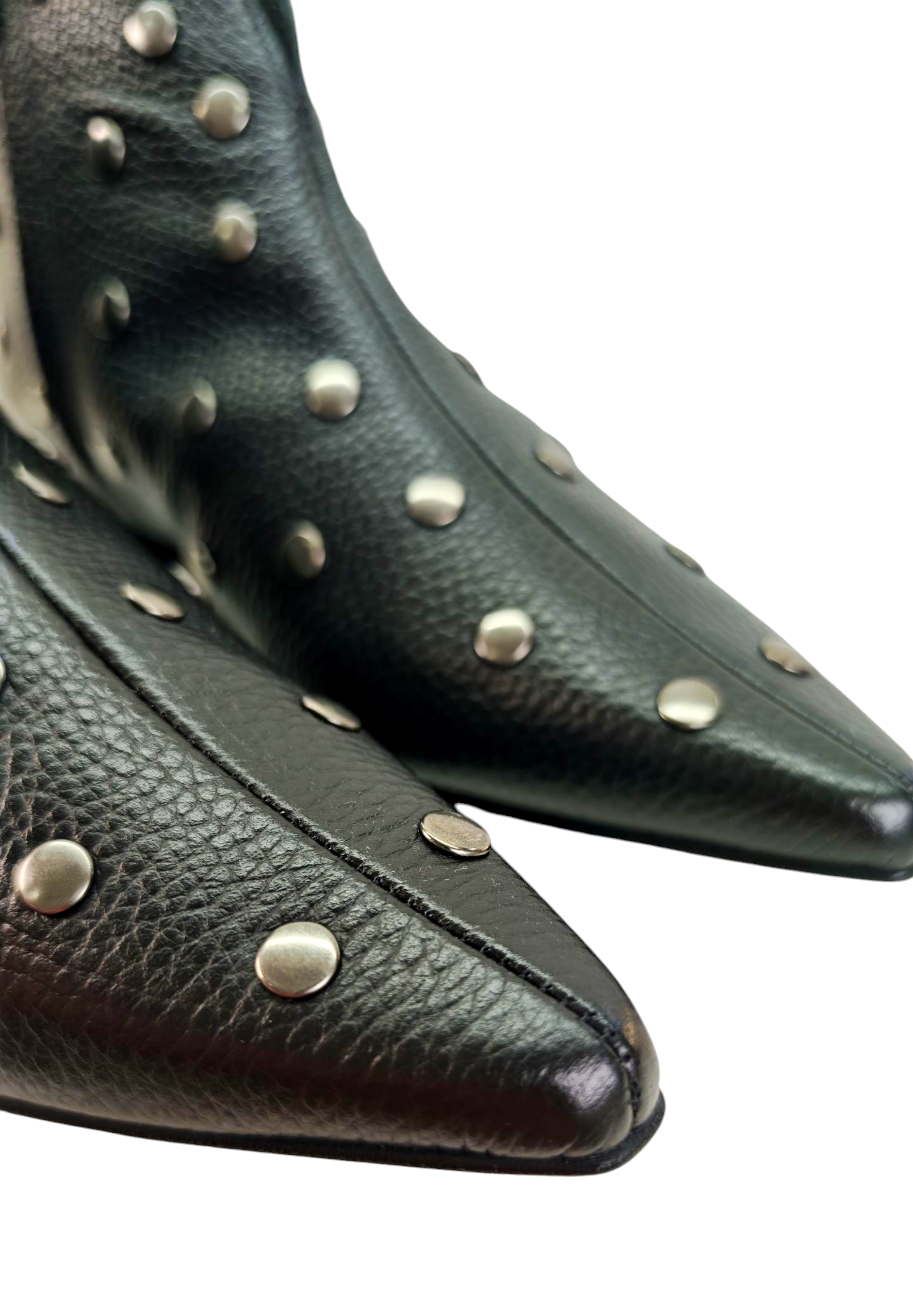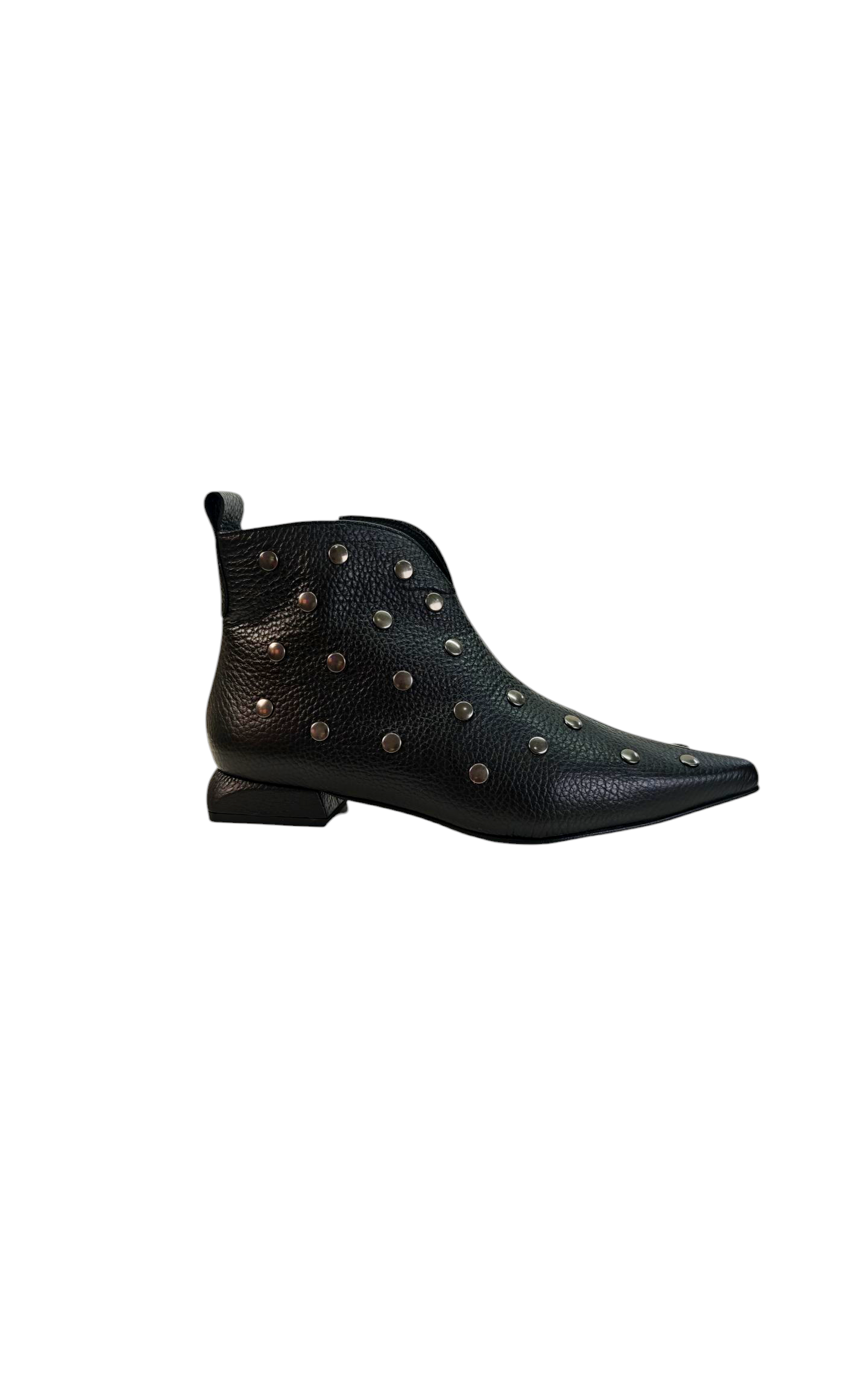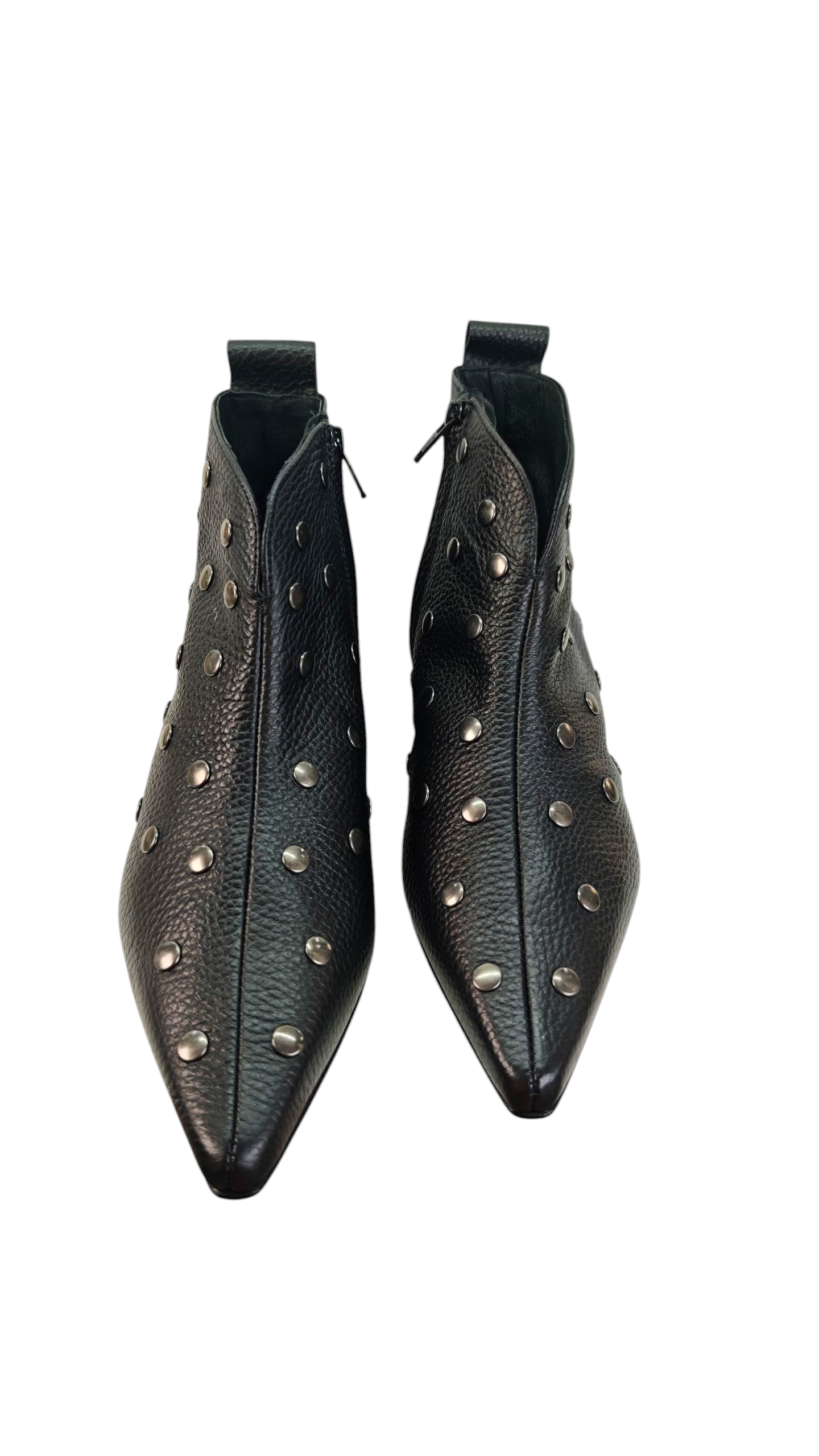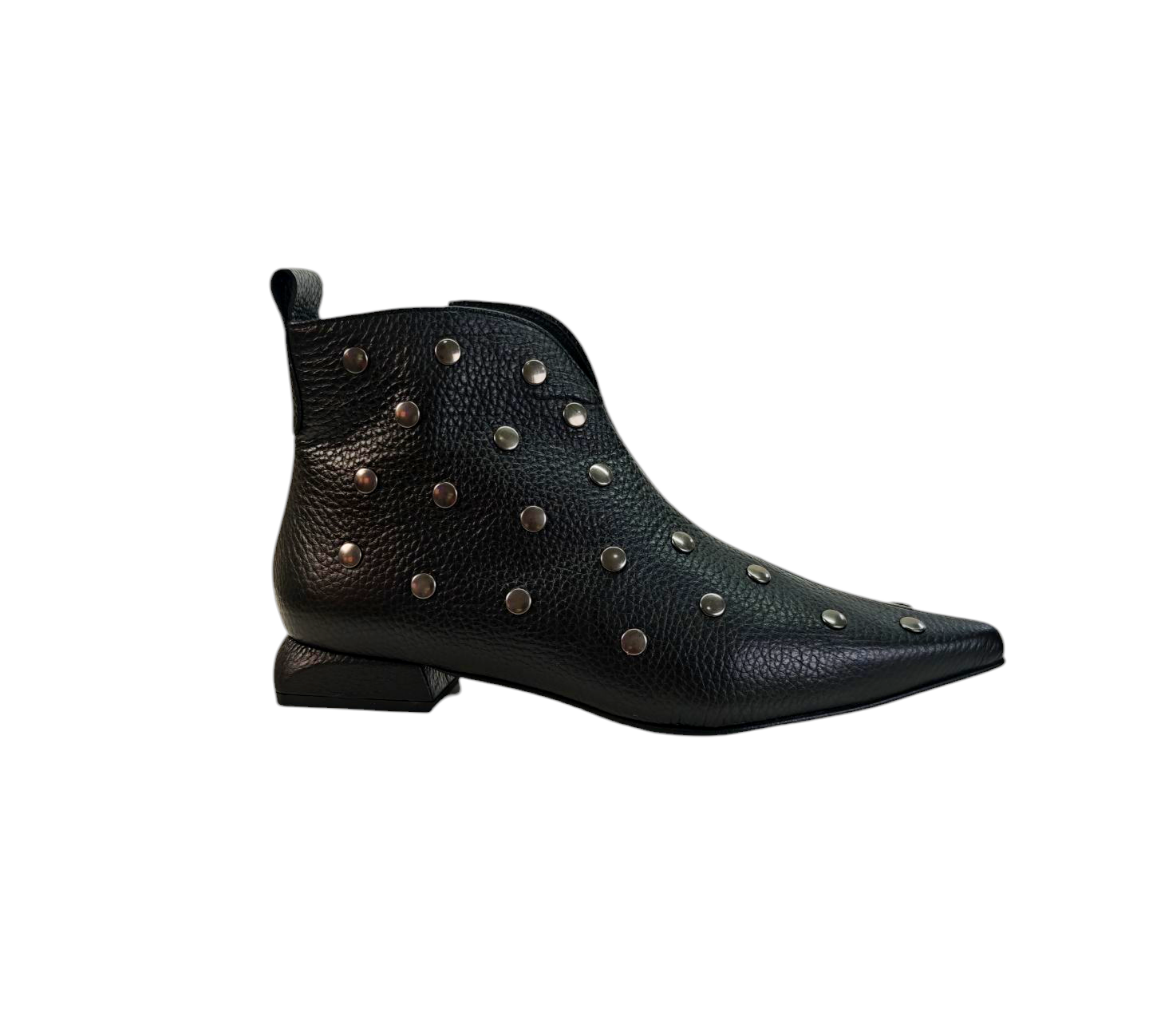 Este botín negro es puro rock & roll para tus pies. Con su piel texturizada y tachuelas metálicas repartidas por todo el diseño, es imposible que pase desapercibido. Punta afilada, suela cómoda y un rollazo que combina igual de bien con un look casual que con un outfit de noche cañero. El aliado perfecto para pisar fuerte y dejar claro quién manda en la pista… o en la calle. 🔥🖤