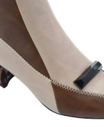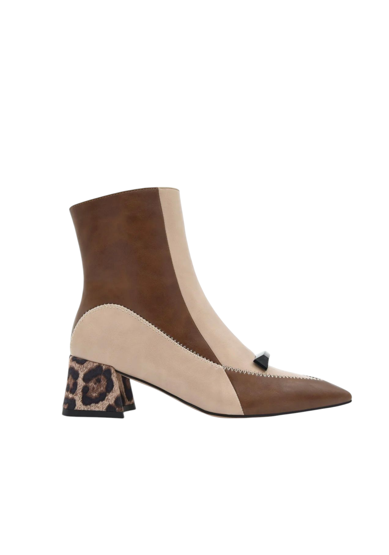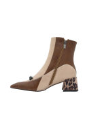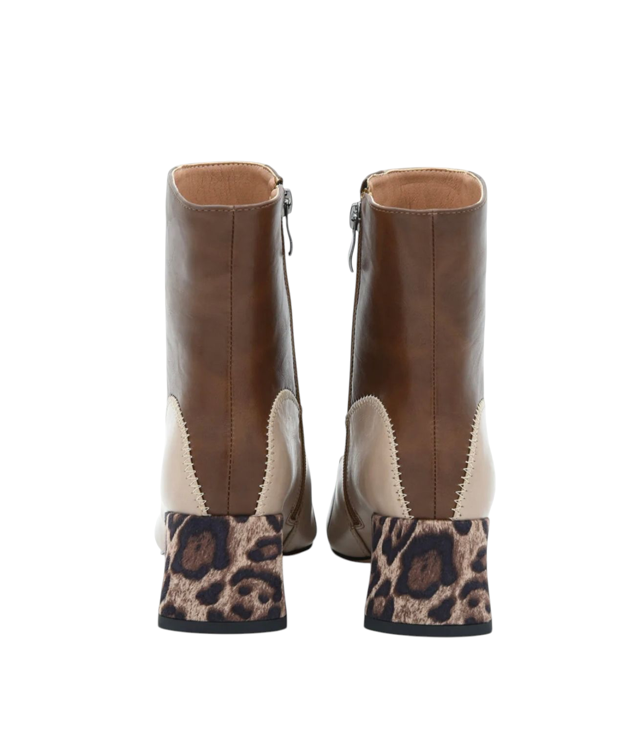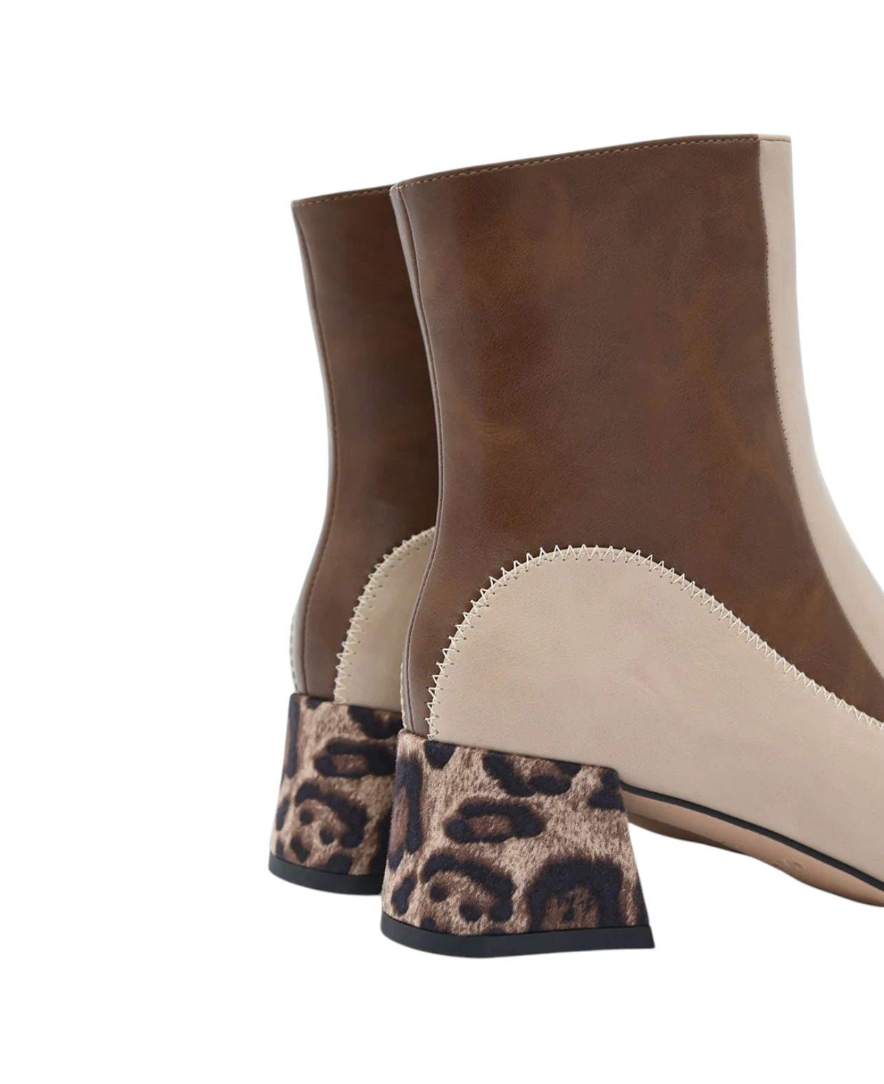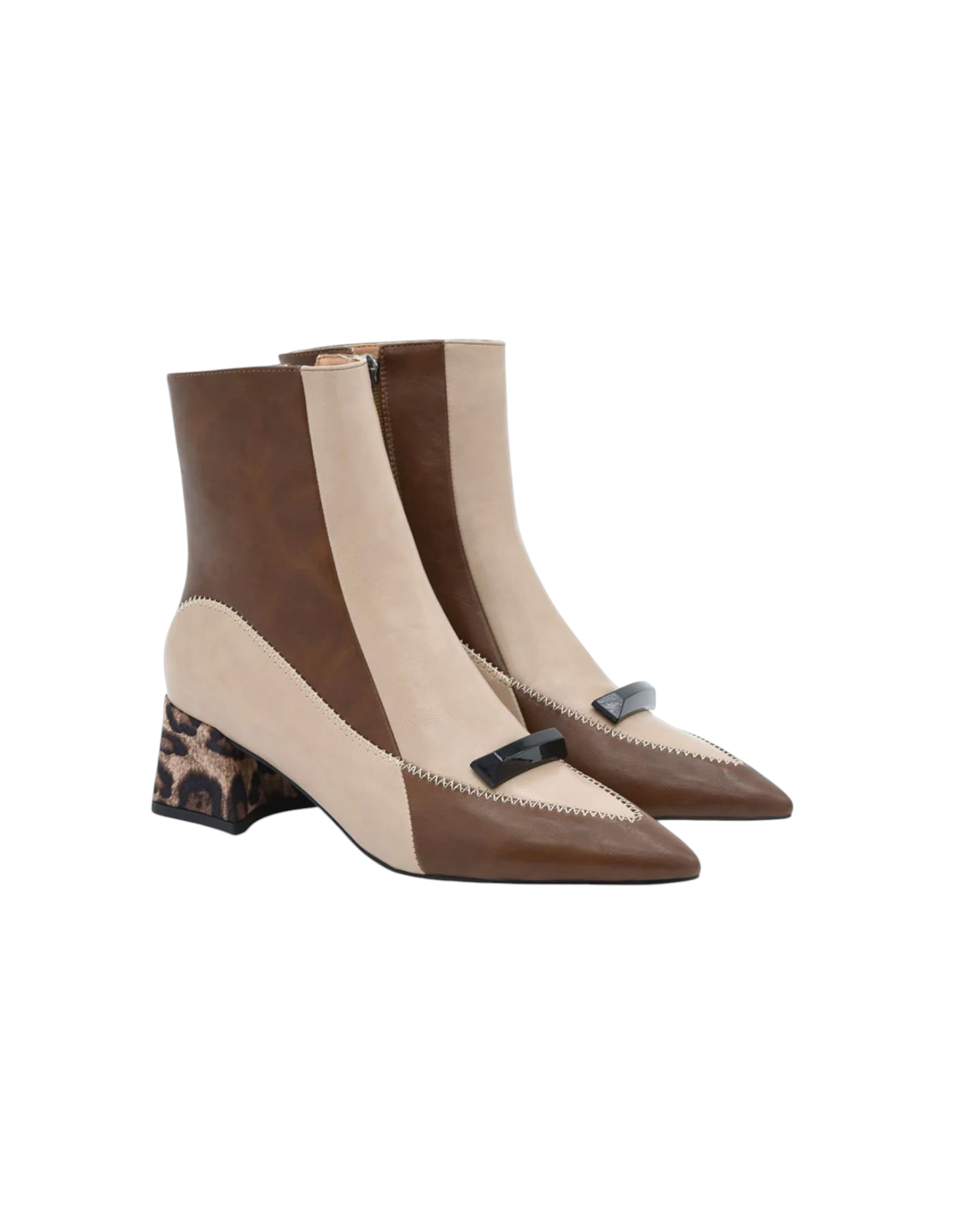 🔥 “Botín dos tonos, elegante y cañero, pensado para quienes pisan fuerte sin renunciar a la comodidad. Su diseño geométrico en beige y marrón marca tendencia, mientras el tacón medio con print animal le da ese toque salvaje que lo hace único. La puntera afilada estiliza al máximo, y su detalle frontal le pone el broche moderno. Súper cómodo para llevar todo el día, pero con el estilo suficiente para brillar de noche.”