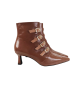 Prepárate para desatar tu lado más fashion killer con este botín de tacón midi y punta afilada que grita actitud en cada paso. Su acabado acharolado en tono cuero y las cuatro hebillas doradas no son un simple detalle: son una declaración de estilo. Cómodo, estilizador y con ese punto rebelde que hará que cualquier look pase de “meh” a wow en segundos. 💥