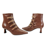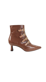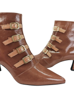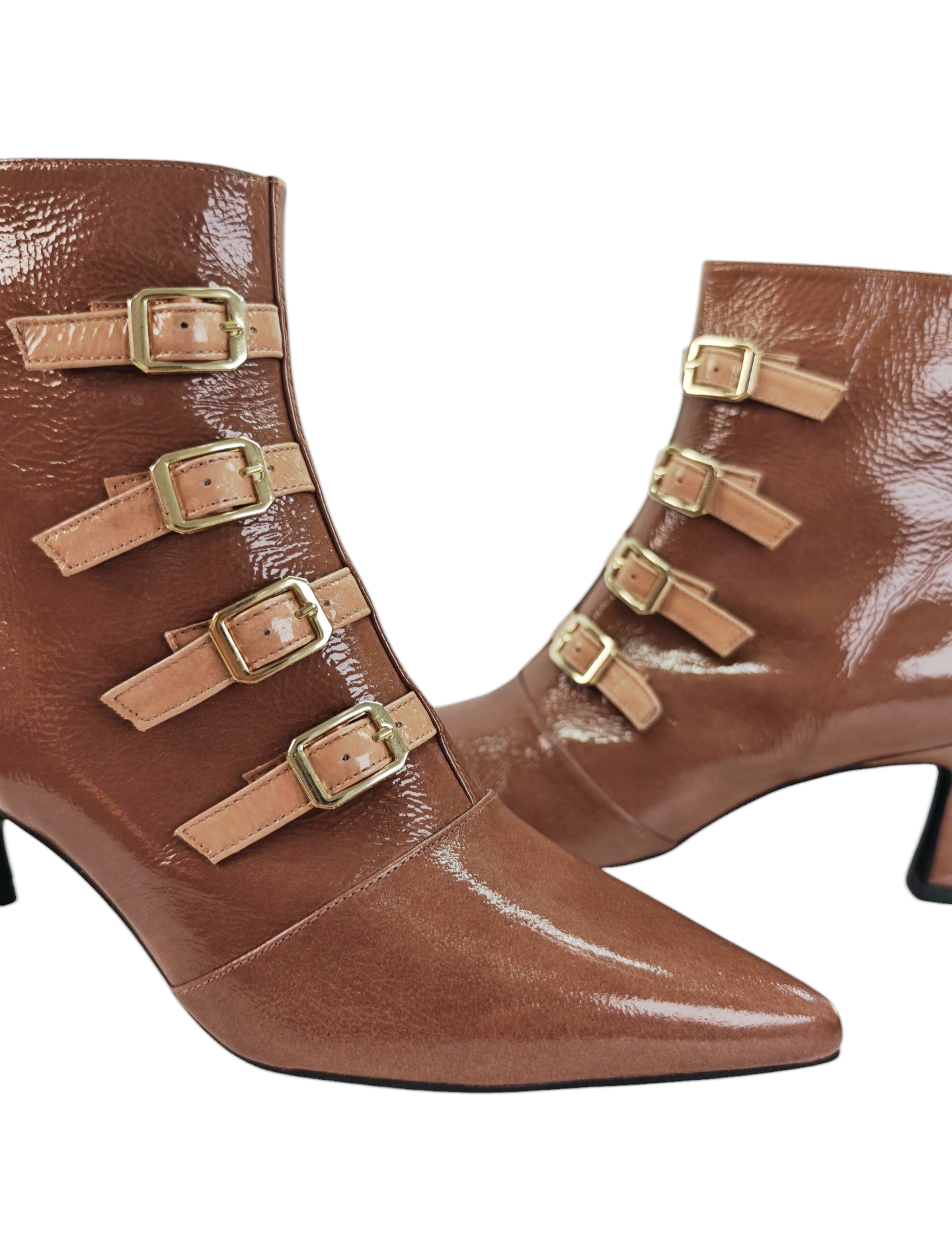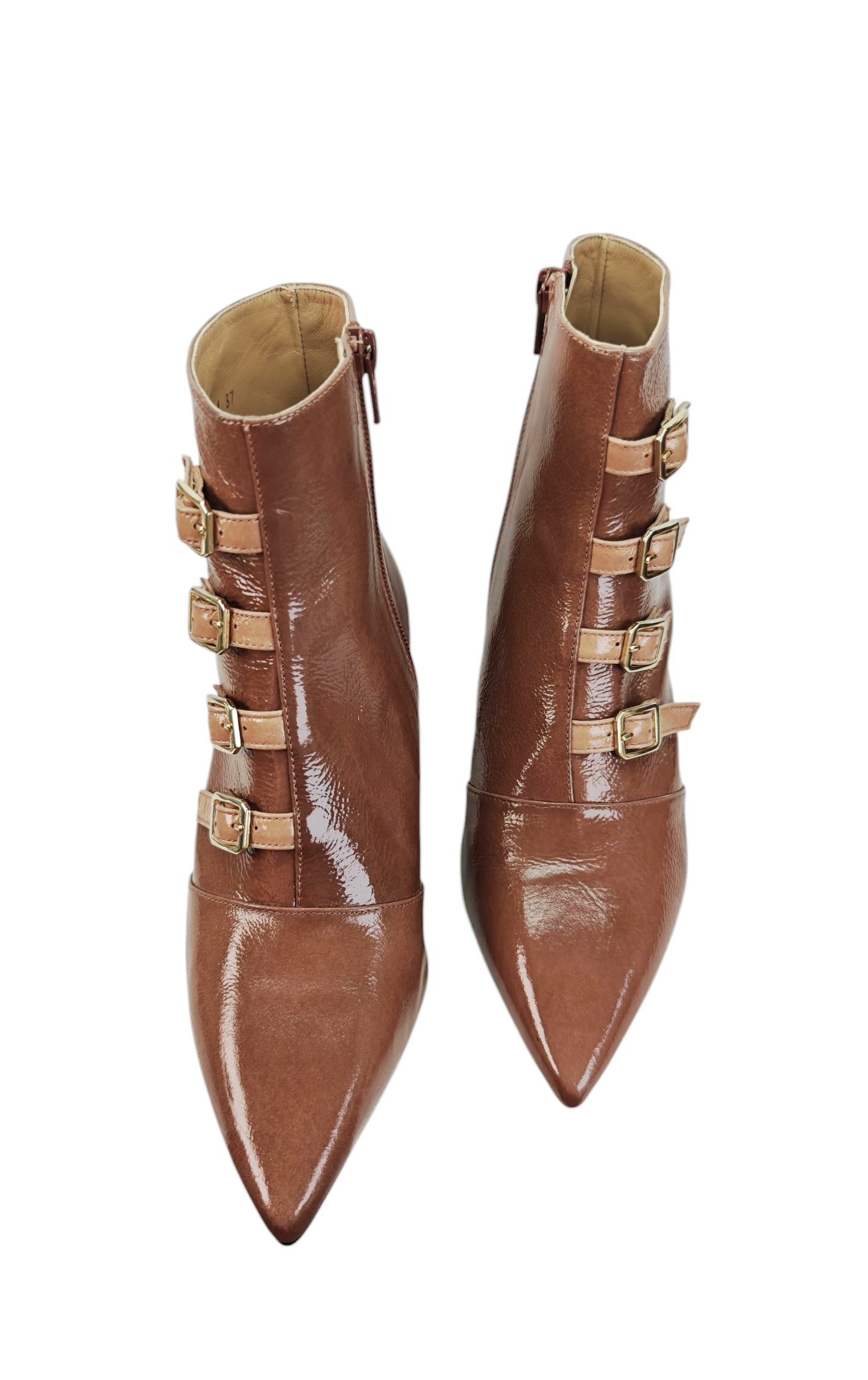 - Prepárate para desatar tu lado más fashion killer con este botín de tacón midi y punta afilada que grita actitud en cada paso. Su acabado acharolado en tono cuero y las cuatro hebillas doradas no son un simple detalle: son una declaración de estilo. Cómodo, estilizador y con ese punto rebelde que hará que cualquier look pase de “meh” a wow en segundos. 💥