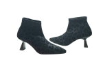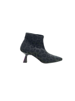 Su estampado animal print en negro sobre negro lo hace atrevido pero elegante, perfecto para marcar estilo sin perder sofisticación. La caña ajustada crea un efecto segunda piel, estilizando el tobillo, mientras que el tacón escultórico le da ese punto moderno y rompedor que lo convierte en protagonista absoluto del look.