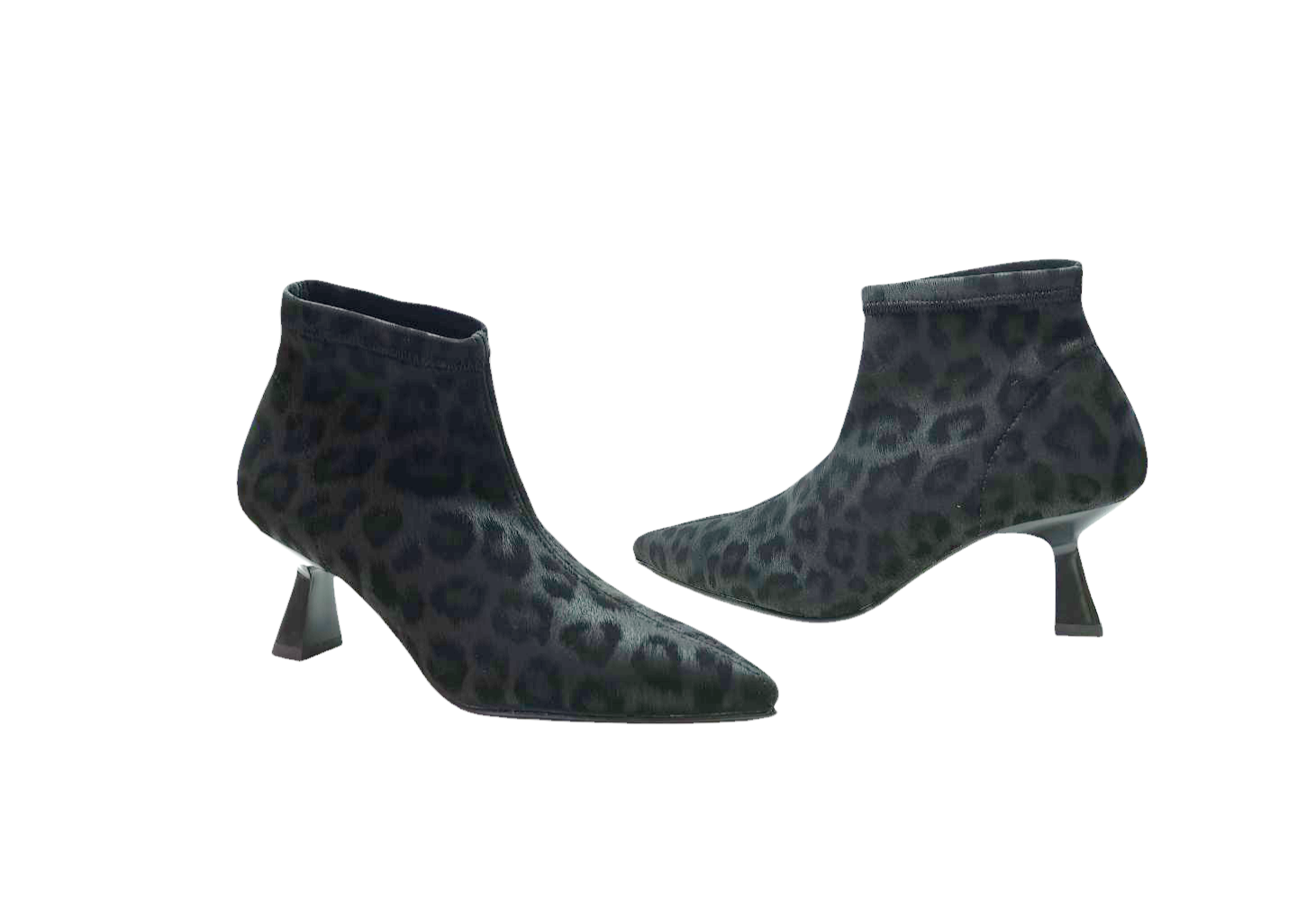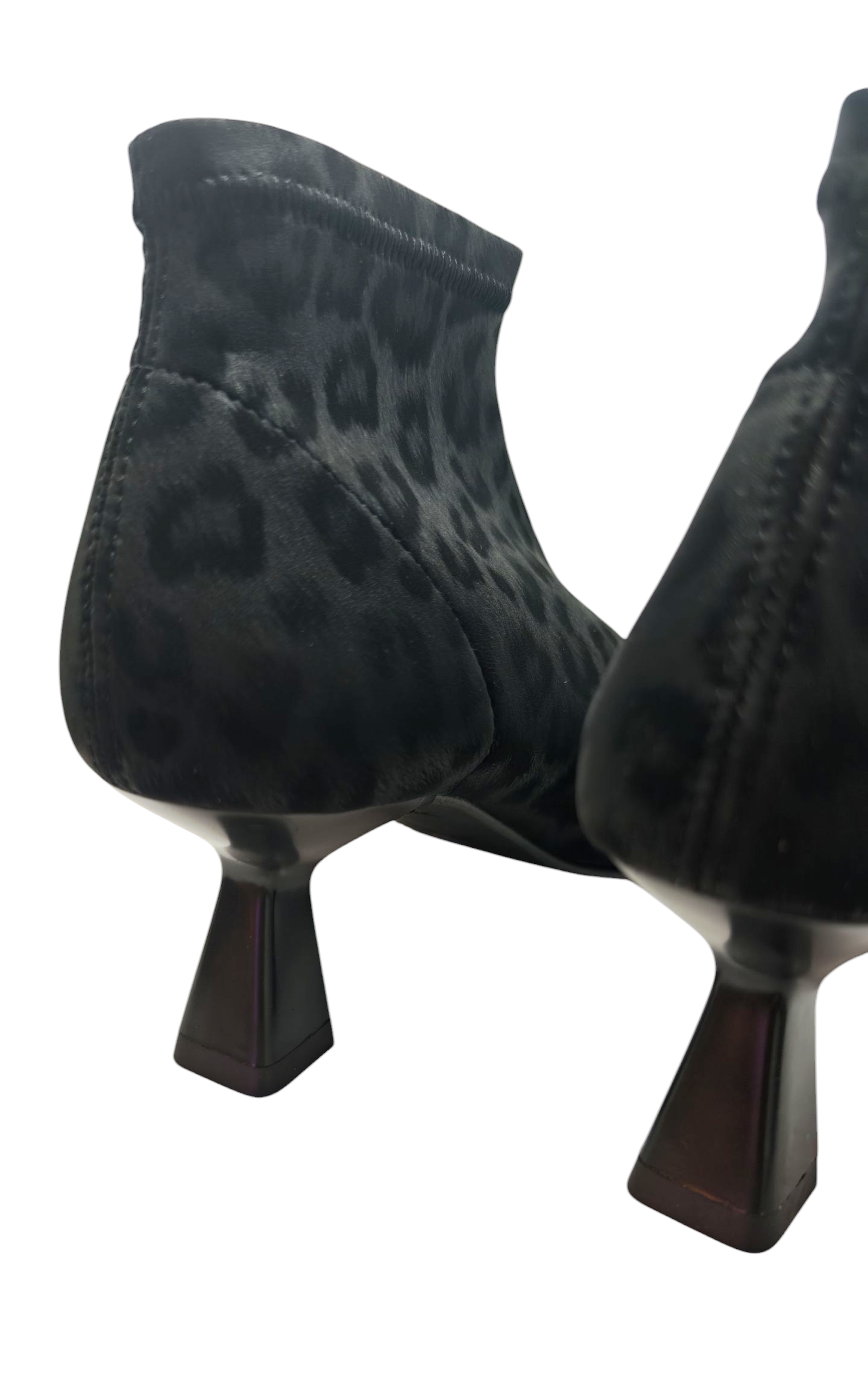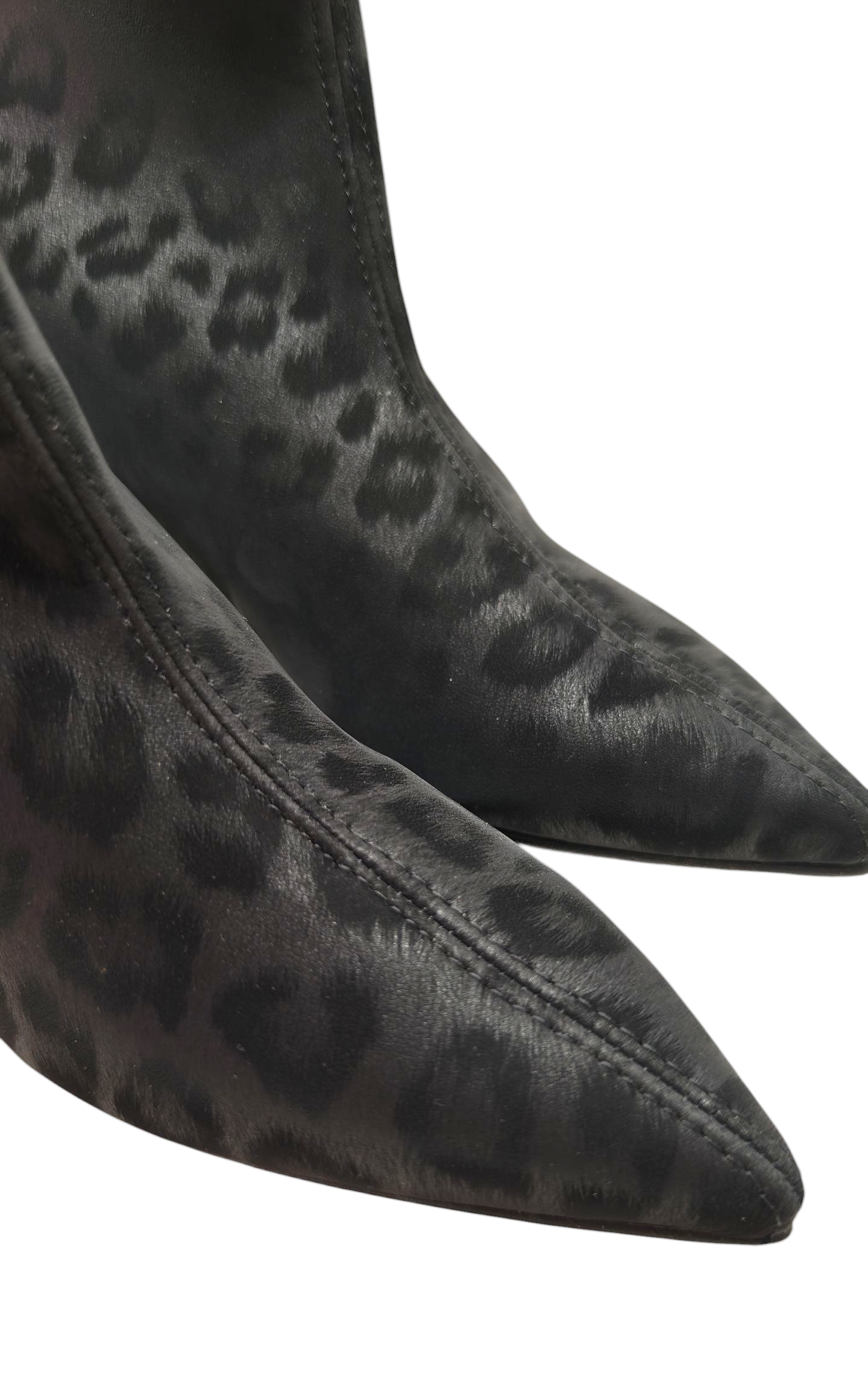 Su estampado animal print en negro sobre negro lo hace atrevido pero elegante, perfecto para marcar estilo sin perder sofisticación. La caña ajustada crea un efecto segunda piel, estilizando el tobillo, mientras que el tacón escultórico le da ese punto moderno y rompedor que lo convierte en protagonista absoluto del look.