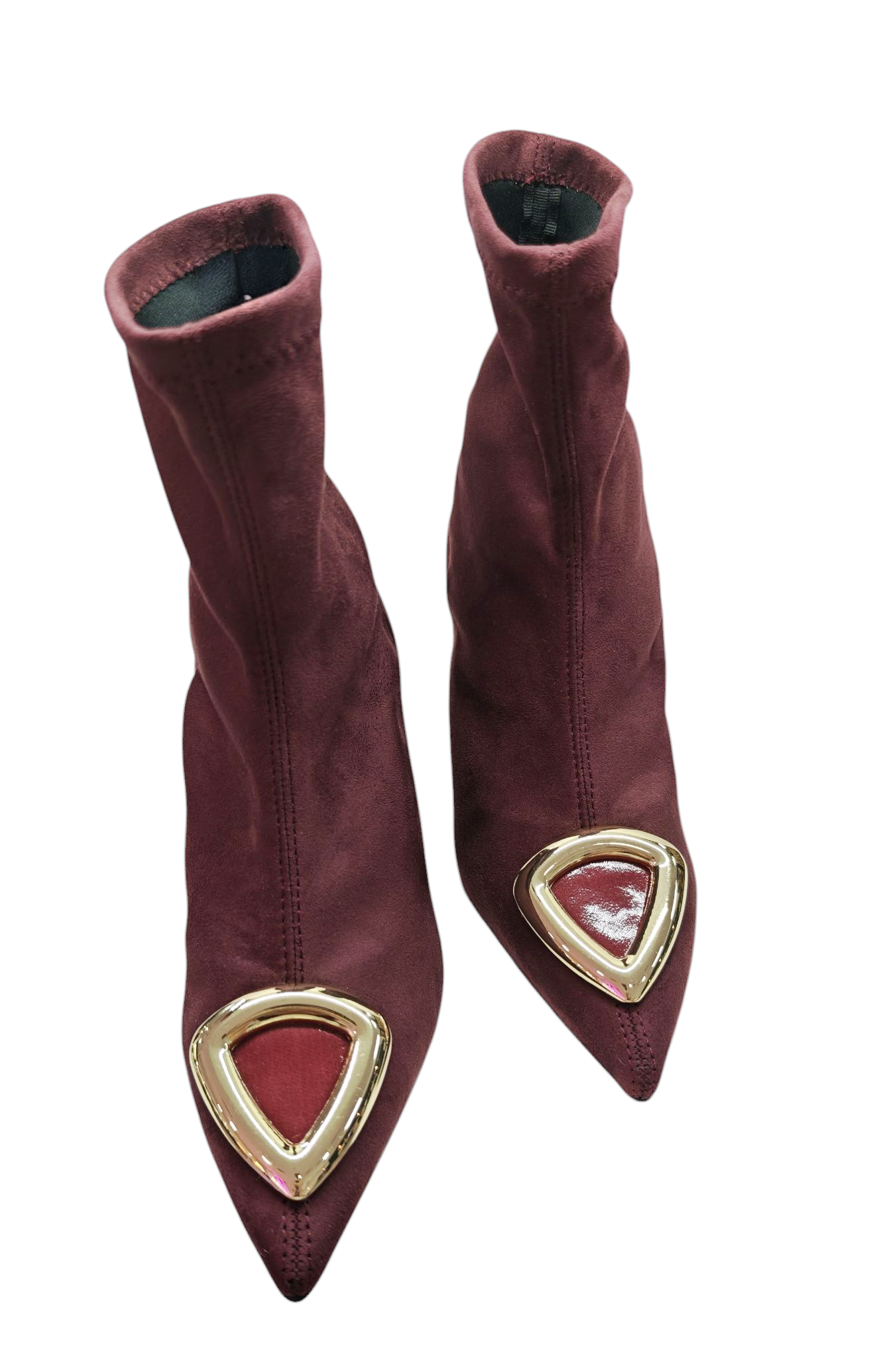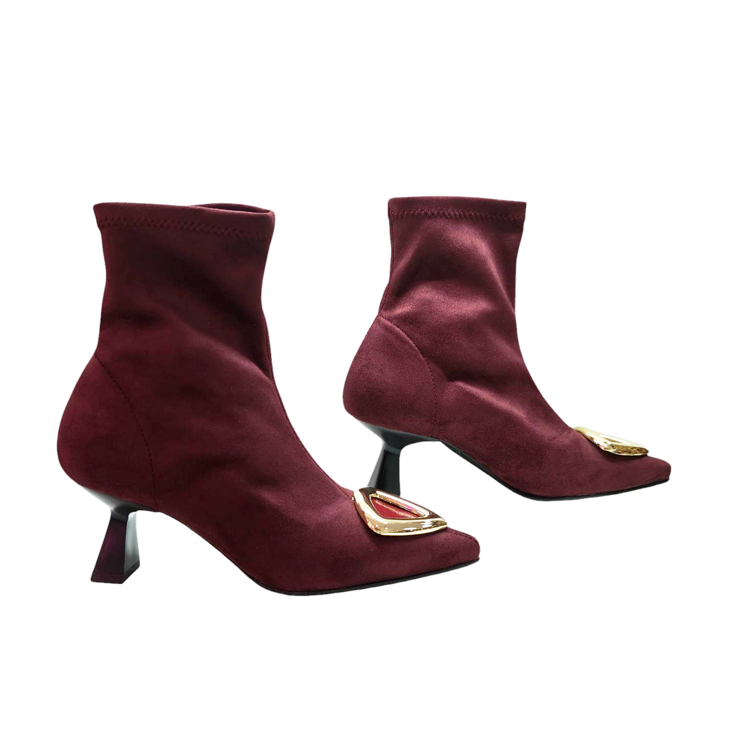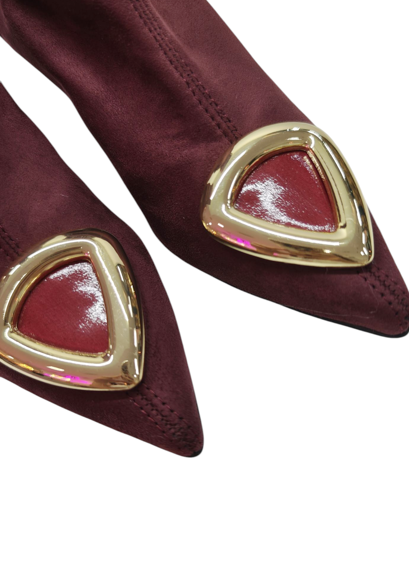 El aliado perfecto para darle power a tus looks. Su acabado en antelina burdeos con Lycra lo hace ultra versátil, mientras que la punta afilada con adorno oro y el tacón medio forma gritan pura sofisticación.