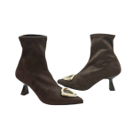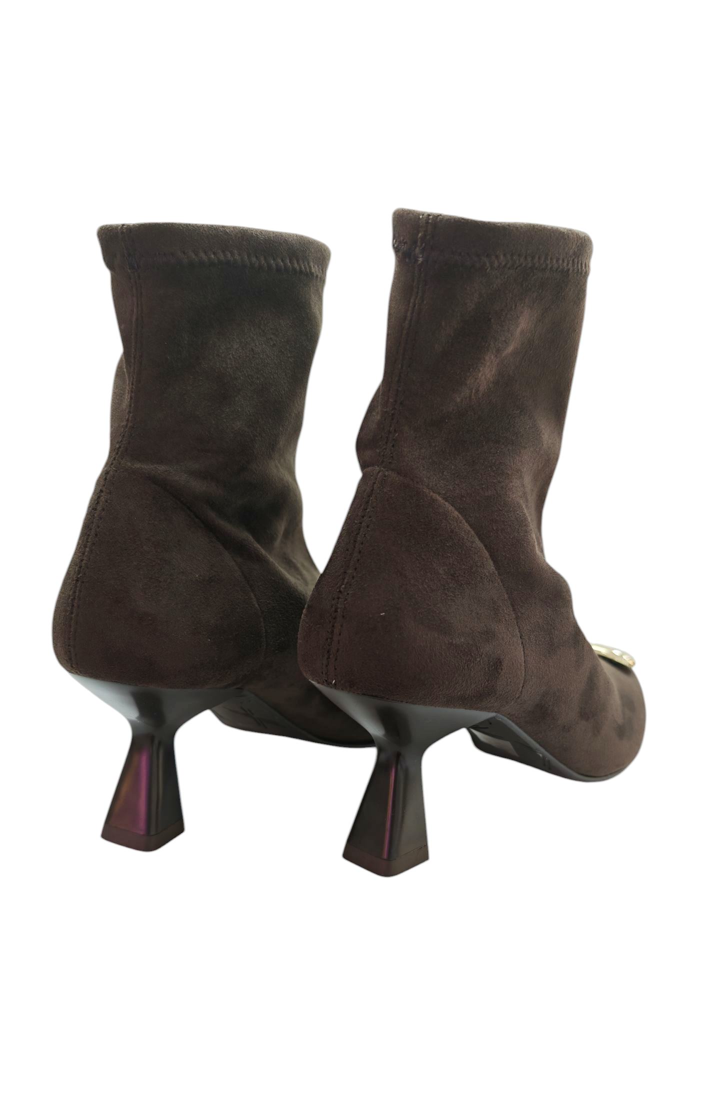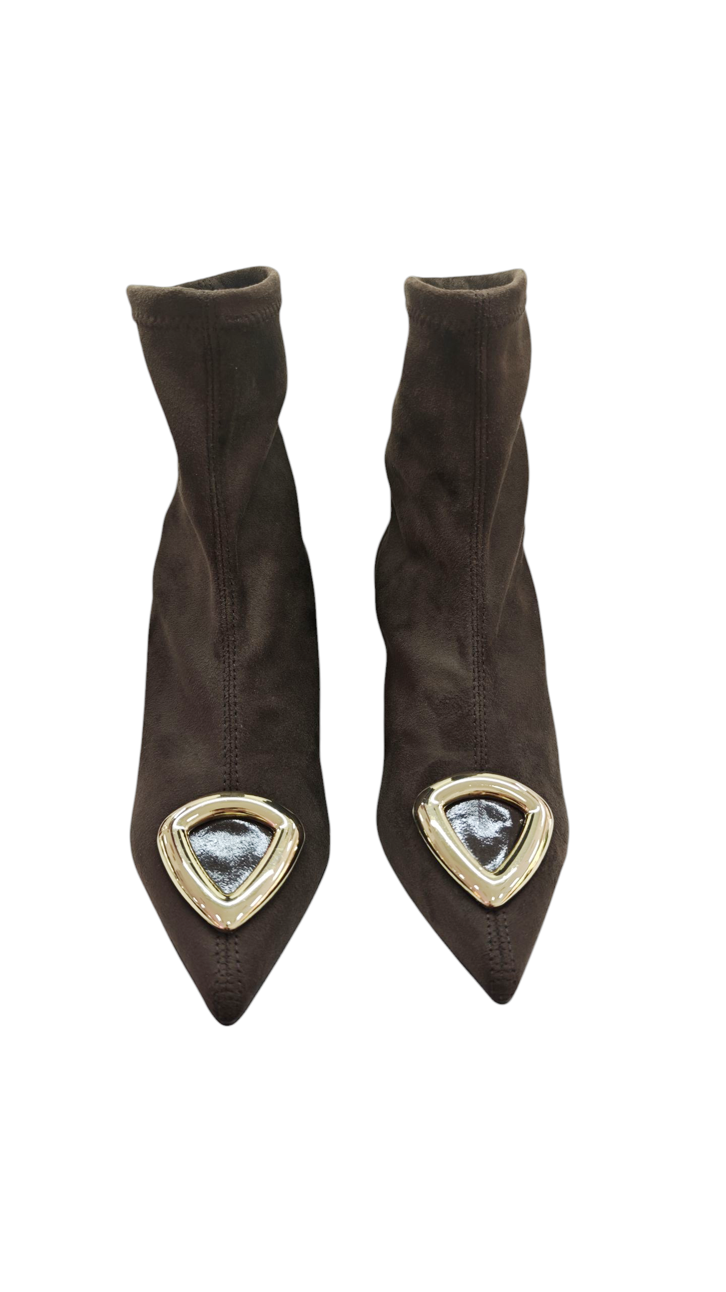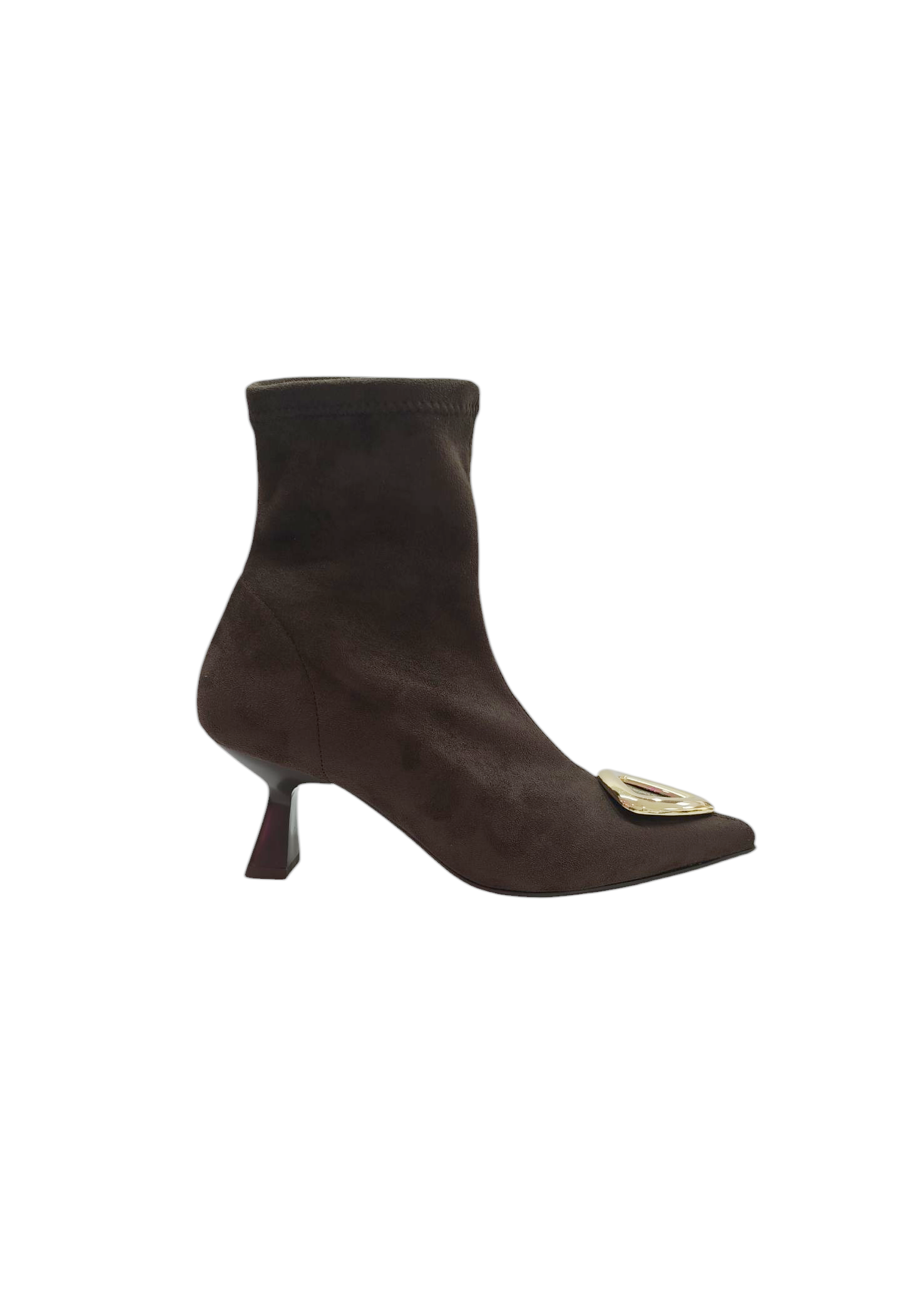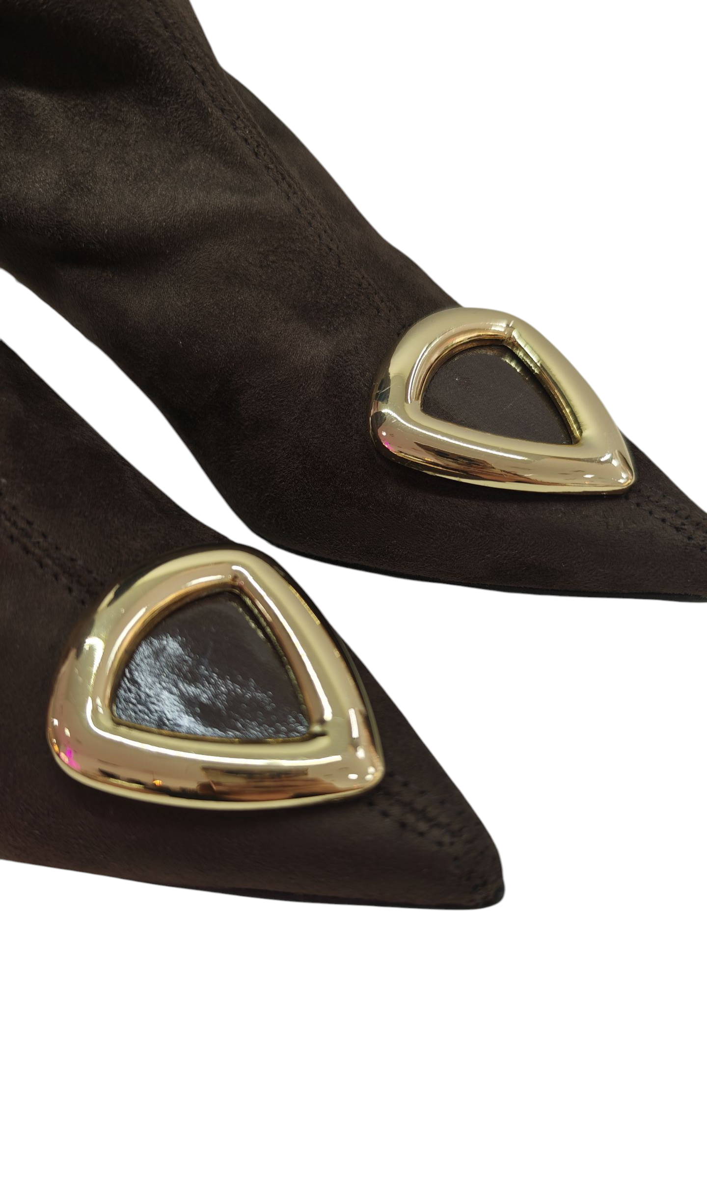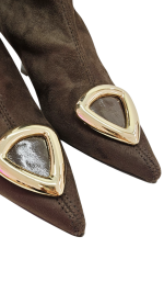 El aliado perfecto para darle power a tus looks. Su acabado en antelina chocolate con Lycra lo hace ultra versátil, mientras que la punta afilada con adorno oro y el tacón medio forma gritan pura sofisticación.