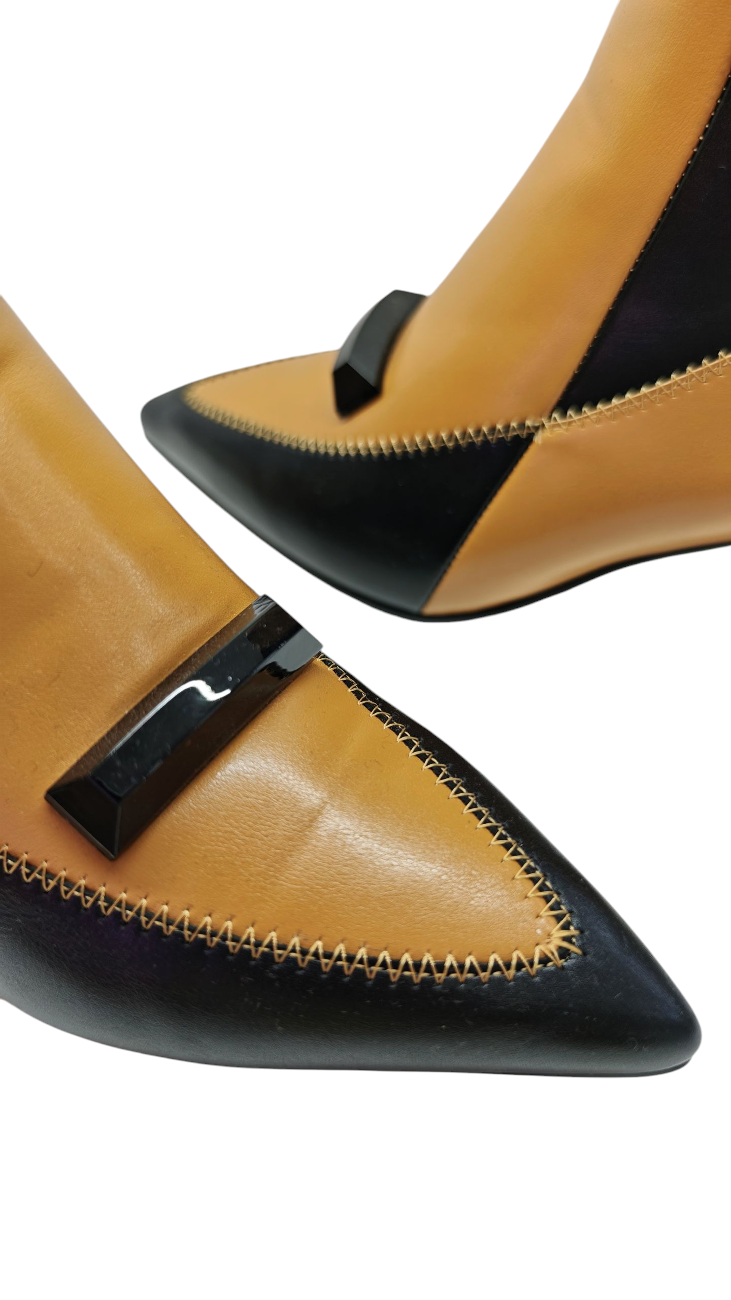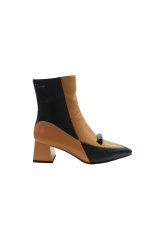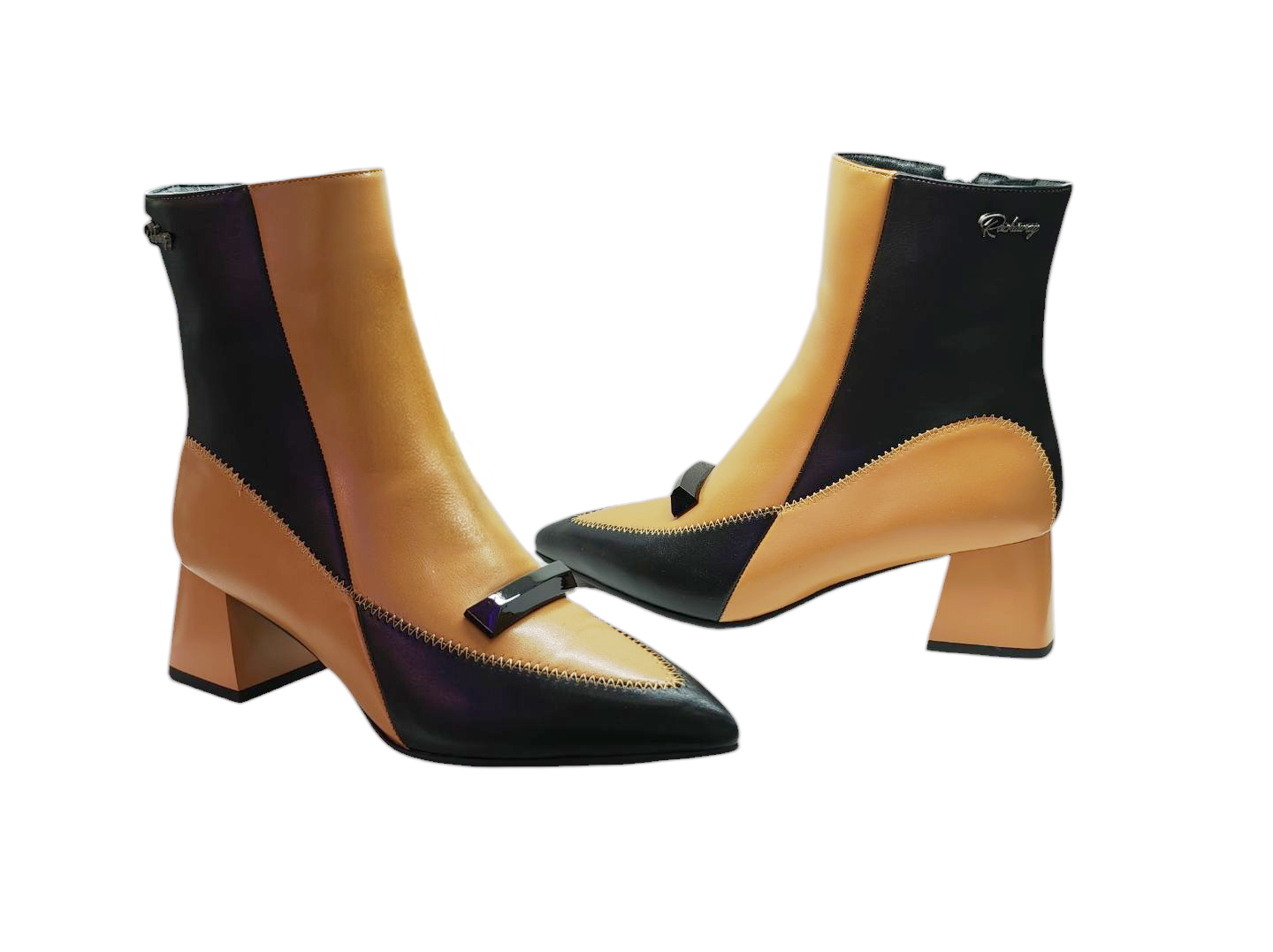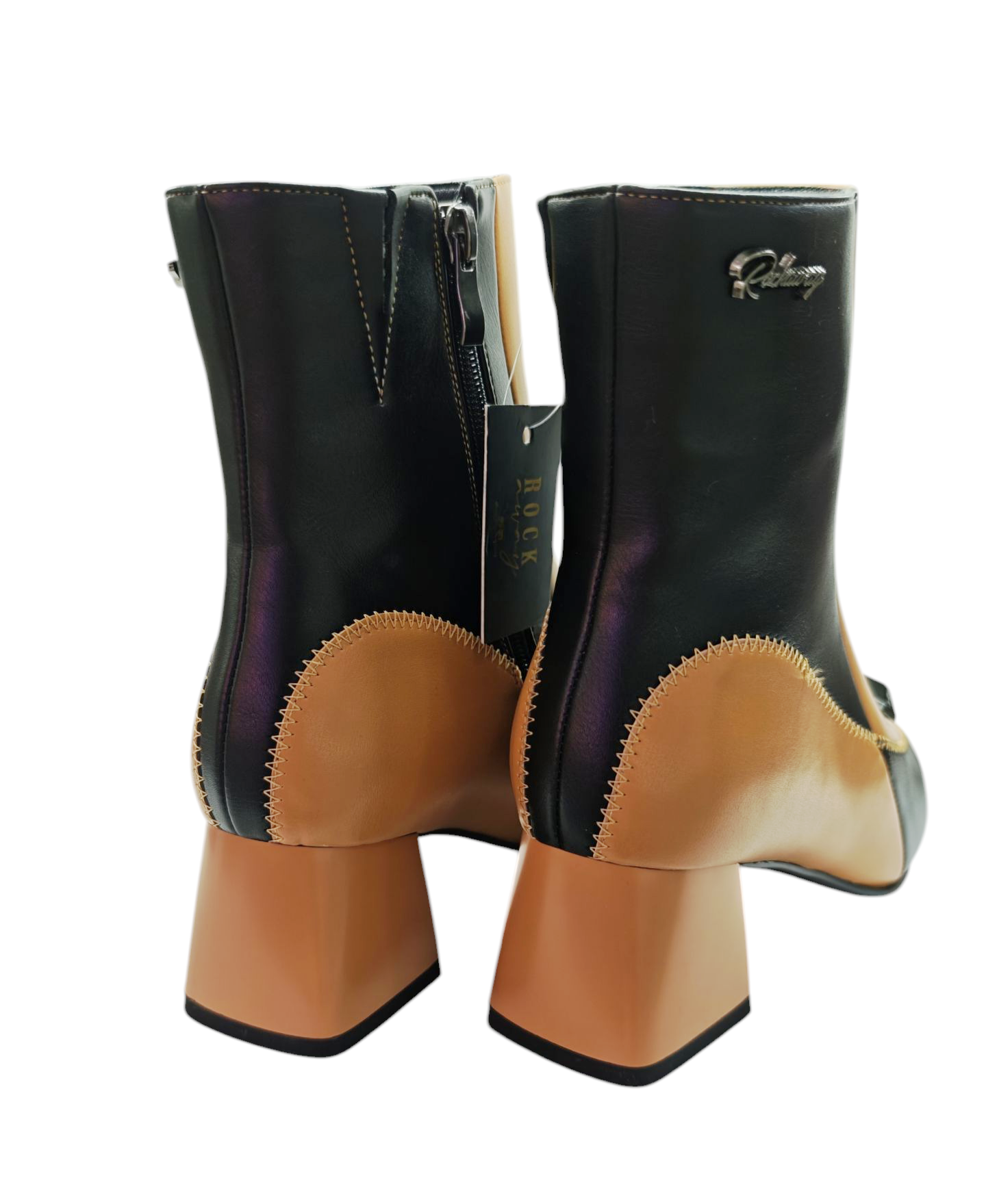 🔥 “Botín dos tonos, elegante y cañero, pensado para quienes pisan fuerte sin renunciar a la comodidad. Su diseño geométrico en beige y marrón marca tendencia, mientras el tacón medio le da ese toque salvaje que lo hace único. La puntera afilada estiliza al máximo, y su detalle frontal le pone el broche moderno. Súper cómodo para llevar todo el día, pero con el estilo suficiente para brillar de noche.”