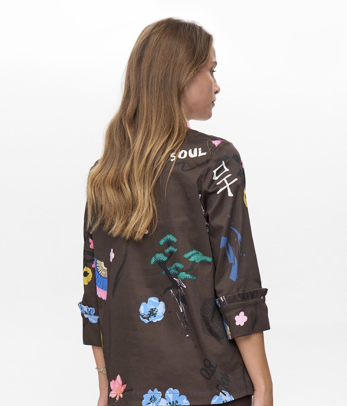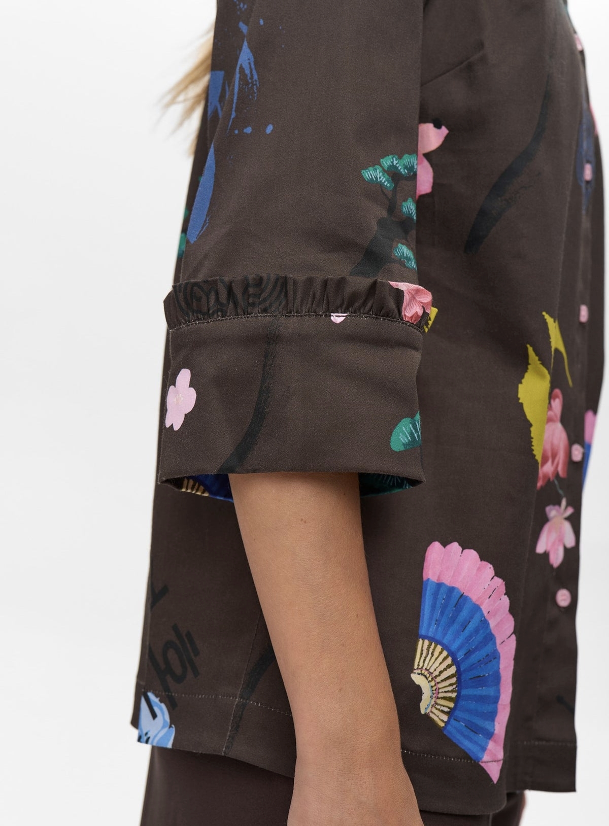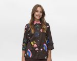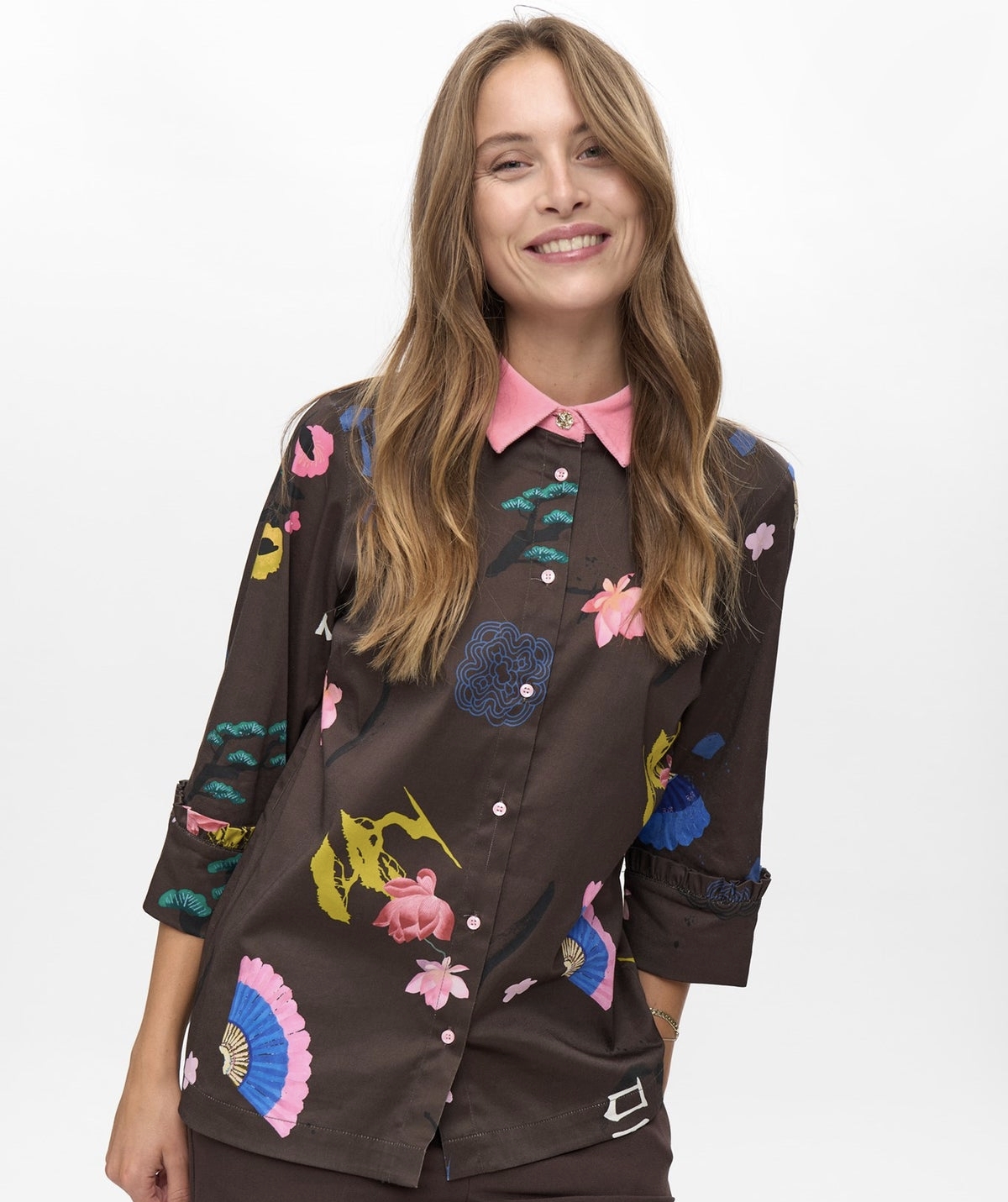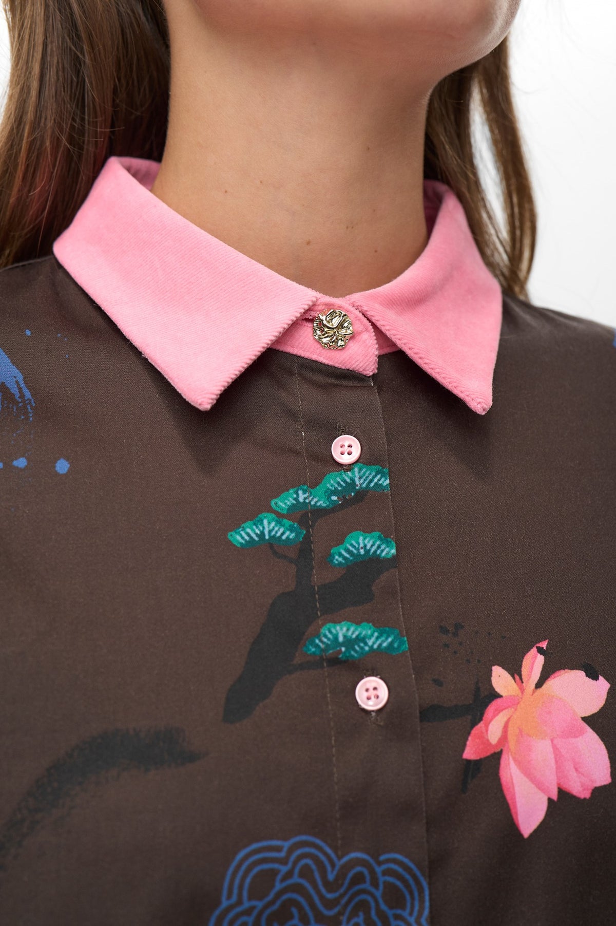 Sobre camisa Chán, con cuello en terciopelo rosa y botones al tono.