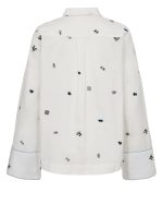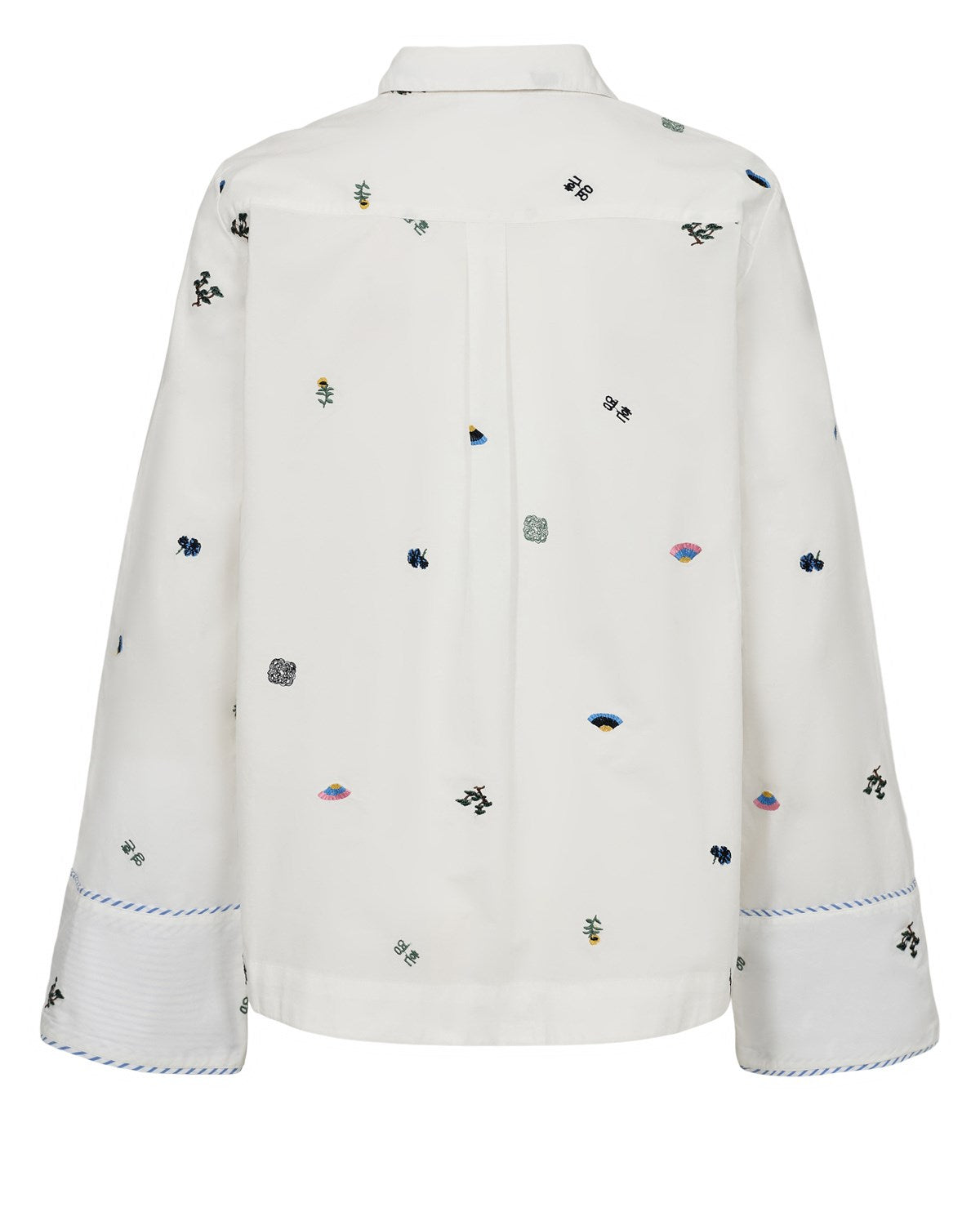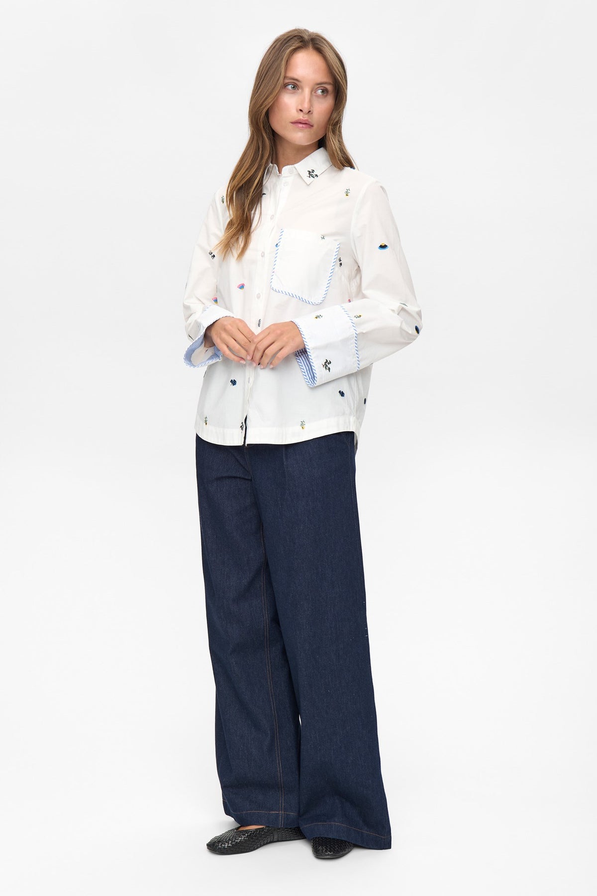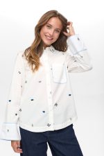 Una camisa blanca con rollazo propio. 🌈 Su tejido suave y los pequeños bordados multicolor le dan ese toque divertido y chic que levanta cualquier look sin esfuerzo. Los detalles de vivos en azul y el bolsillo con borde a rayas la hacen aún más especial. Perfecta para llevar con vaqueros o para darle un giro fresco a un outfit más formal.