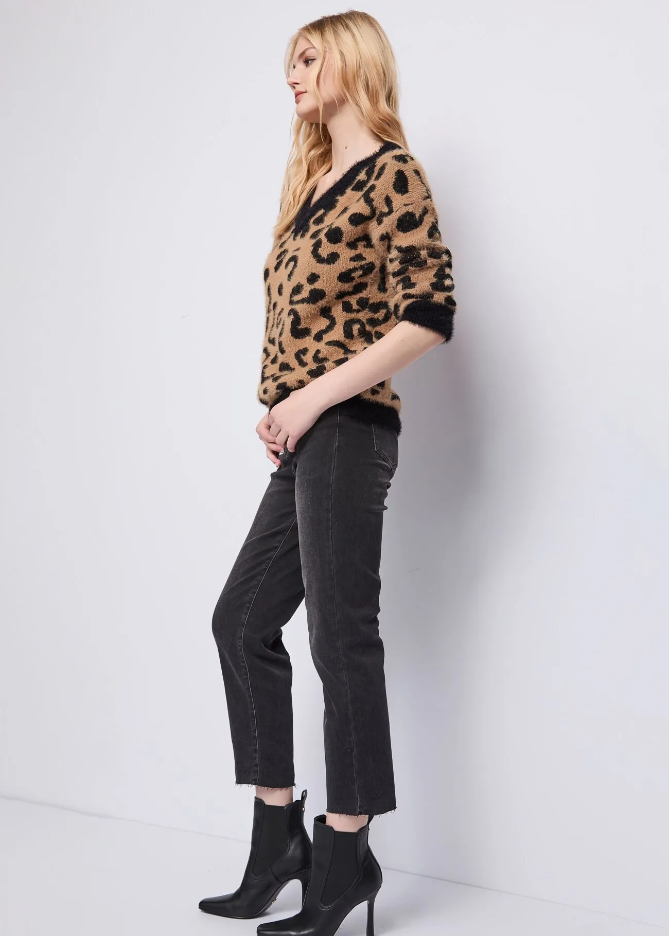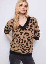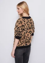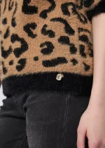Jersey de punto con estampado animal jacquard integral, cuello en pico y adorno de pedrería en el bajo.