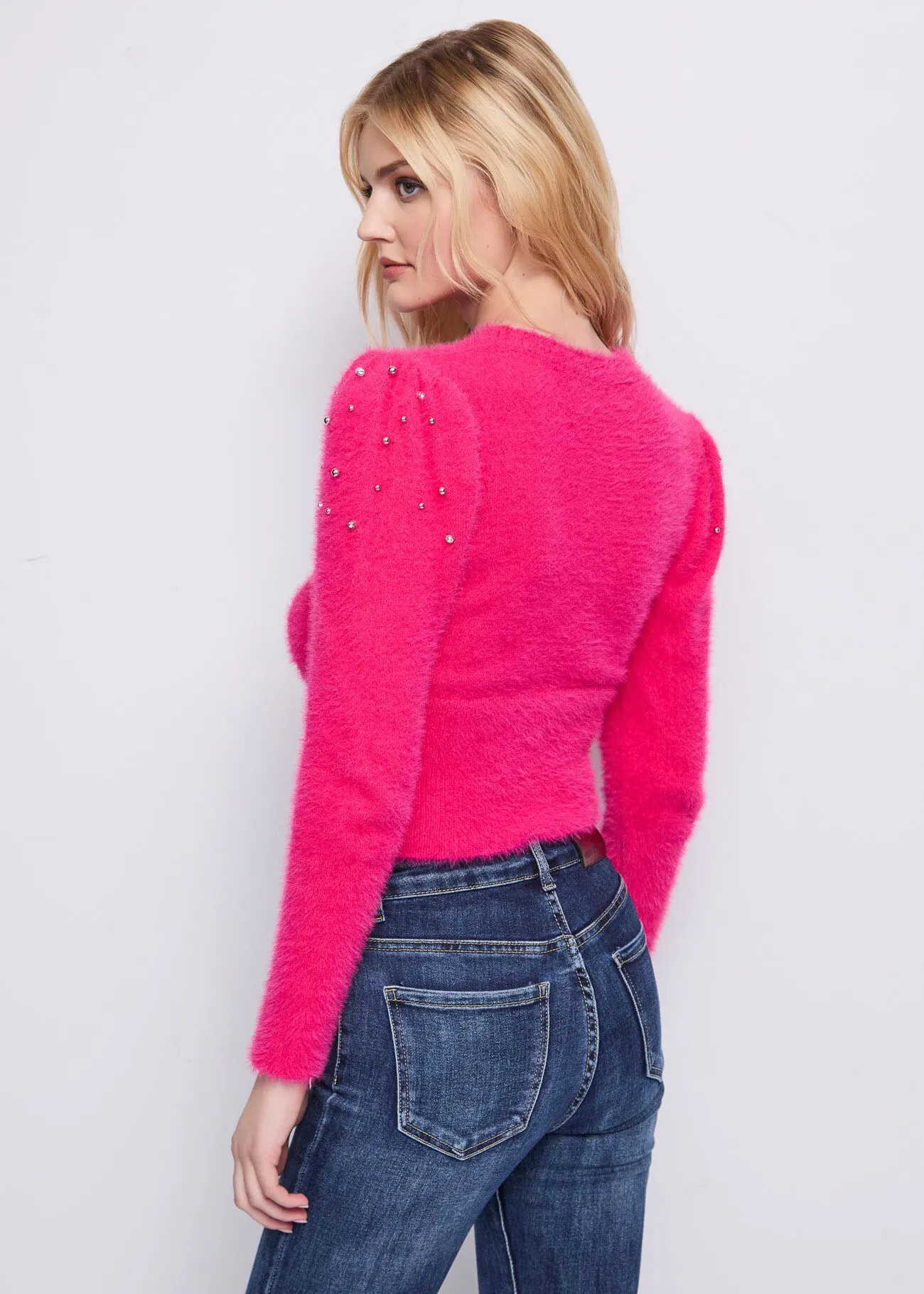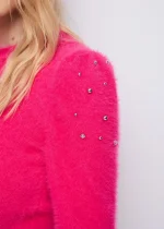 Jersey de pelito con apliques de pedrería y tachuelas, cuello redondo y adorno de pedrería en el bajo.