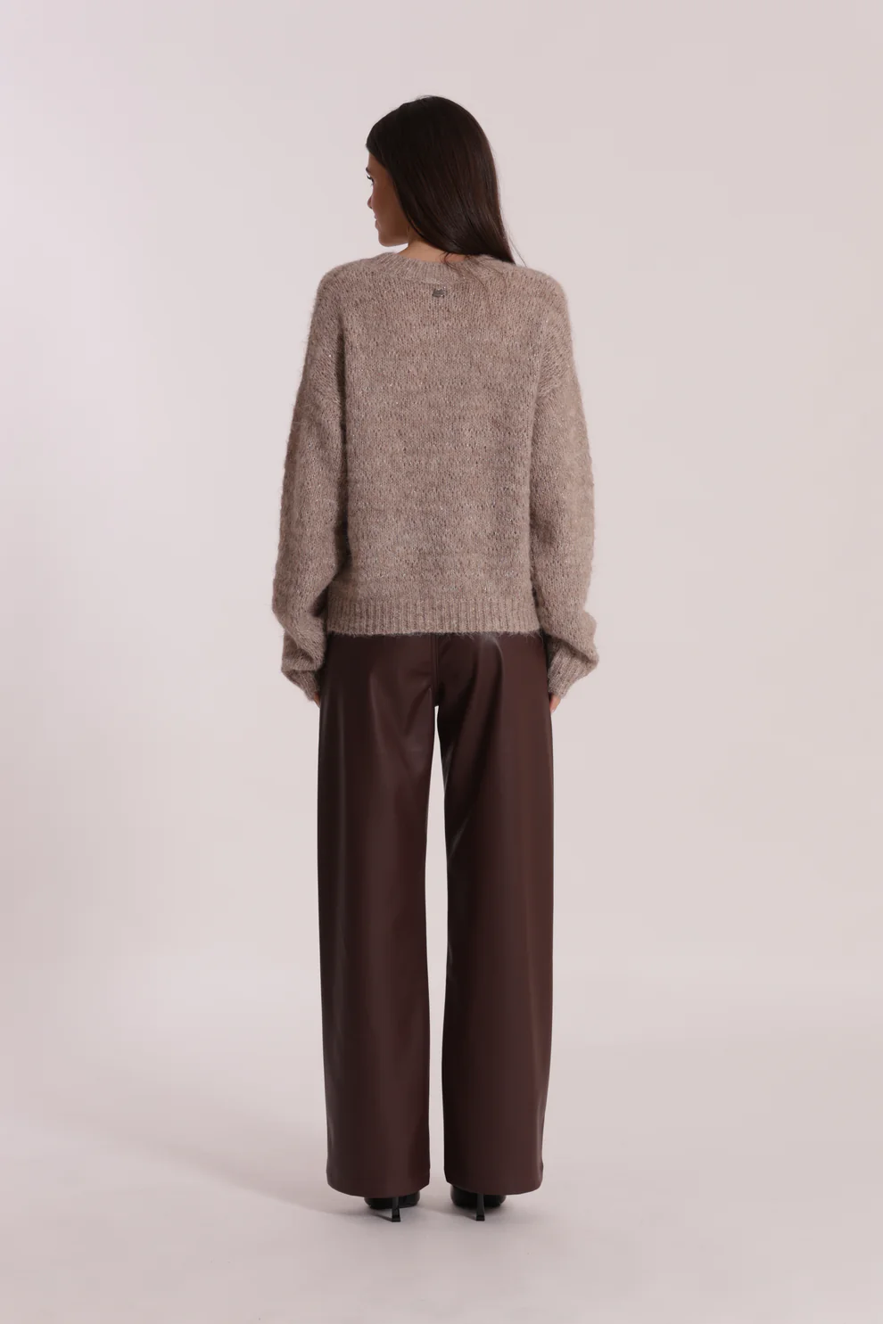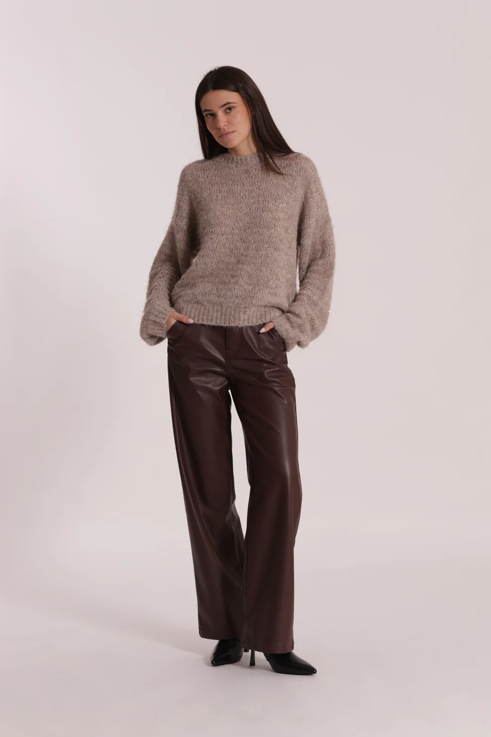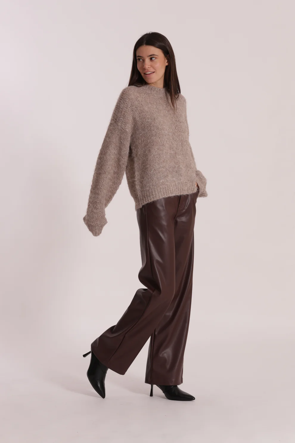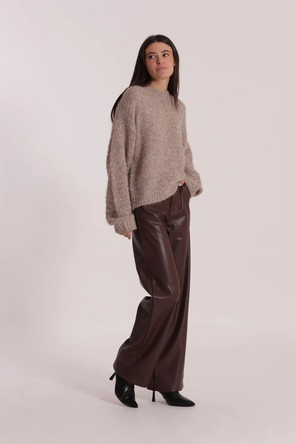 Pantalón corte wide leg, efecto piel en el color de la temporada, ideal para un look sofisticado y moderno.
