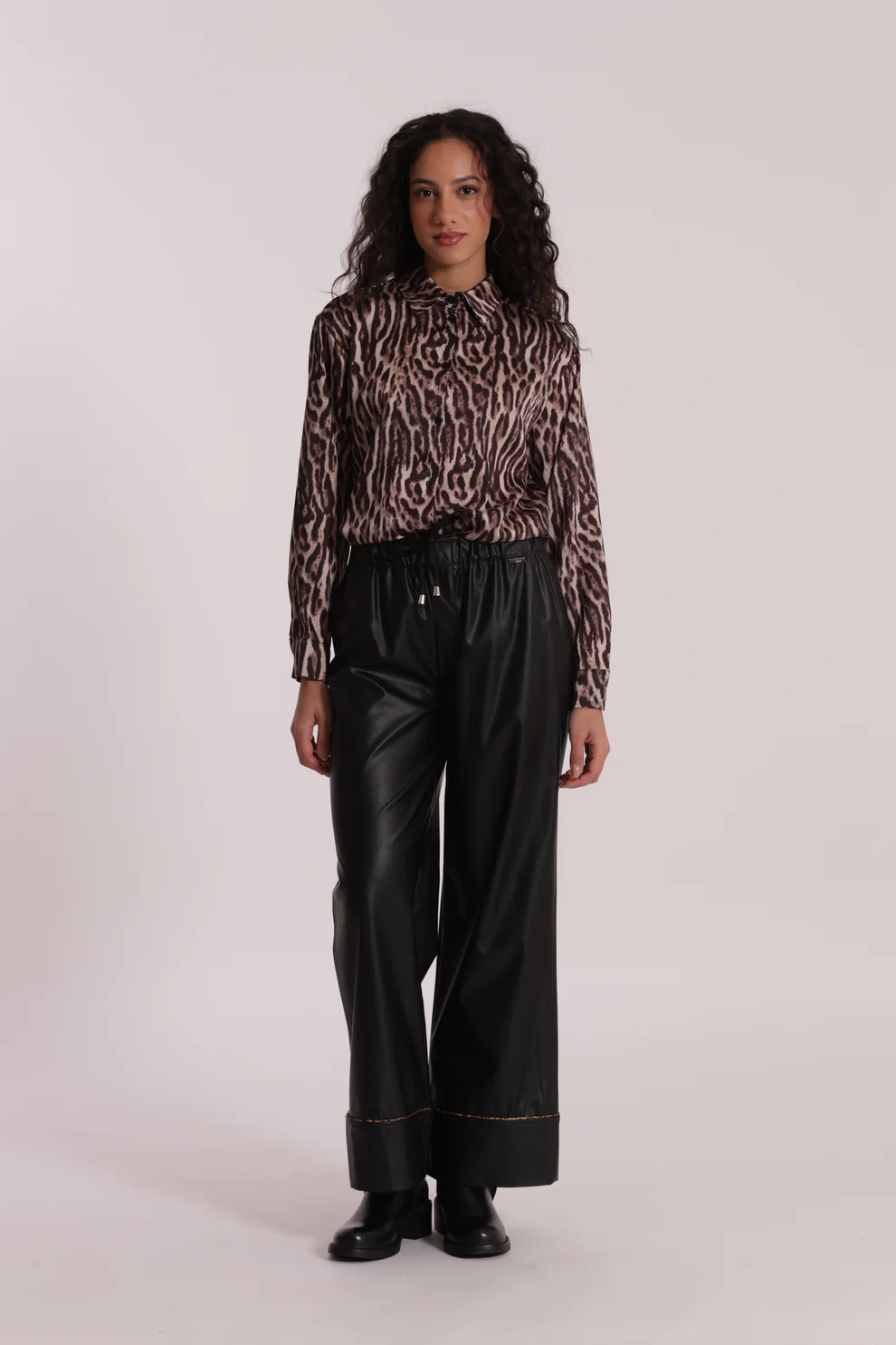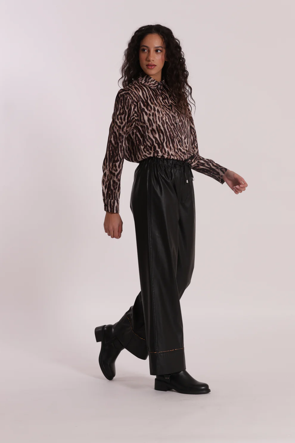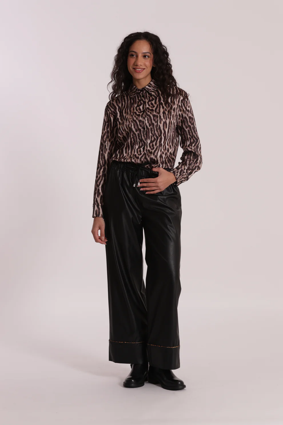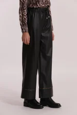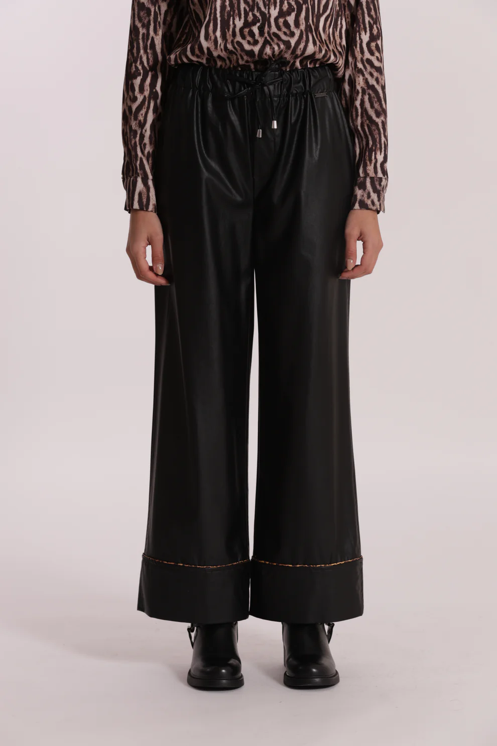 Pantalón corte palazzo, efeto piel, ideal para combinarlo con nuestro top lencero y obtener un look muy rockero y desenfadado.