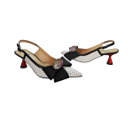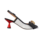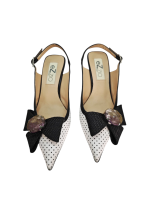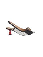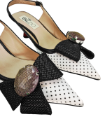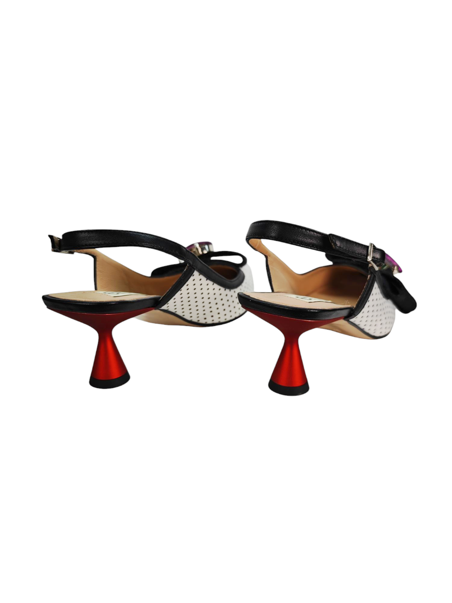 Este elegante zapato de tacón medio combina estilo retro con detalles modernos. Su diseño tipo slingback (con correa trasera descubierta) presenta un estampado de lunares negros sobre fondo blanco, evocando un aire vintage y sofisticado. El adorno principal es un gran lazo negro de textura tejida en la parte delantera, coronado por una piedra ovalada brillante en tonos morado y dorado, que aporta un toque de glamour. El tacón es de forma cónica, en un vibrante color rojo con base negra, que le da un contraste llamativo y distintivo al conjunto. El interior del zapato es de un tono nude claro, ofreciendo comodidad y legancia