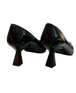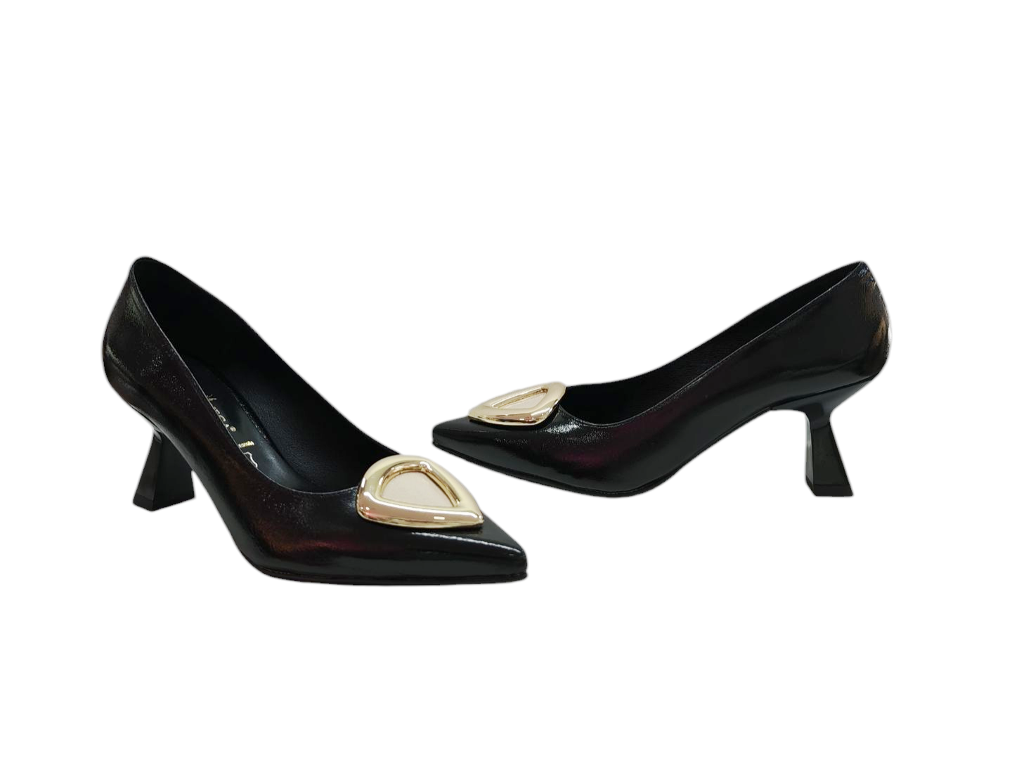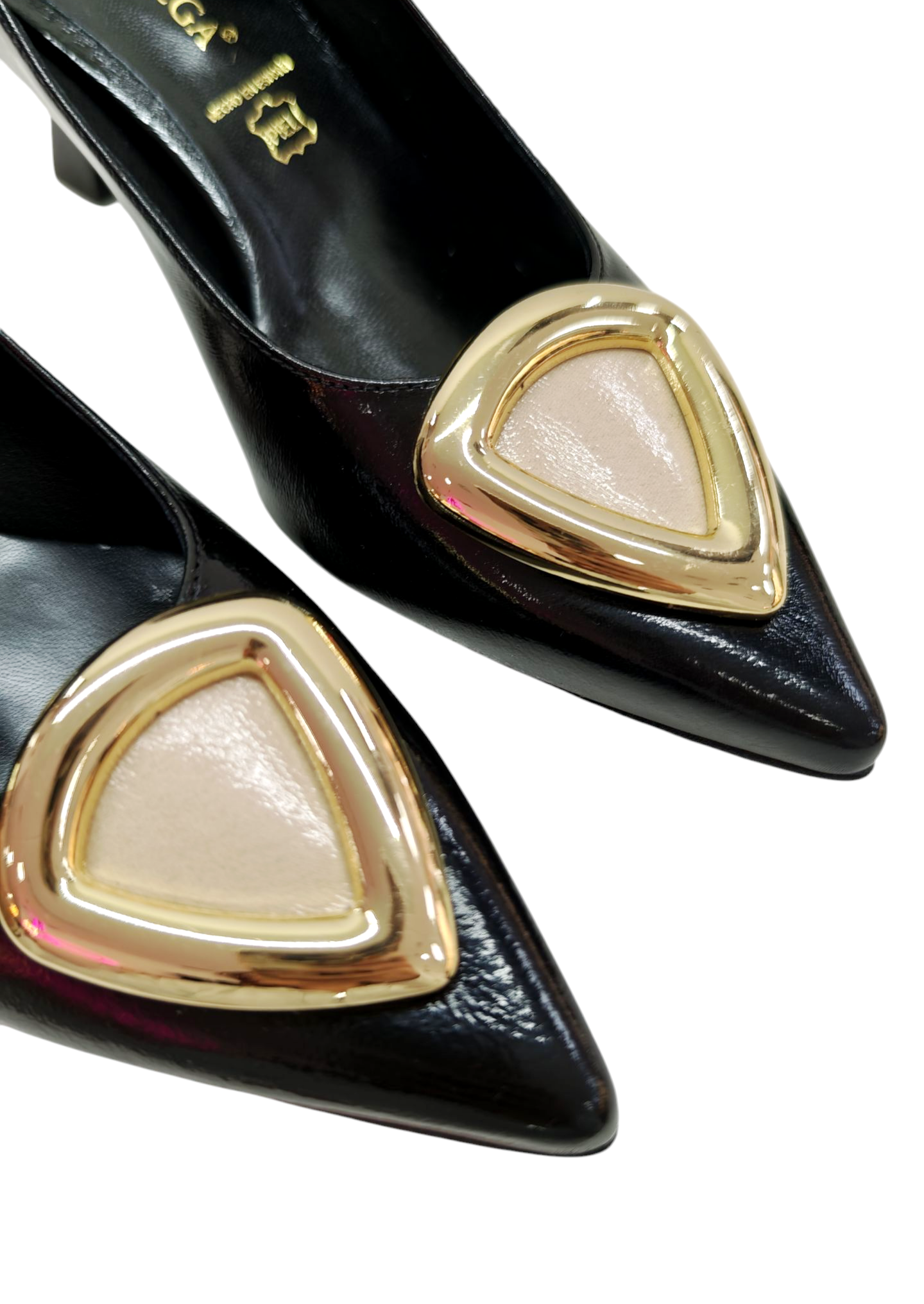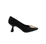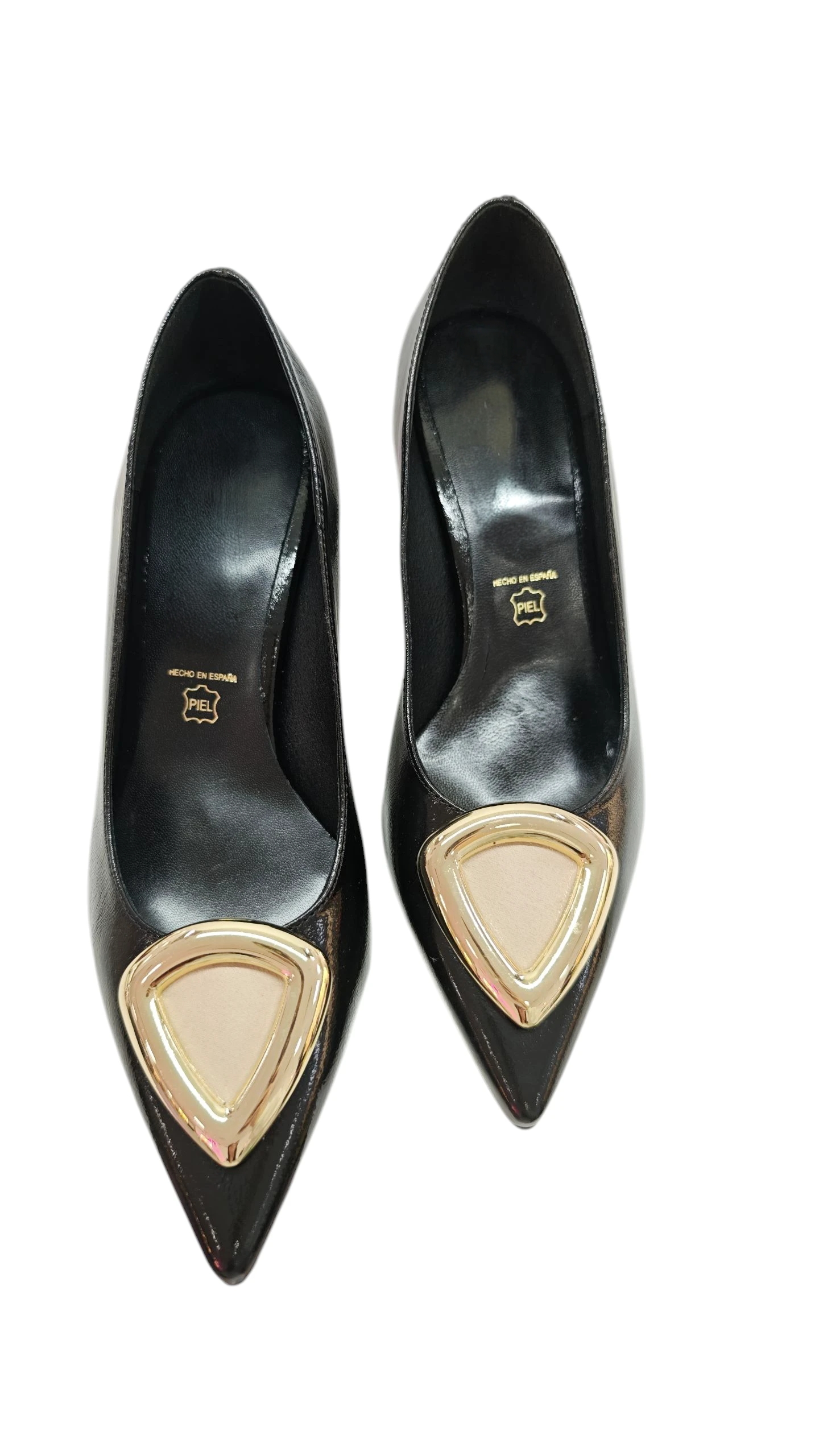 Cuando la comodidad se une con el estilo más cañero, nace este salón que no pasa desapercibido. Su acabado negro con esa decoración oro con interior beige, es puro glamour.El tacón medio original y cómodo, le da ese punto rebelde que transforma cualquier look básico en un outfit con personalidad.