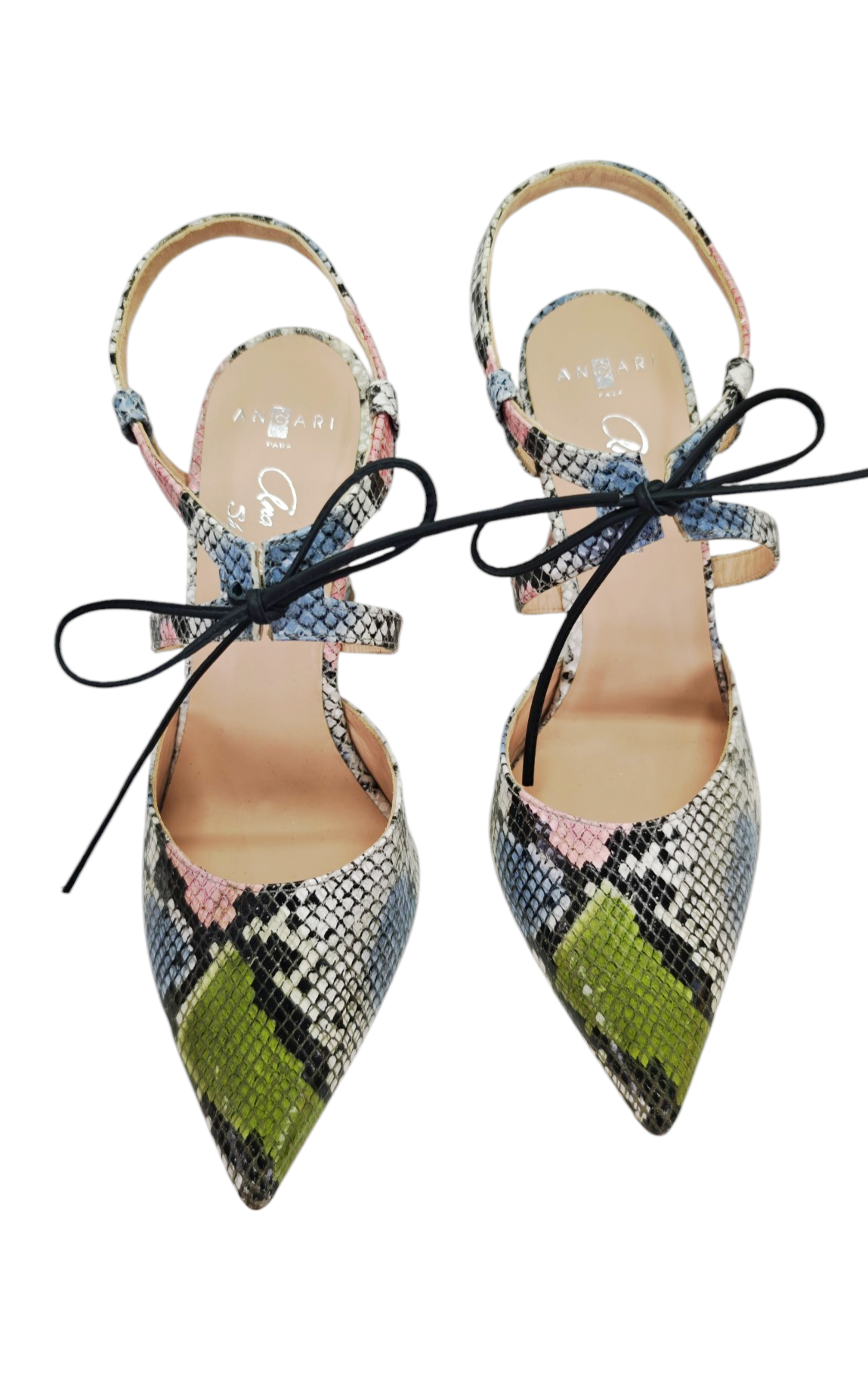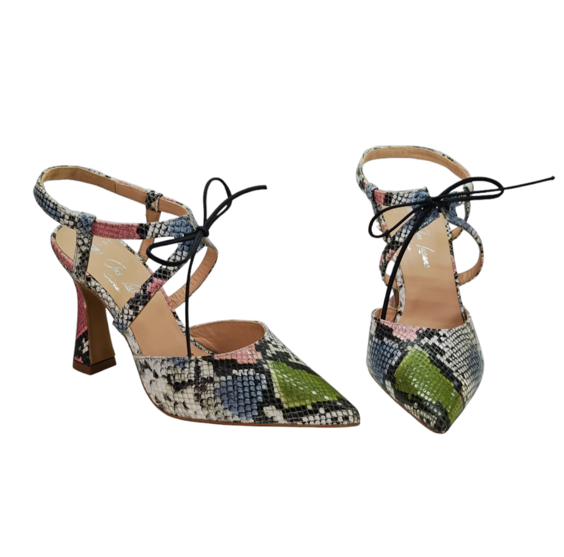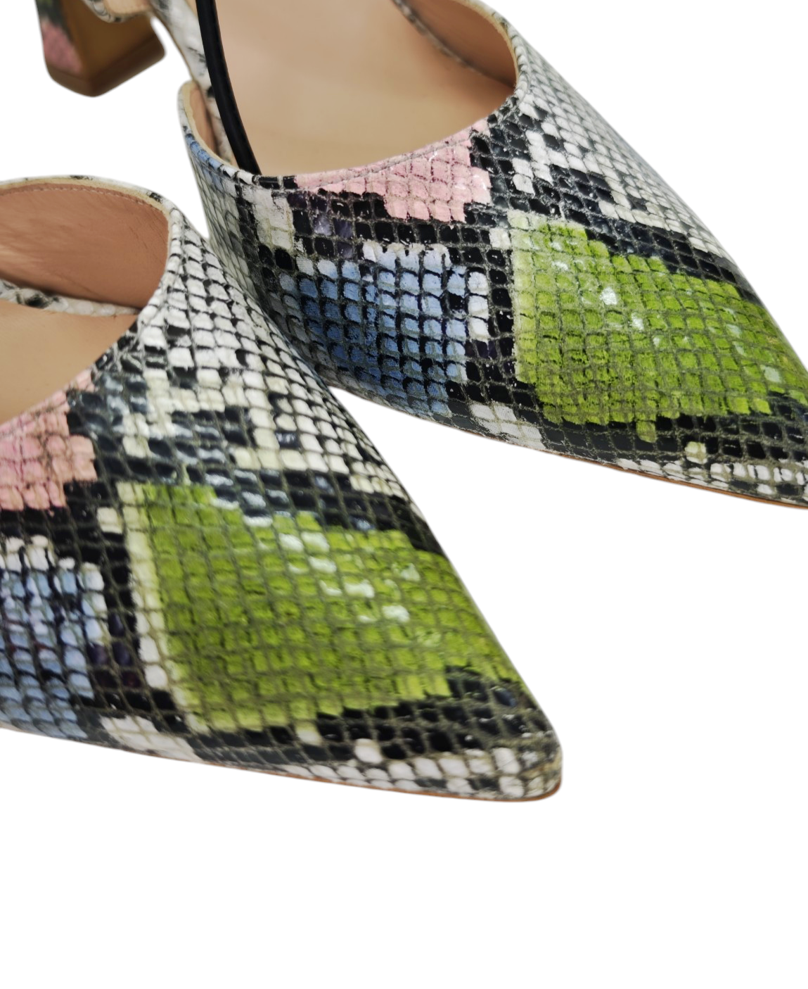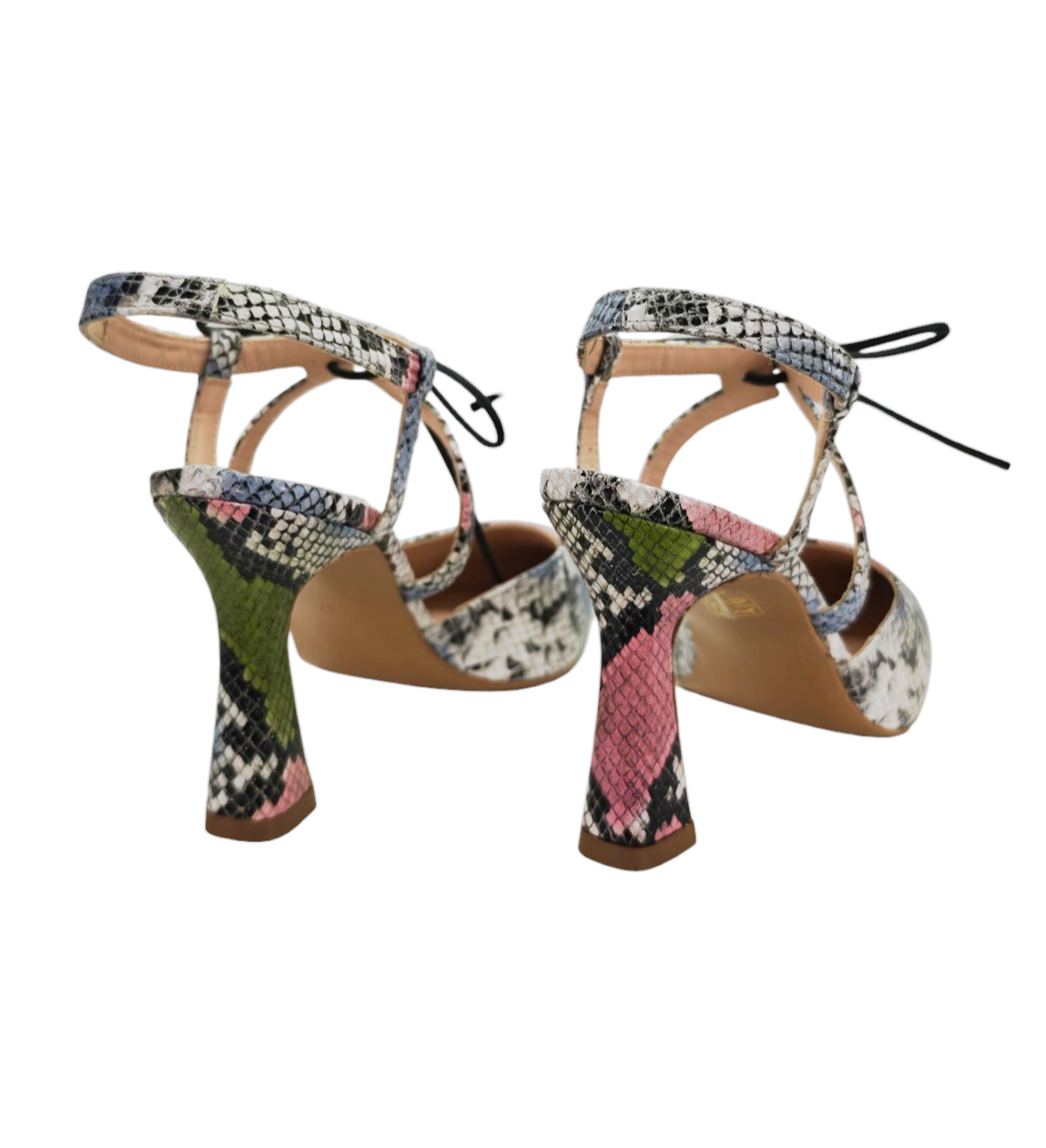Su acabado en efecto piel serpiente se mezcla con pinceladas en rosa, verde y azul que parecen pequeñas obras abstractas sobre la horma.