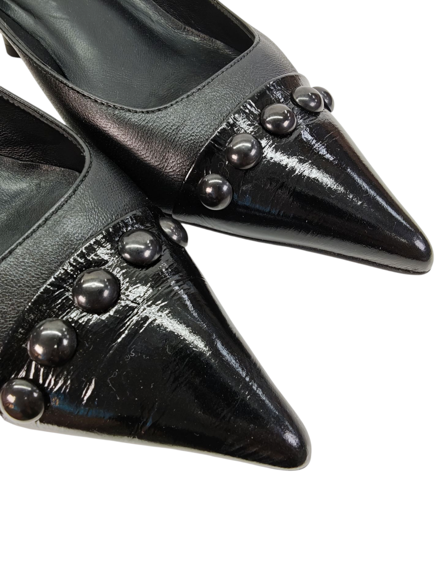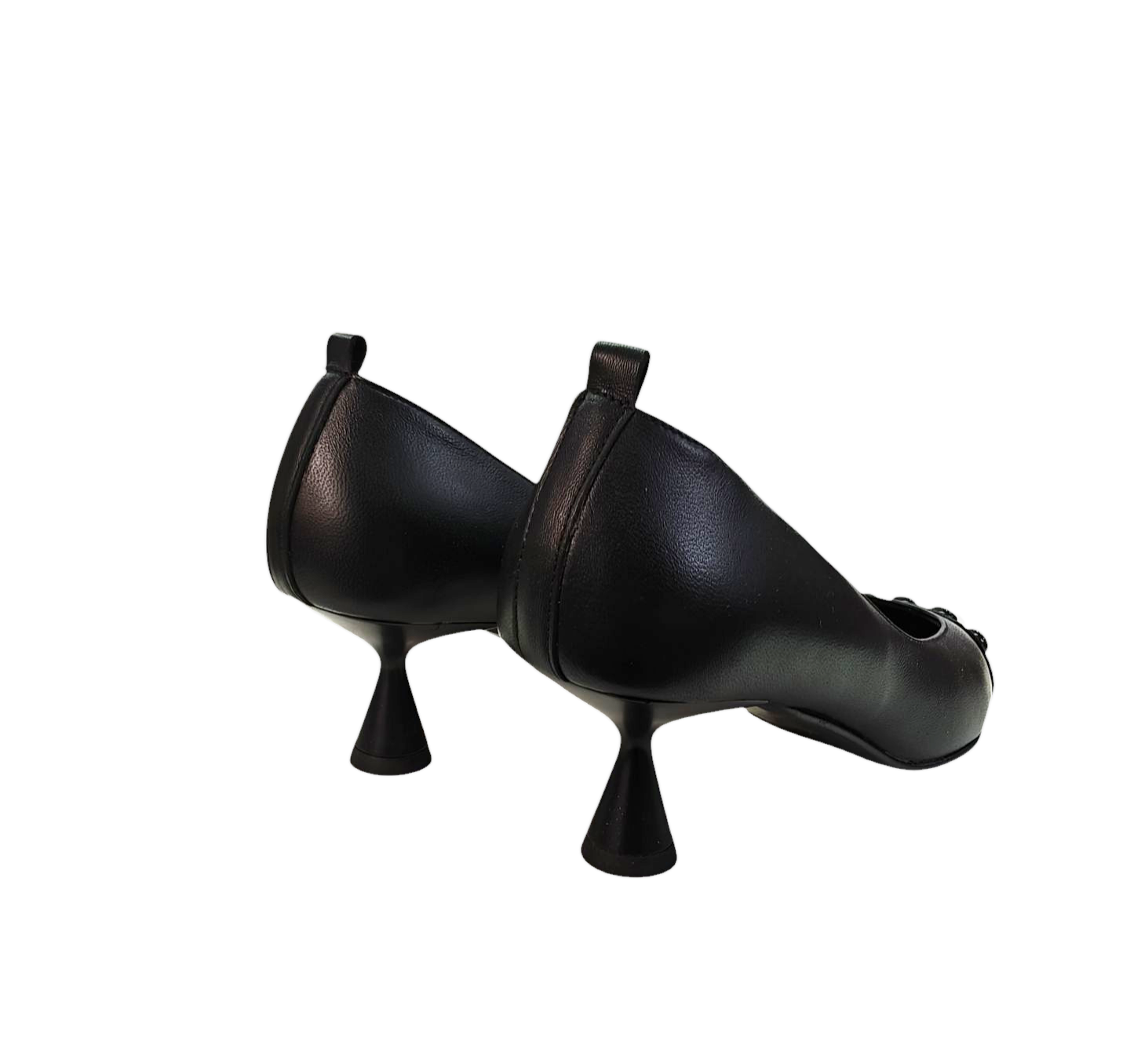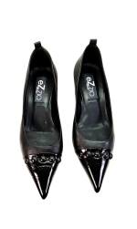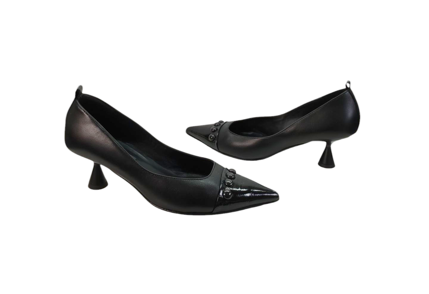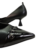 El clásico salón negro se reinventa con un toque futurista. Su tacón acampanado aporta una silueta moderna y atrevida, mientras que la puntera afilada en charol con detalles de mini botones le da ese twist sofisticado que no pasa desapercibido.