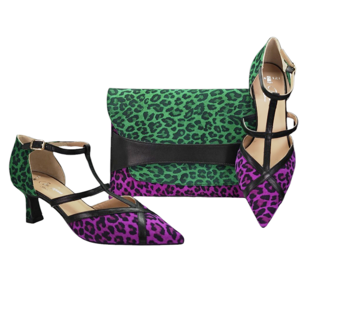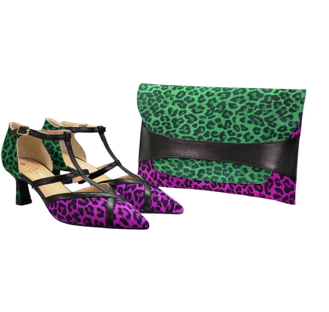 Este salón de inspiración retro reinventa el animal print en una combinación inesperada y magnética: talón en leopardo verde esmeralda y puntera en leopardo fucsia vibrante. Dos energías que dialogan sin pedir permiso.