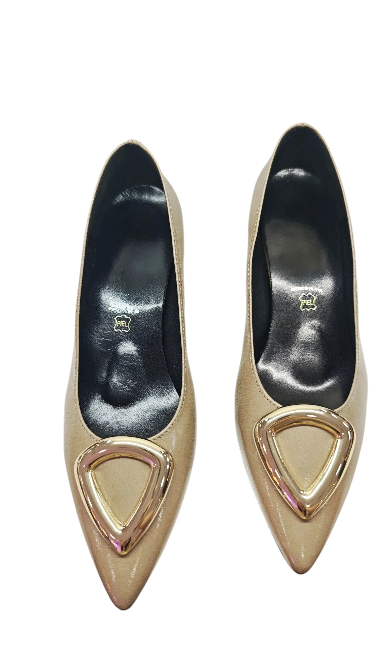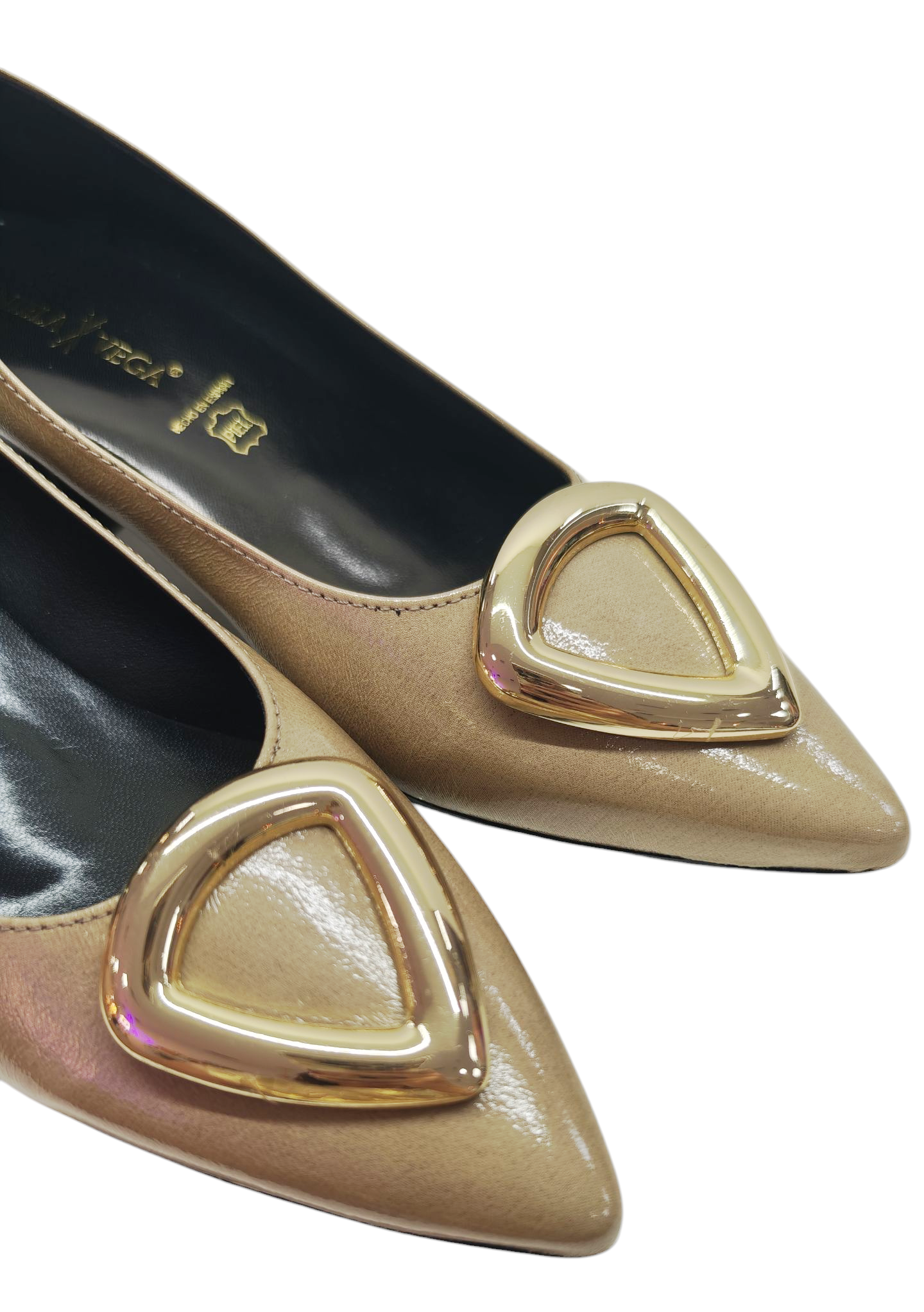 Cuando la comodidad se une con el estilo más cañero, nace este salón que no pasa desapercibido. Su acabado nude con destellos sutiles es puro glamour, mientras que el maxi detalle dorado en el empeine grita lujo en cada paso. El tacón geométrico, original y cómodo, le da ese punto rebelde que transforma cualquier look básico en un outfit con personalidad.