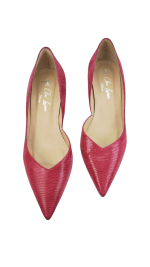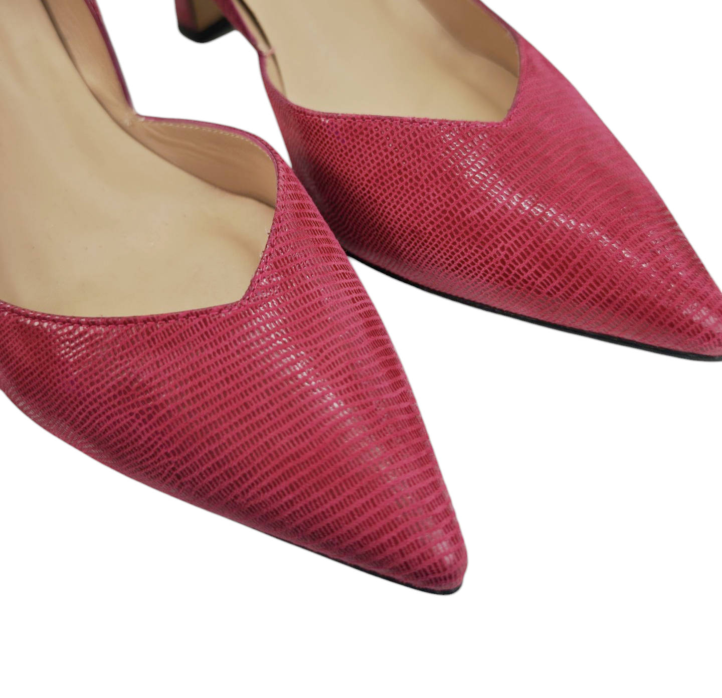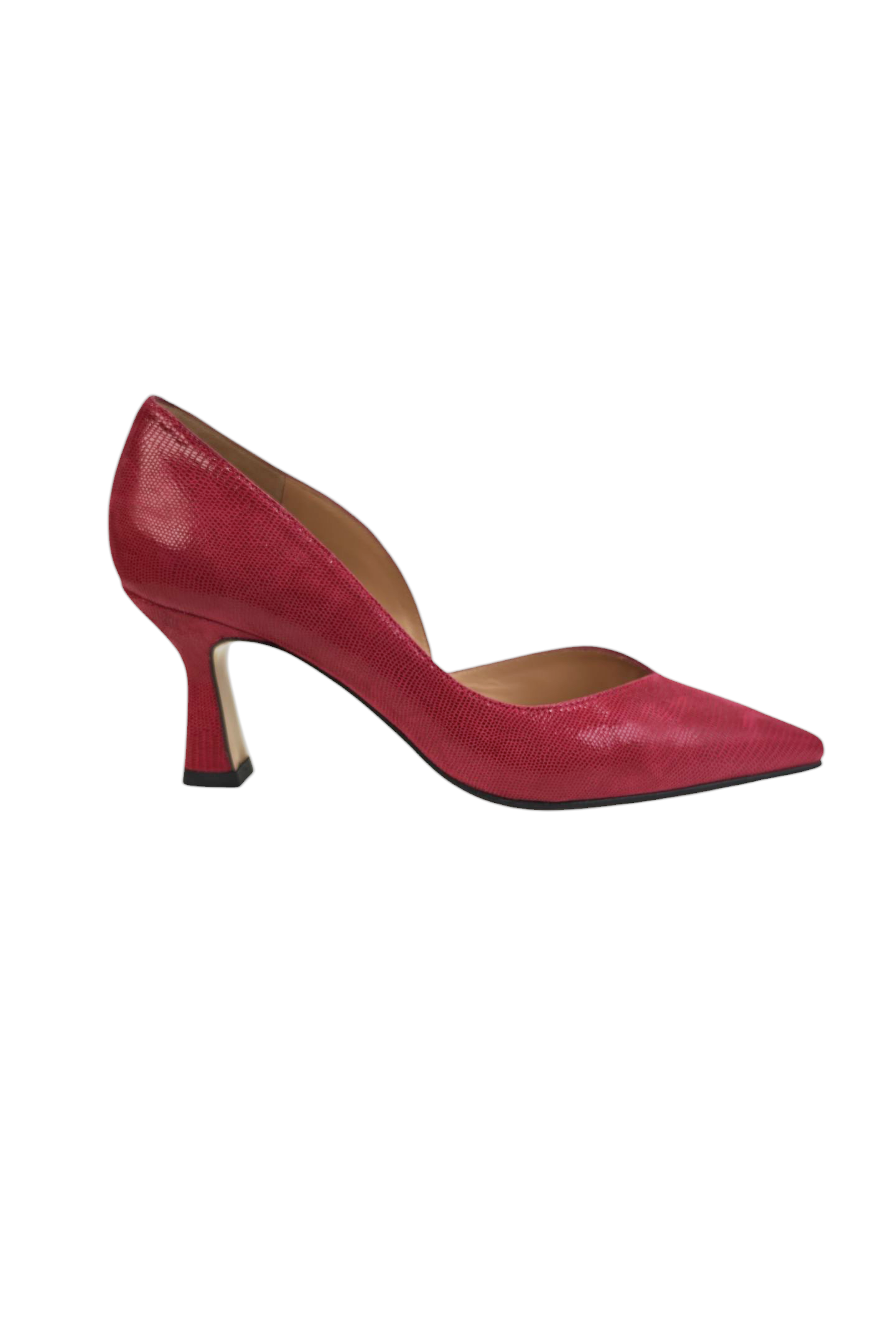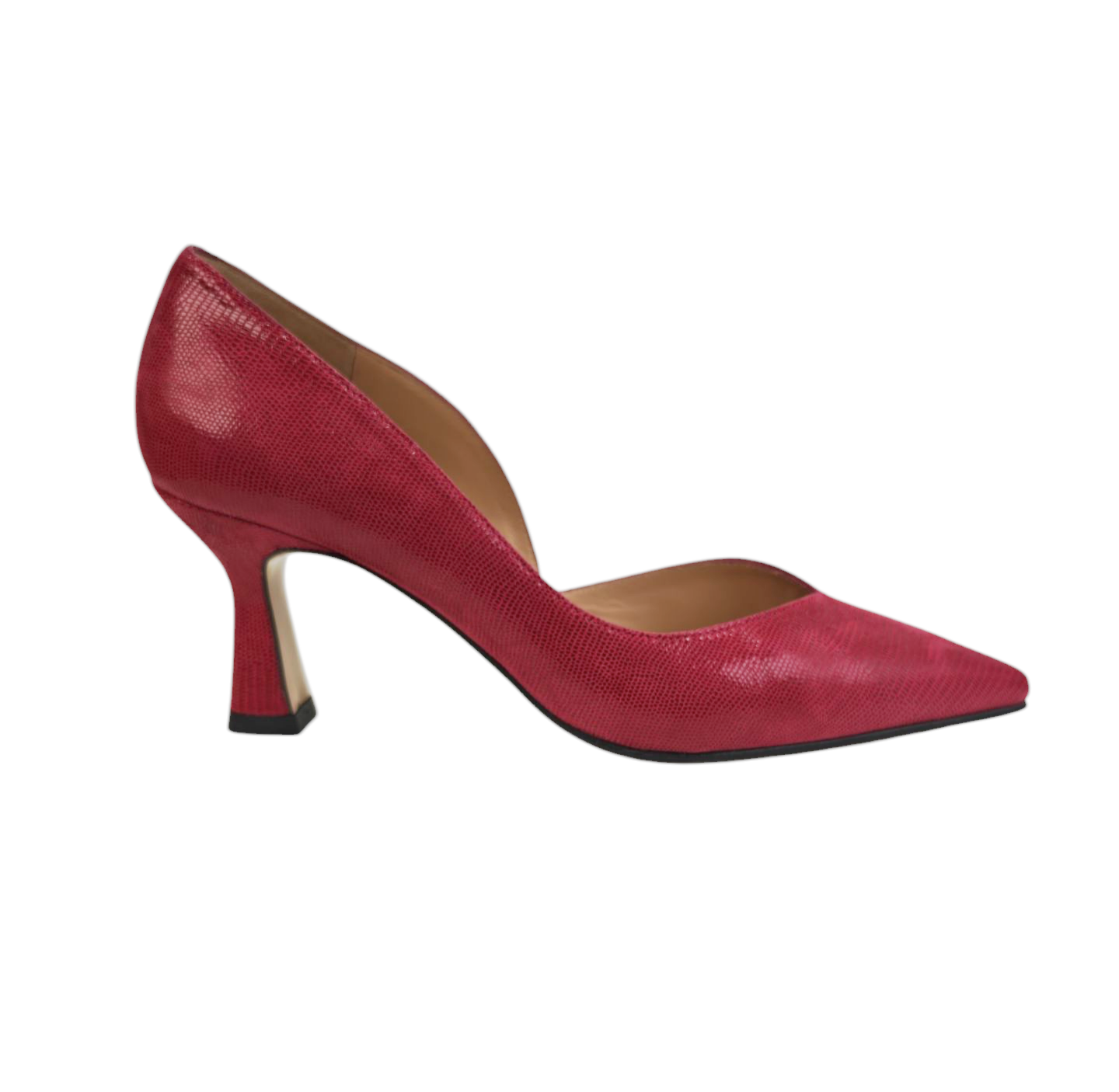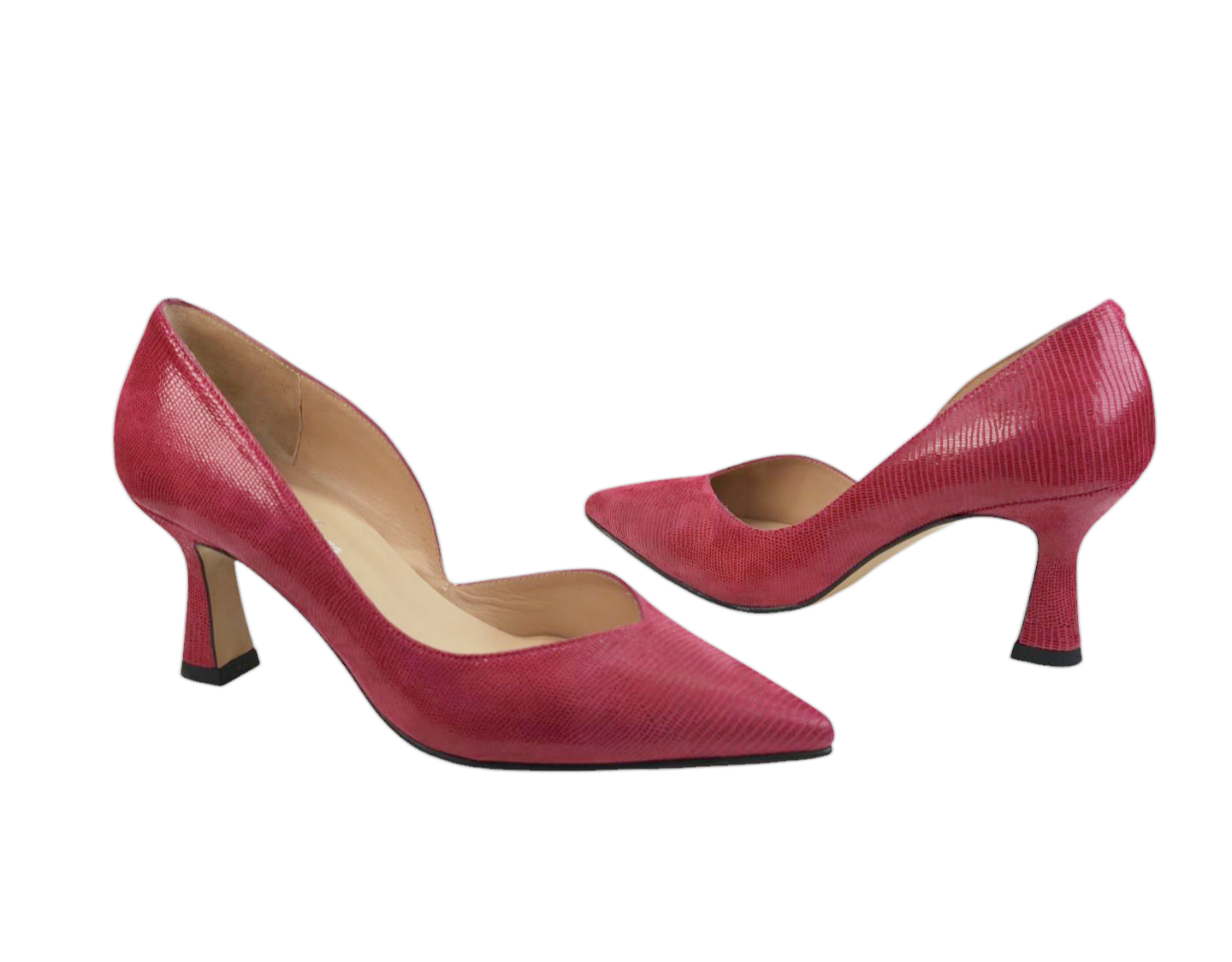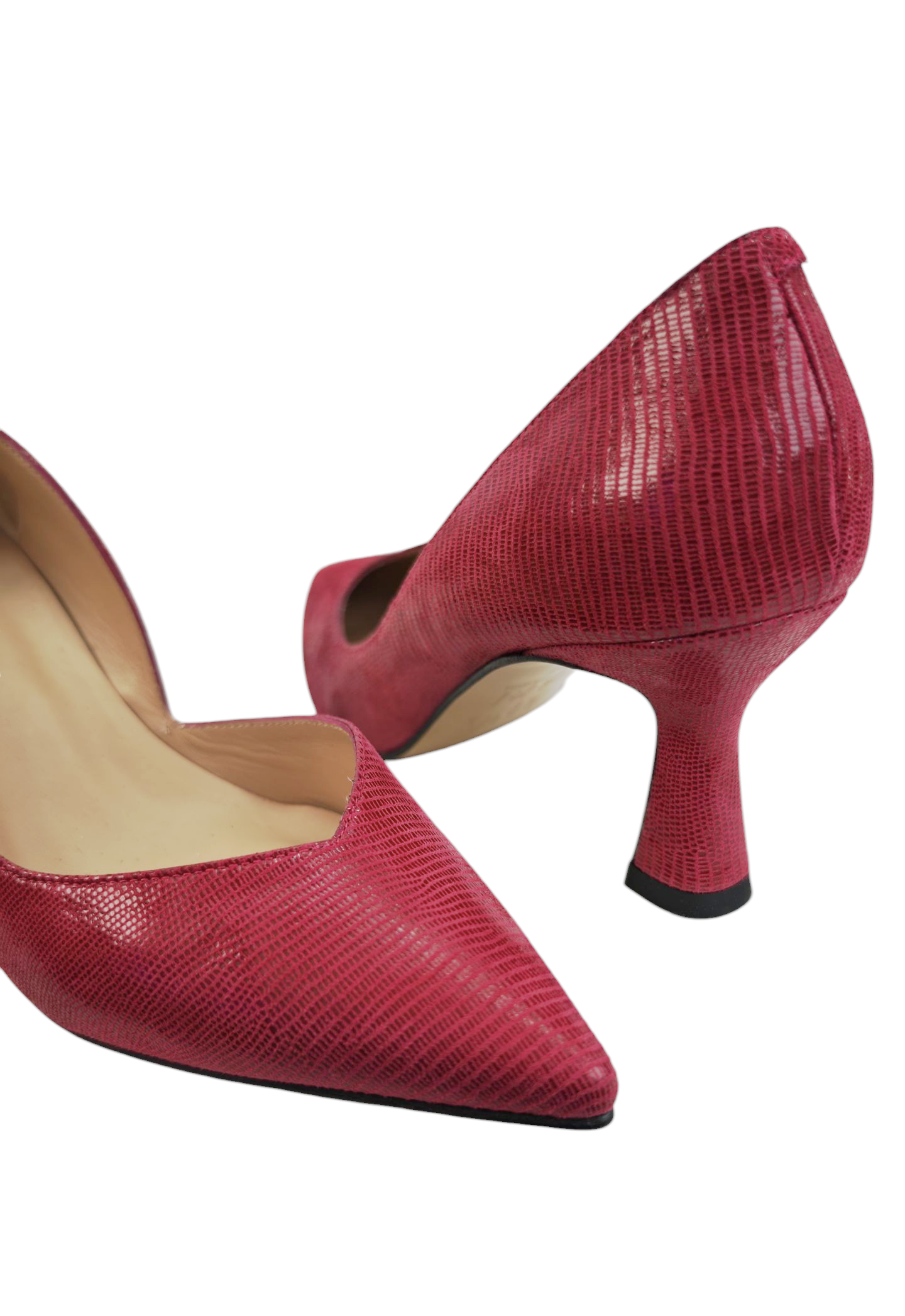 Déjate seducir por este salón de tacón medio en tono fresa con textura piel tejus: elegante, versátil y con ese punto atrevido que transforma cualquier look.