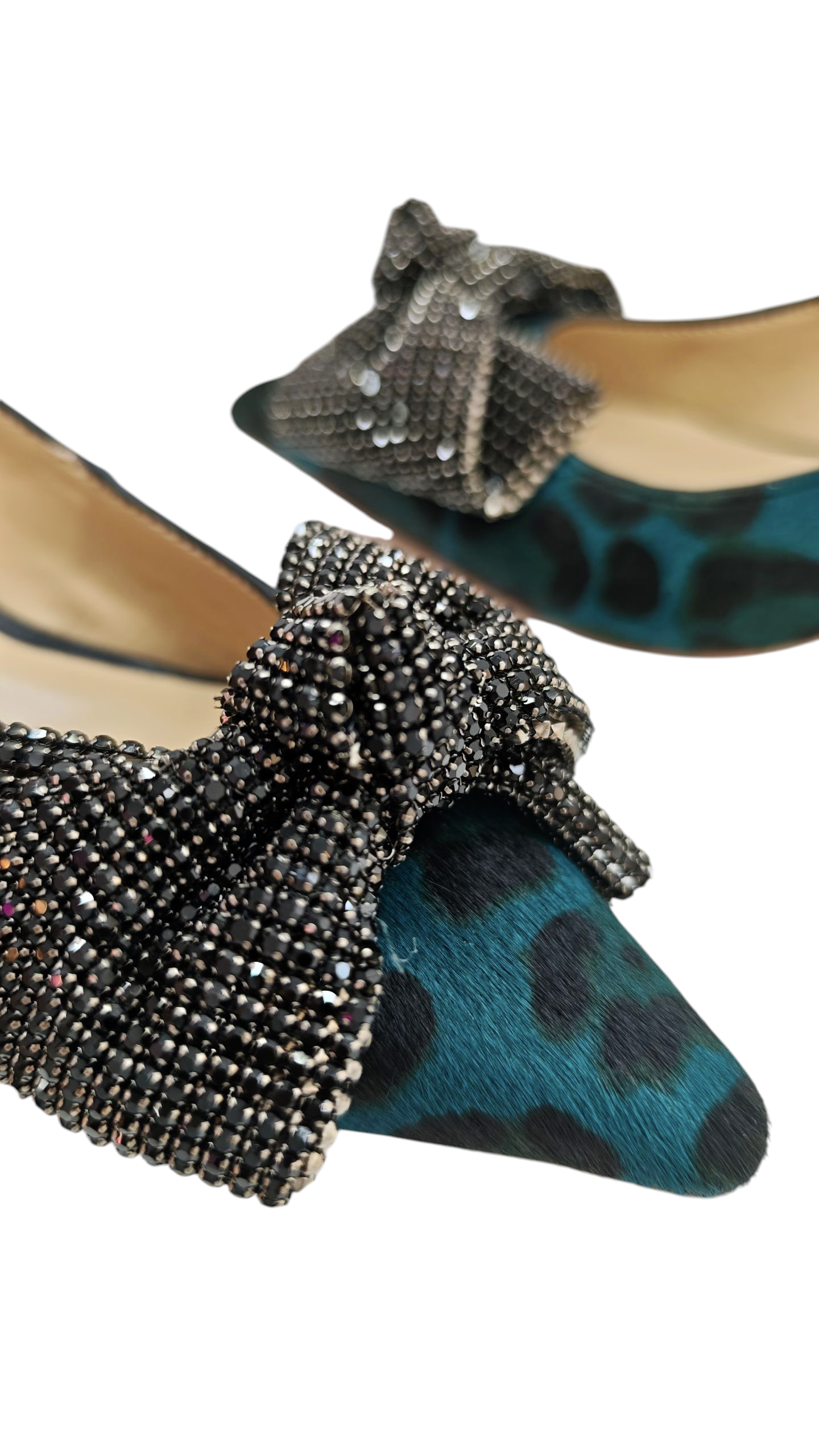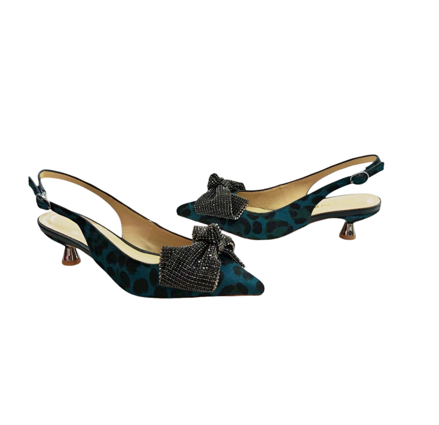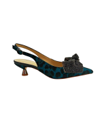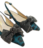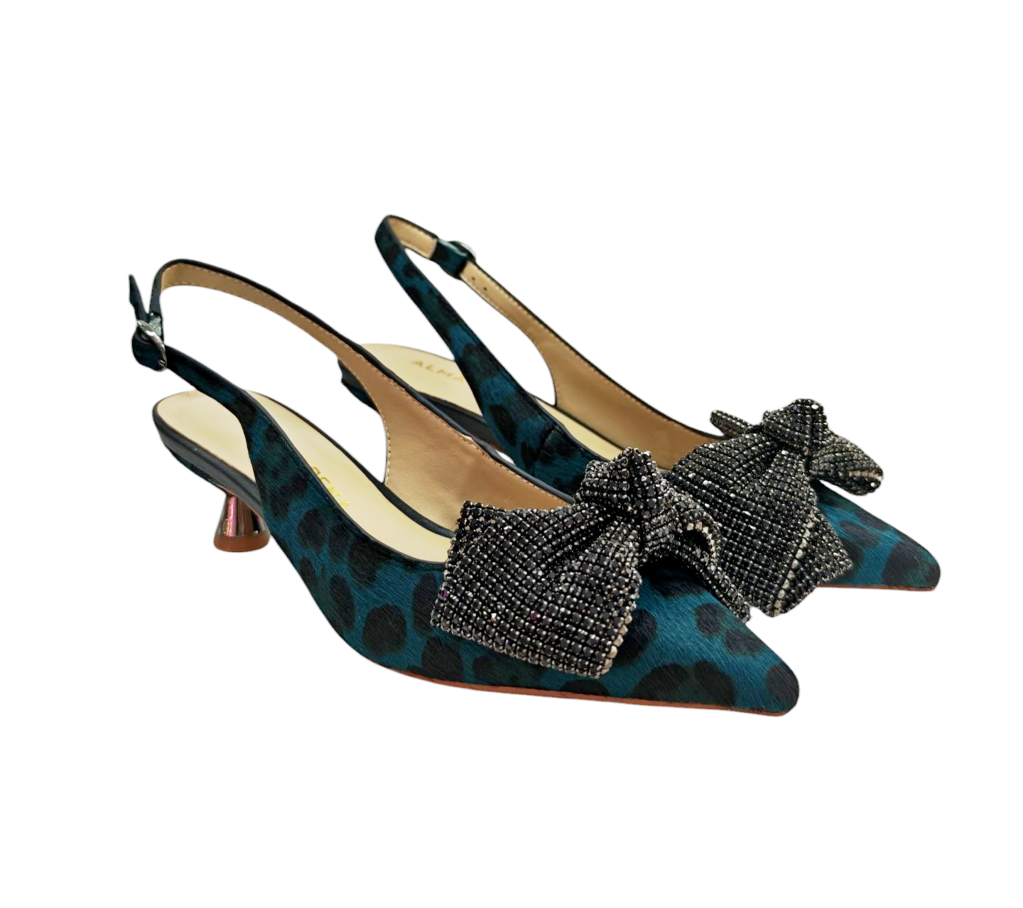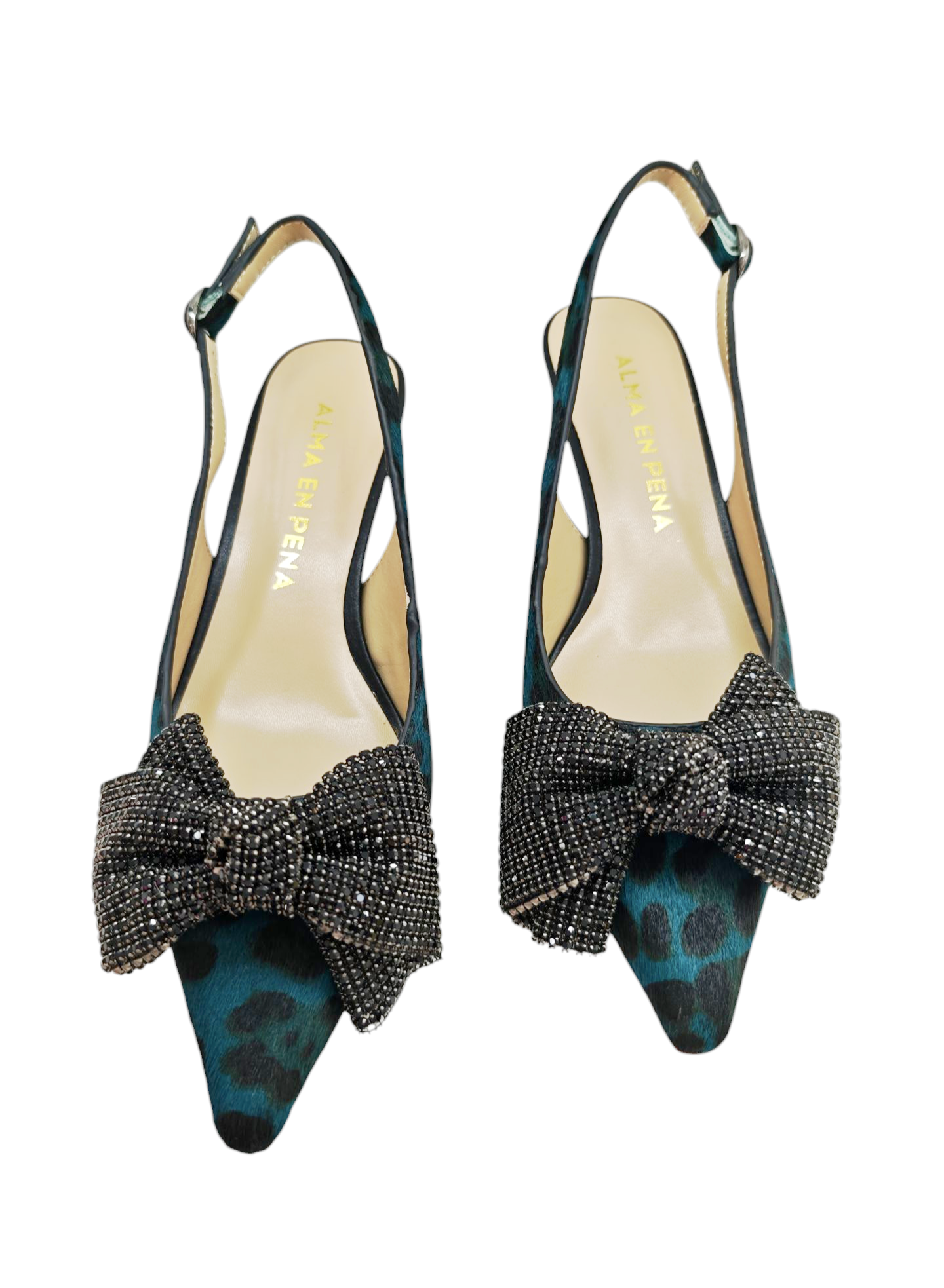 Este zapato no entiende de normas, entiende de actitud. Una mezcla explosiva de estampado , toques animal print y destellos  verdes que lo convierten en pura energía fashion, junto con su lazo plomo de brillos. Su tacón mini te da altura con comodidad.