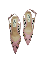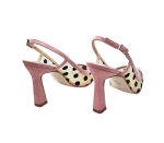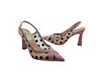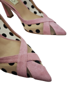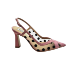 Este modelo de zapato de tacón slingback destaca por su diseño femenino y llamativo. Presenta una combinación de materiales translúcidos con un patrón de lunares negros sobre fondo nude, lo que le da un toque retro y elegante. Los bordes y la puntera están decorados con un acabado en gamuza rosa, aportando contraste y sofisticación. Su tacón medio-alto, con una forma estructurada y moderna, brinda comodidad sin perder estilo. Ideal para ocasiones especiales o para añadir un toque divertido y refinado a cualquier look.