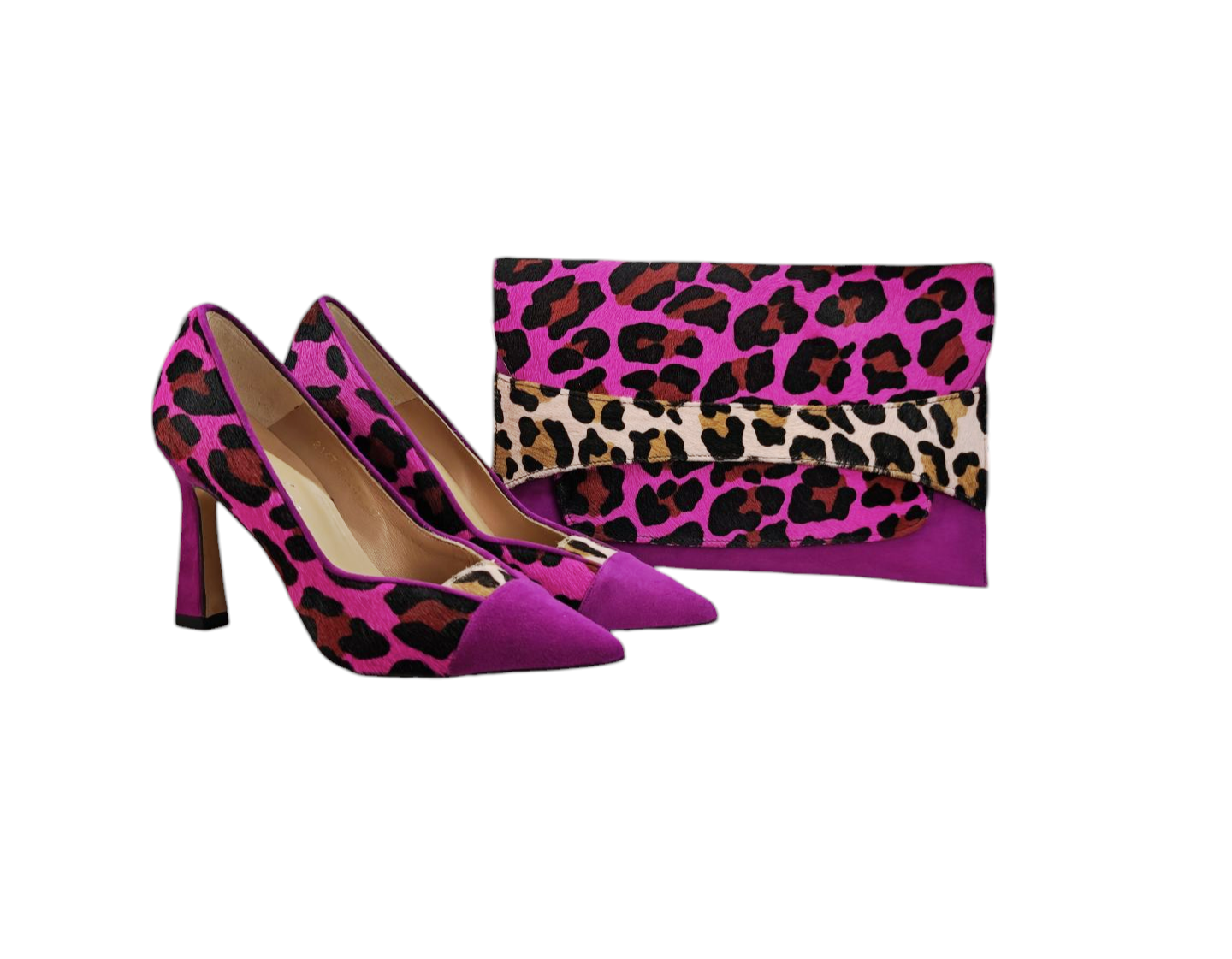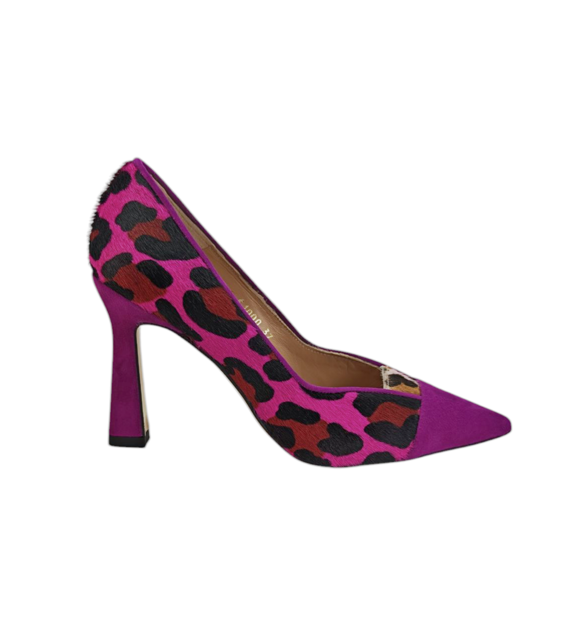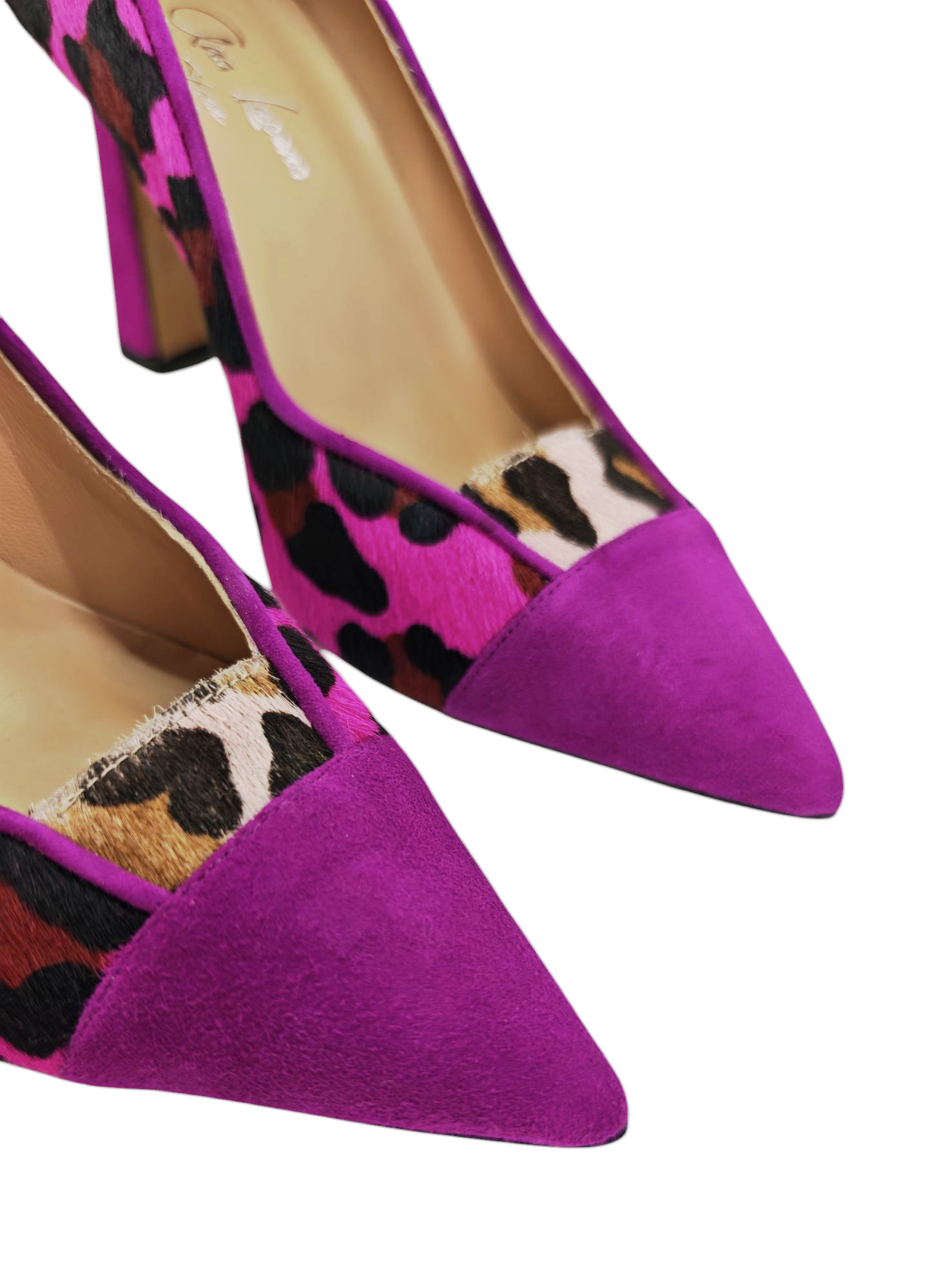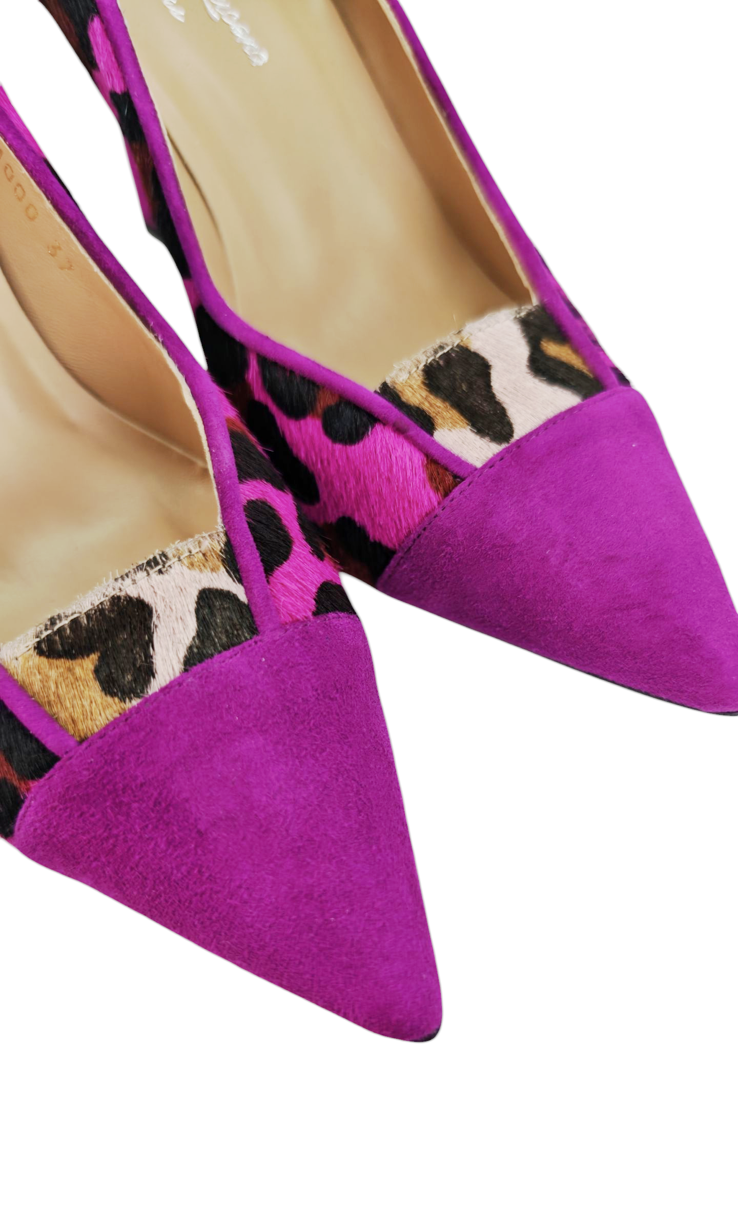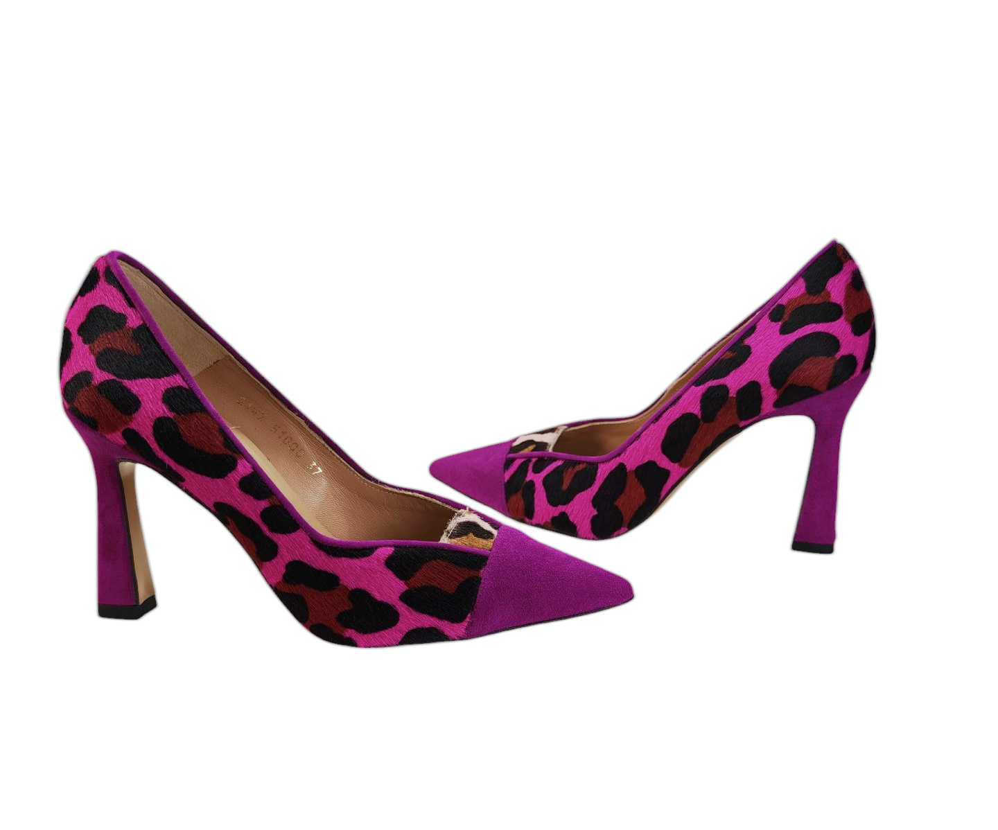 Este salón es puro fuego y actitud. 💖🔥 Su fucsia vibrante combinado con estampado animal print en pelo es la mezcla perfecta entre glamour salvaje y sofisticación extrema. Tacón alto y punta afilada para estilizar al máximo, pensado para mujeres que no temen ser el centro de todas las miradas. Porque con estos zapatos… imposible pasar desapercibida. 🐆✨