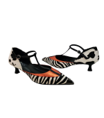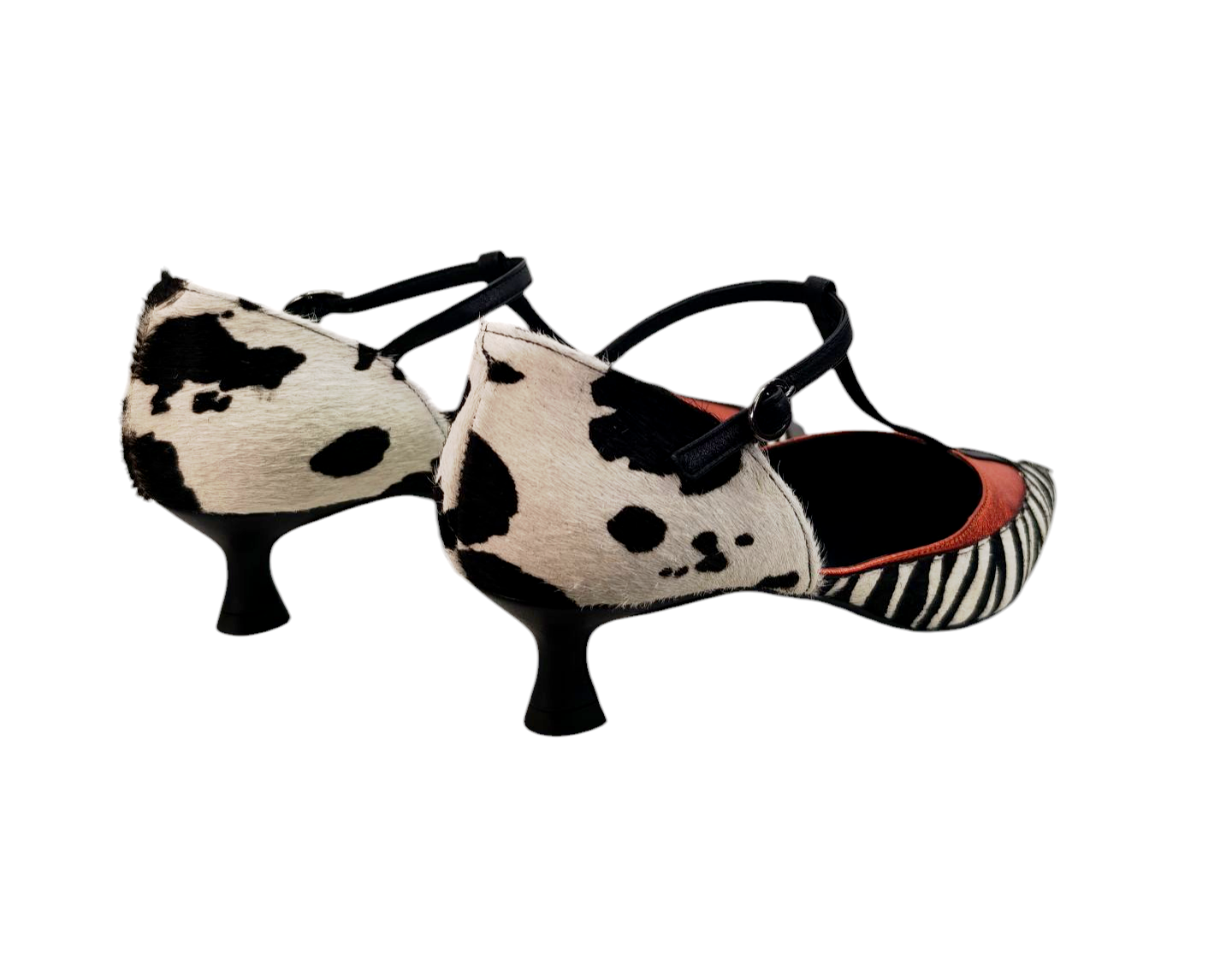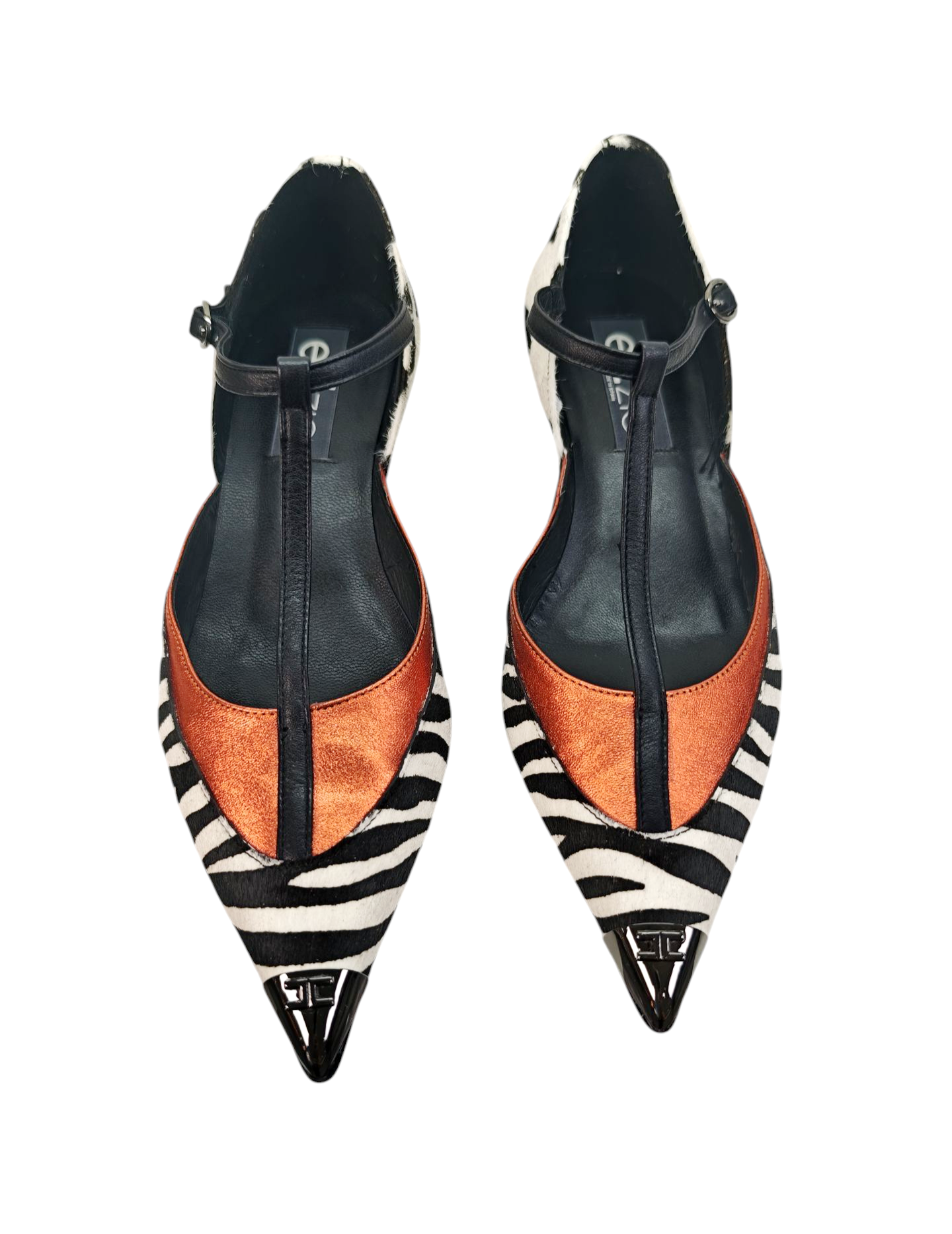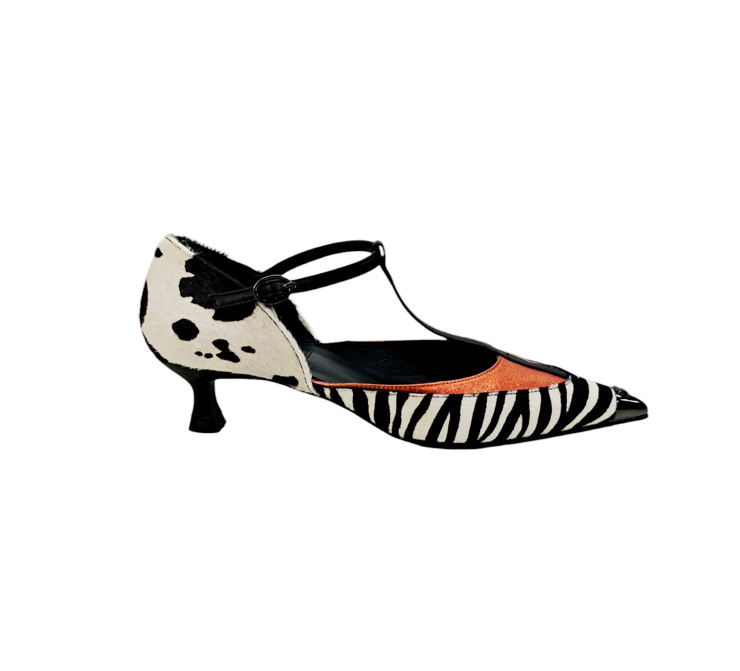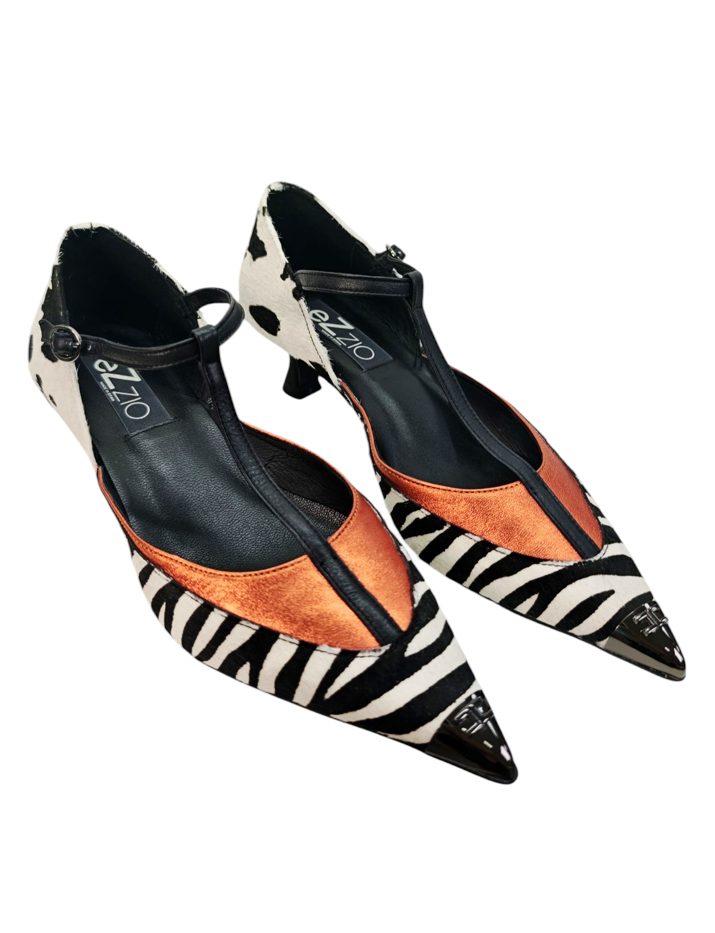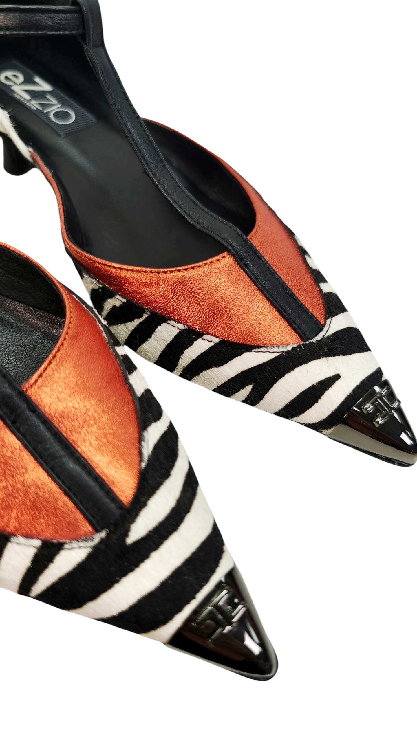 Este zapato no entiende de normas, entiende de actitud. Una mezcla explosiva de estampado cebra, toques animal print y destellos naranjas metalizados que lo convierten en pura energía fashion. Su tacón mini te da altura con comodidad, mientras la pulsera al tobillo aporta ese toque elegante pero rebelde que rompe esquemas.