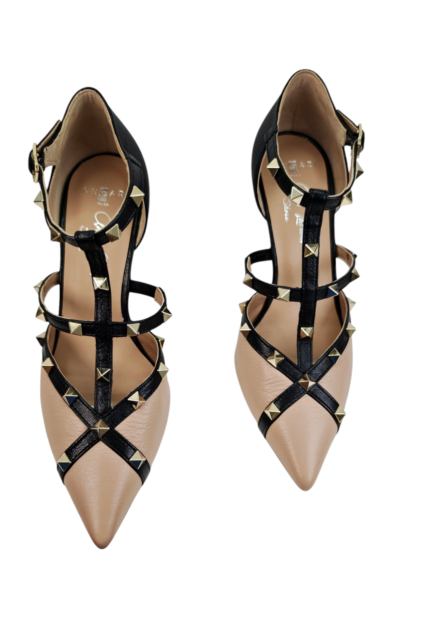 Este elegante zapato de tacón combina estilo retro con detalles modernos, tipo valentino en tono piel y Negro, con adornos en oro que hacen de este modelo, un súper zapato