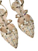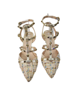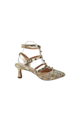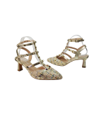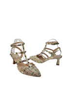 Este elegante zapato de tacón medio combina estilo retro con detalles modernos, tipo valentino con un entelado con adornos en oro que hacen de este modelo, un súpero zapato
