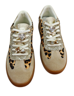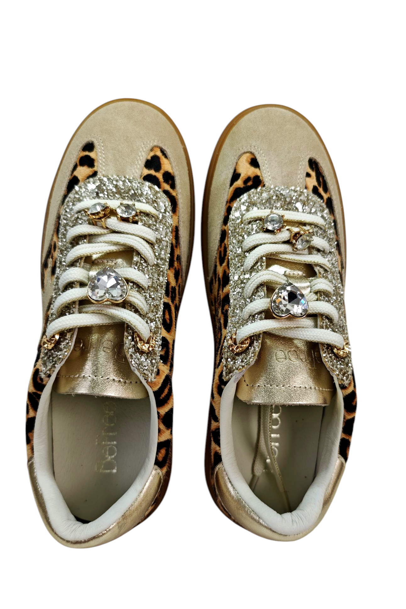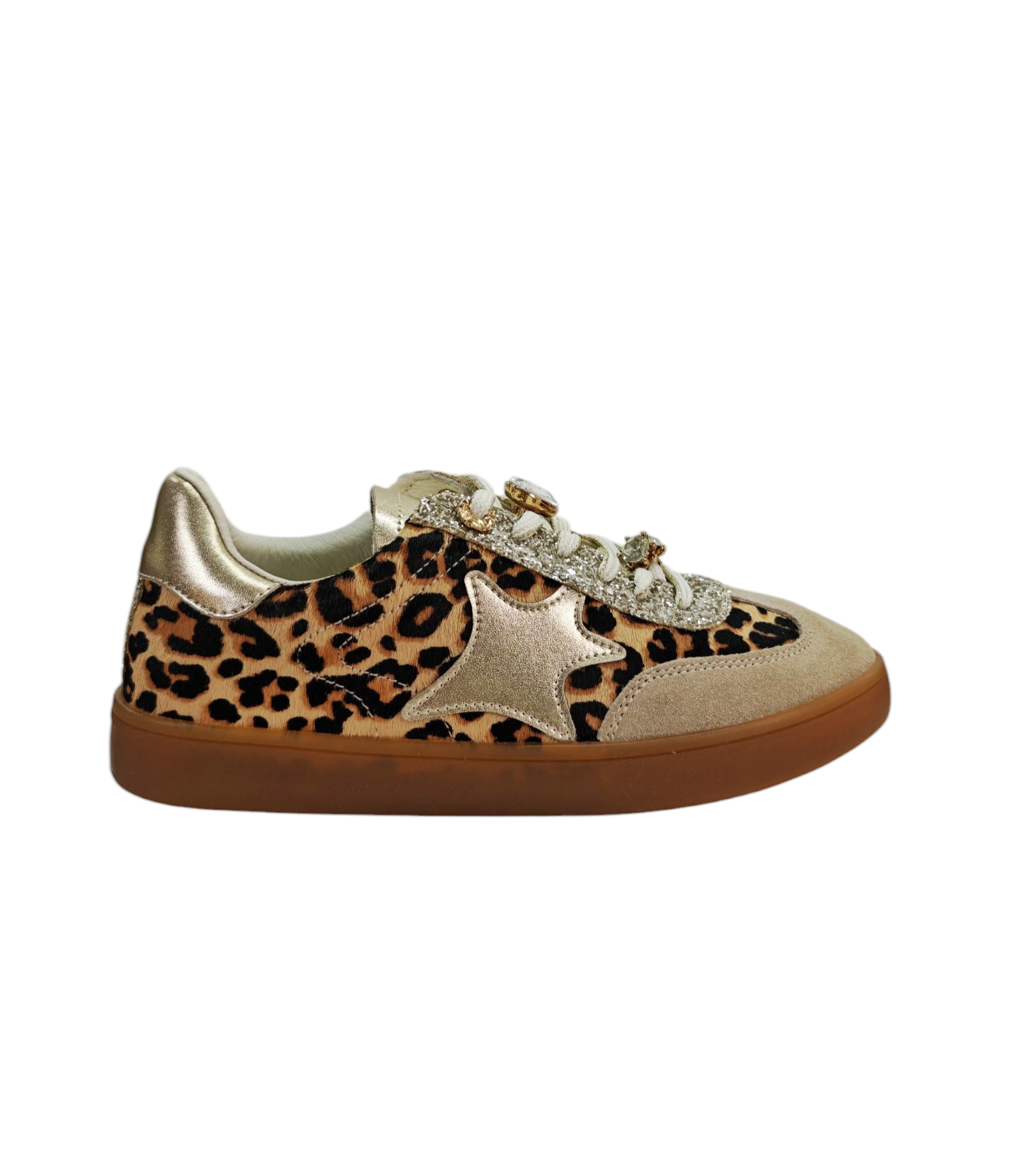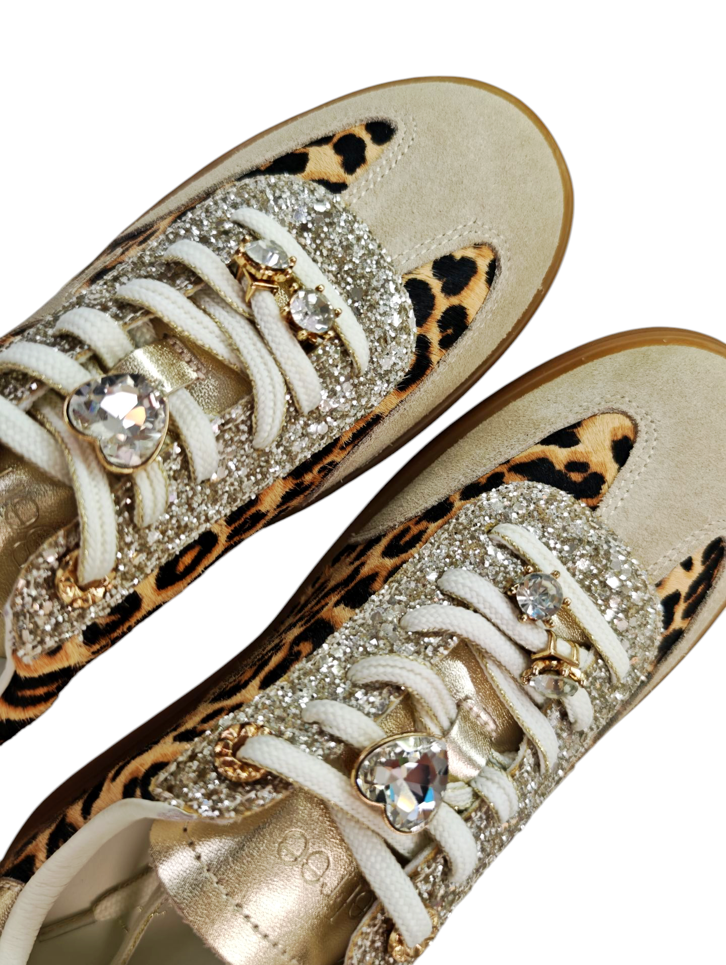 Atrévete a brillar con estos sneakers salvajes & glam. El animal print en leopardo se une al dorado metalizado y al glitter para crear un combo explosivo que grita poder femenino y actitud sin filtros. Los maxi-brillos en los cordones ponen la guinda perfecta para que cada paso sea un auténtico show.