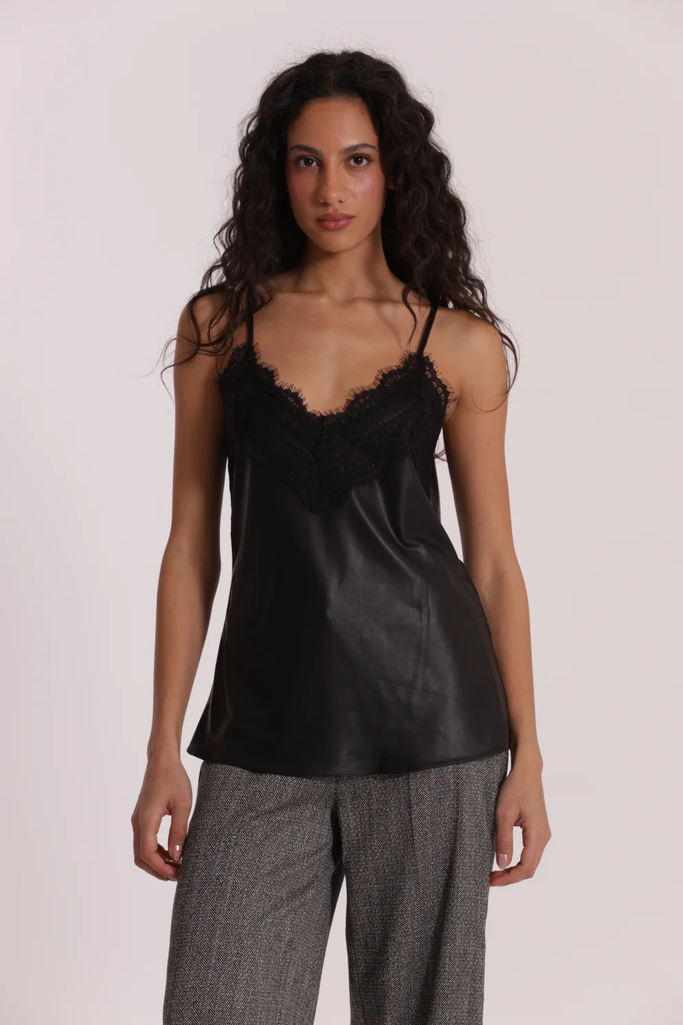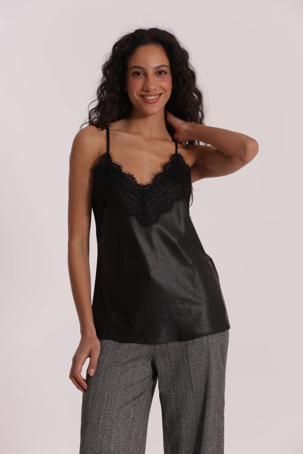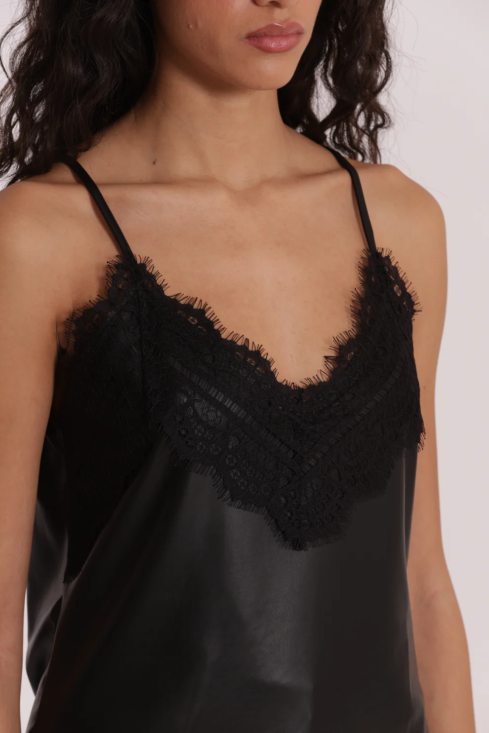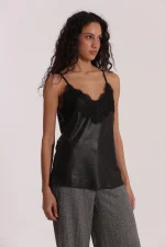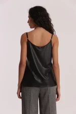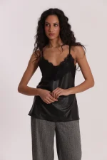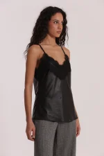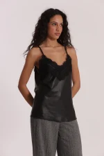 Top lencero en color negro, efecto piel y escote con detalle en encaje, ideal para darle un toque muy cañero a tus looks.