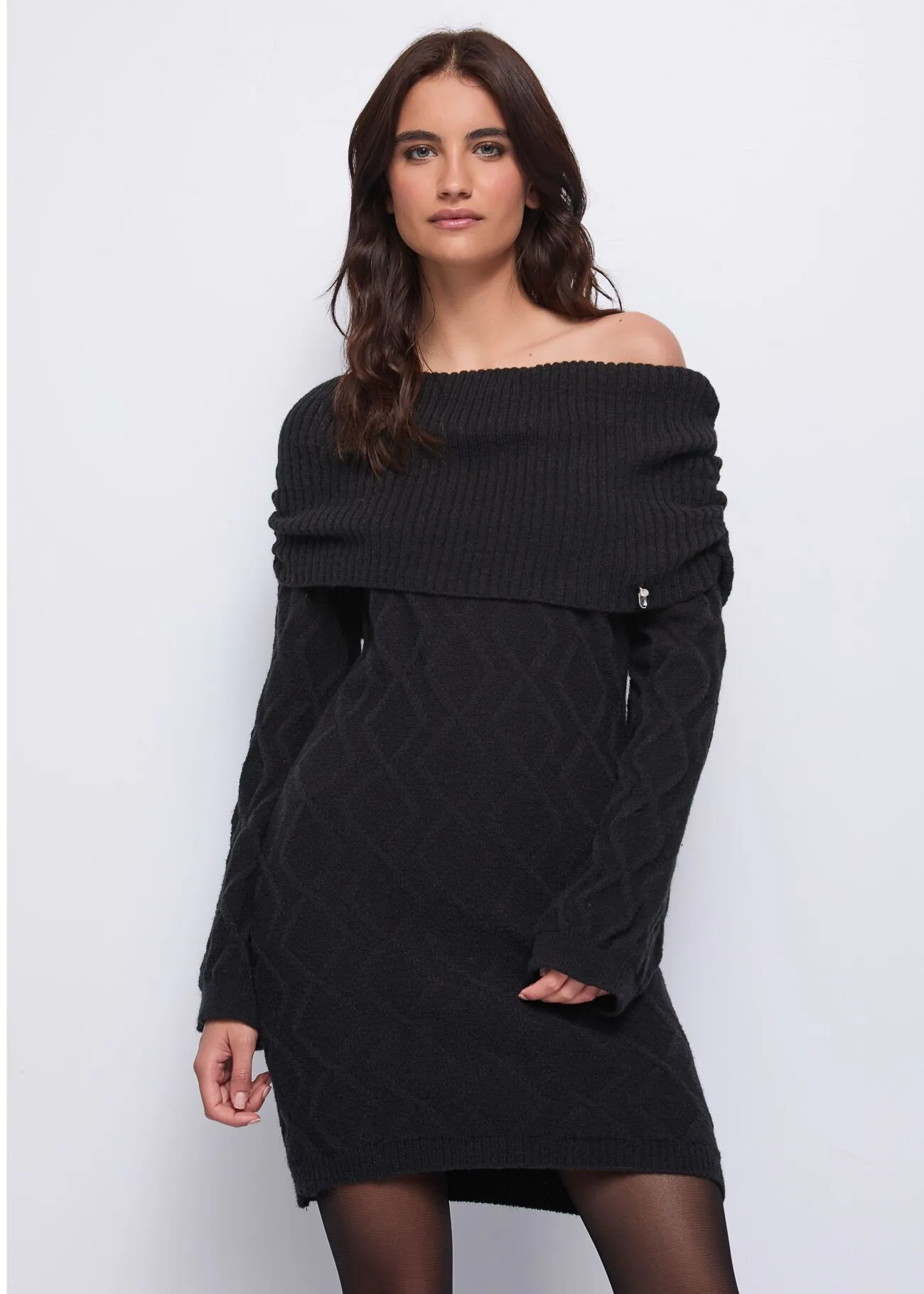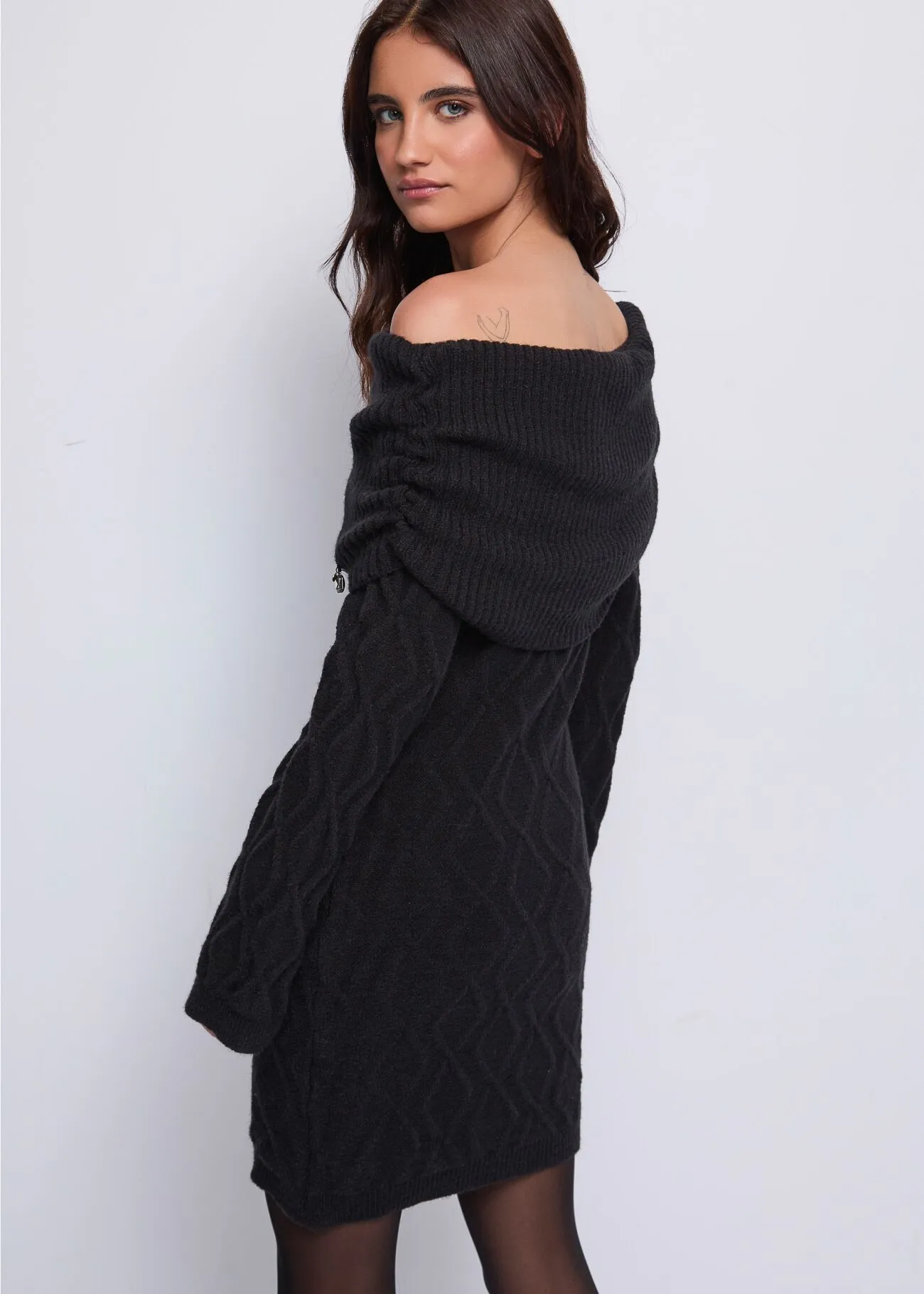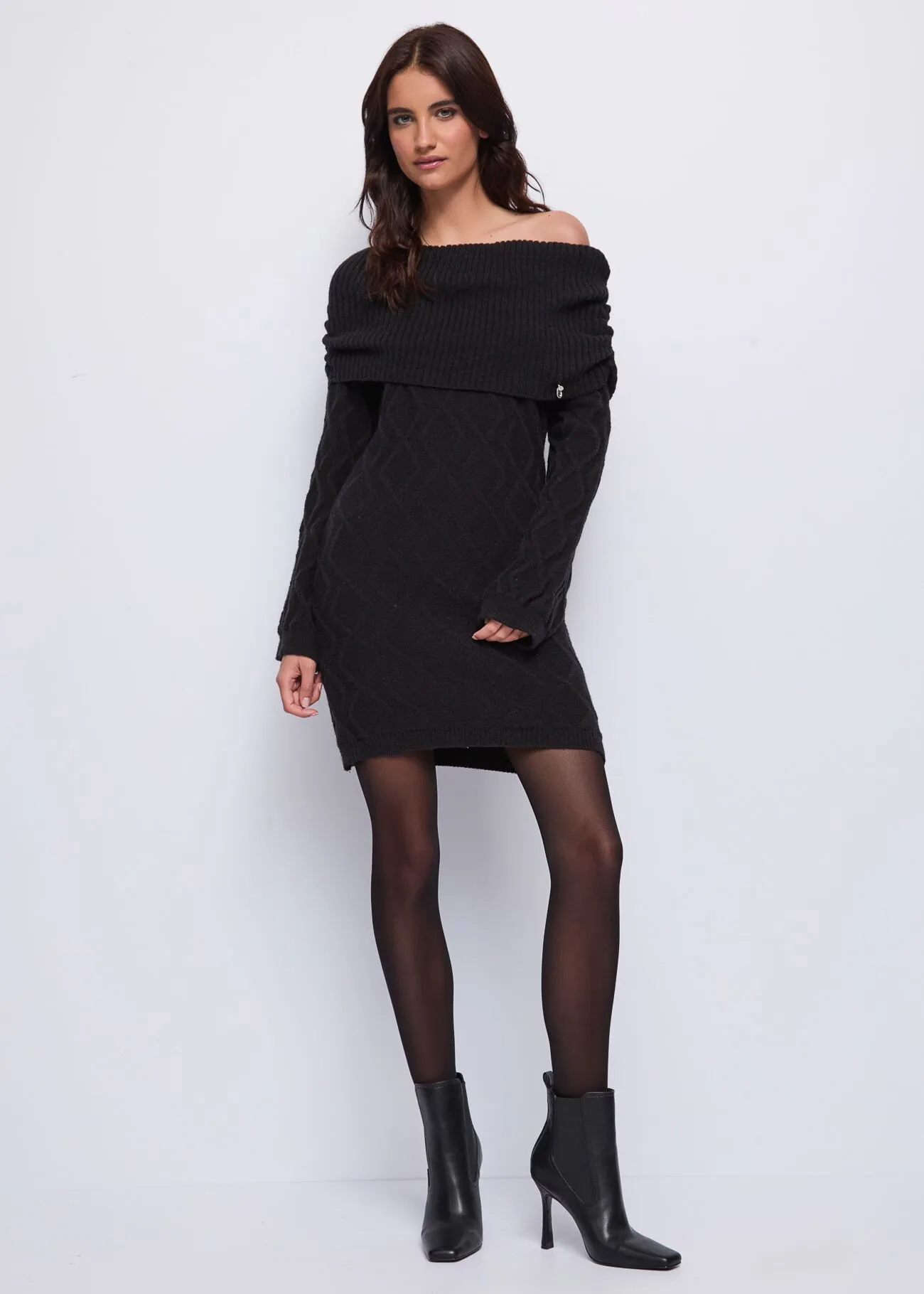Minivestido de mezcla de lana y escote con hombros descubiertos y puños de canalé maxi.
