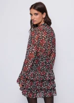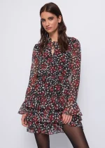 Minivestido de georgette con estampado integral de estrellas, cuello en V con cierre de lazo, mangas largas y puños acampanados, cintura elástica y falda con volantes.