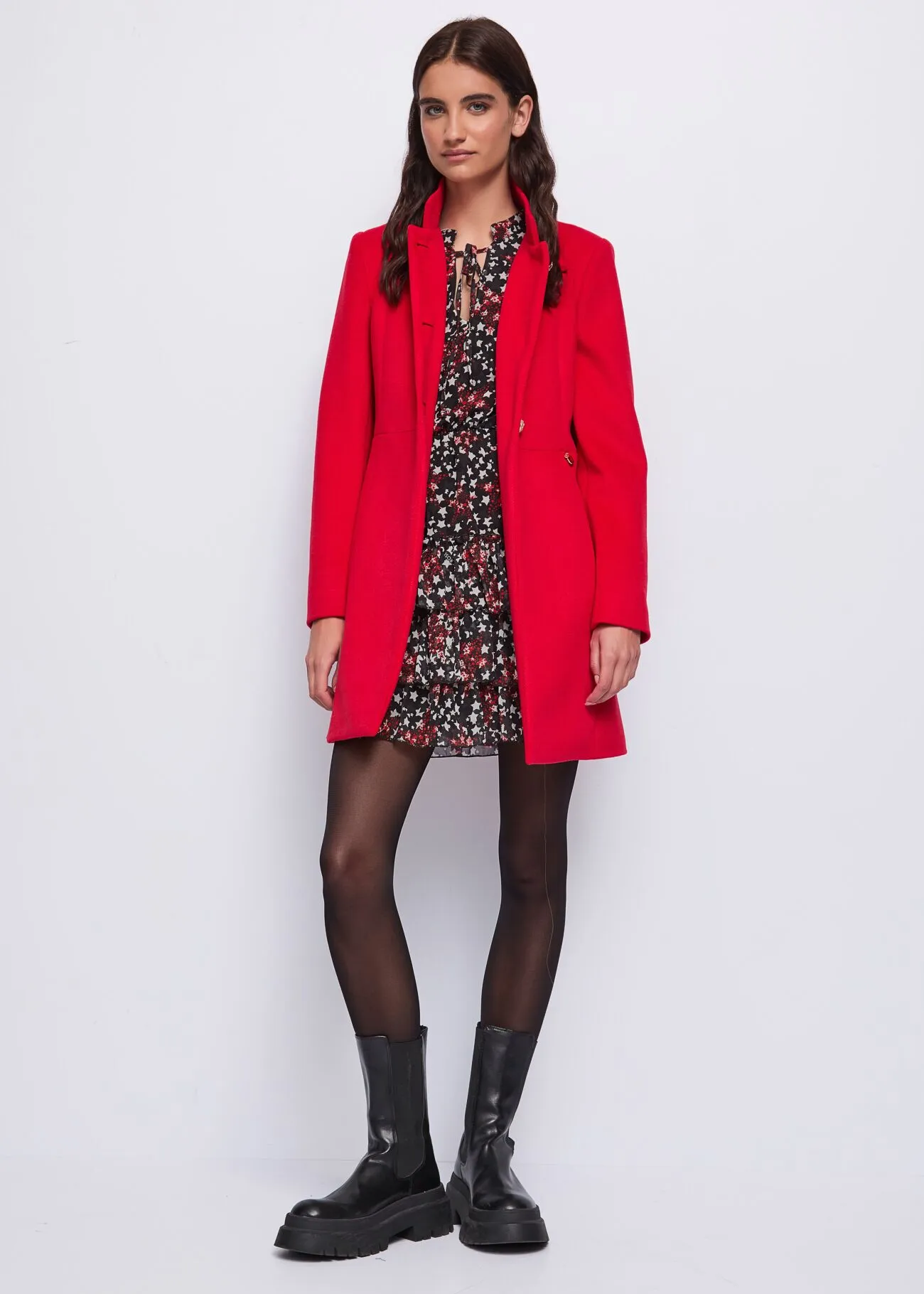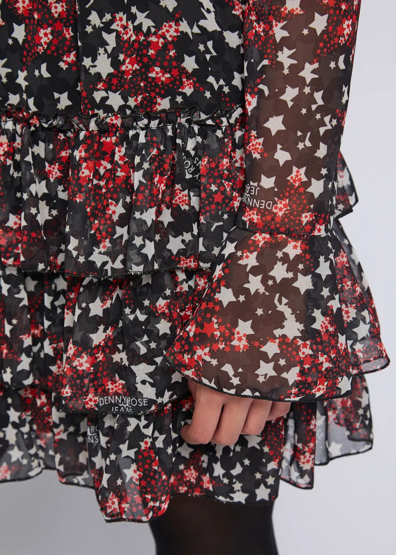 Minivestido de georgette con estampado integral de estrellas, cuello en V con cierre de lazo, mangas largas y puños acampanados, cintura elástica y falda con volantes.